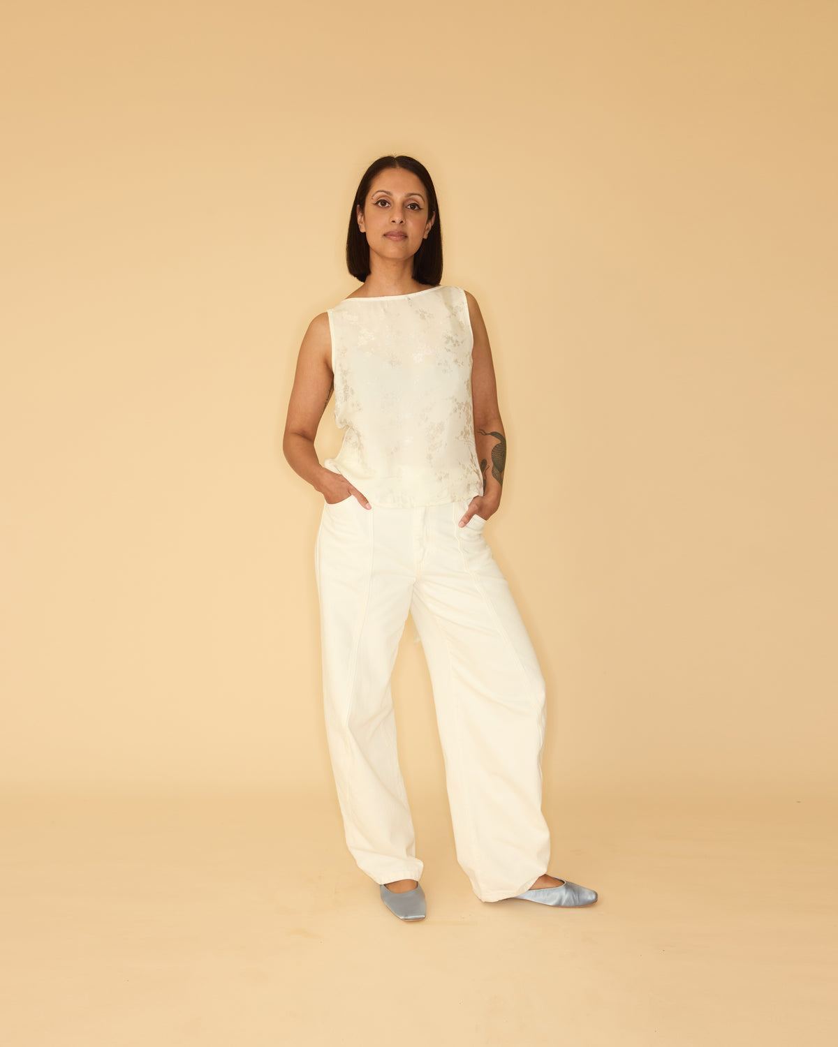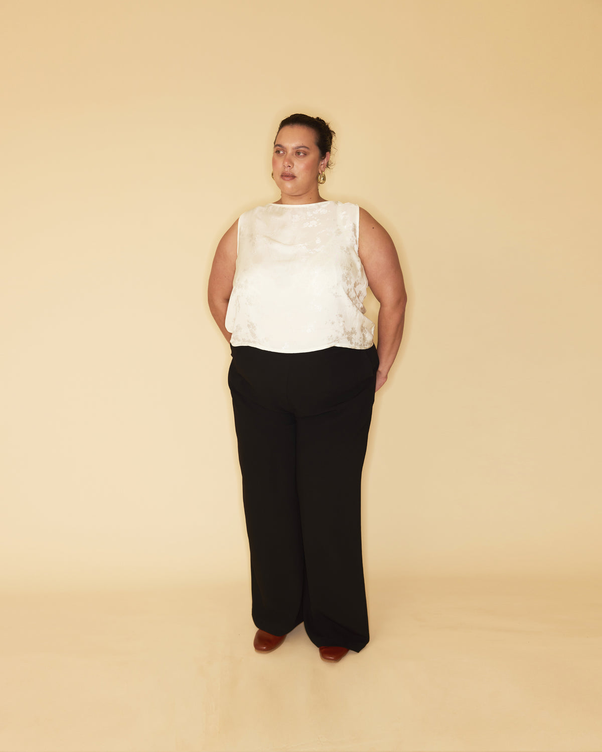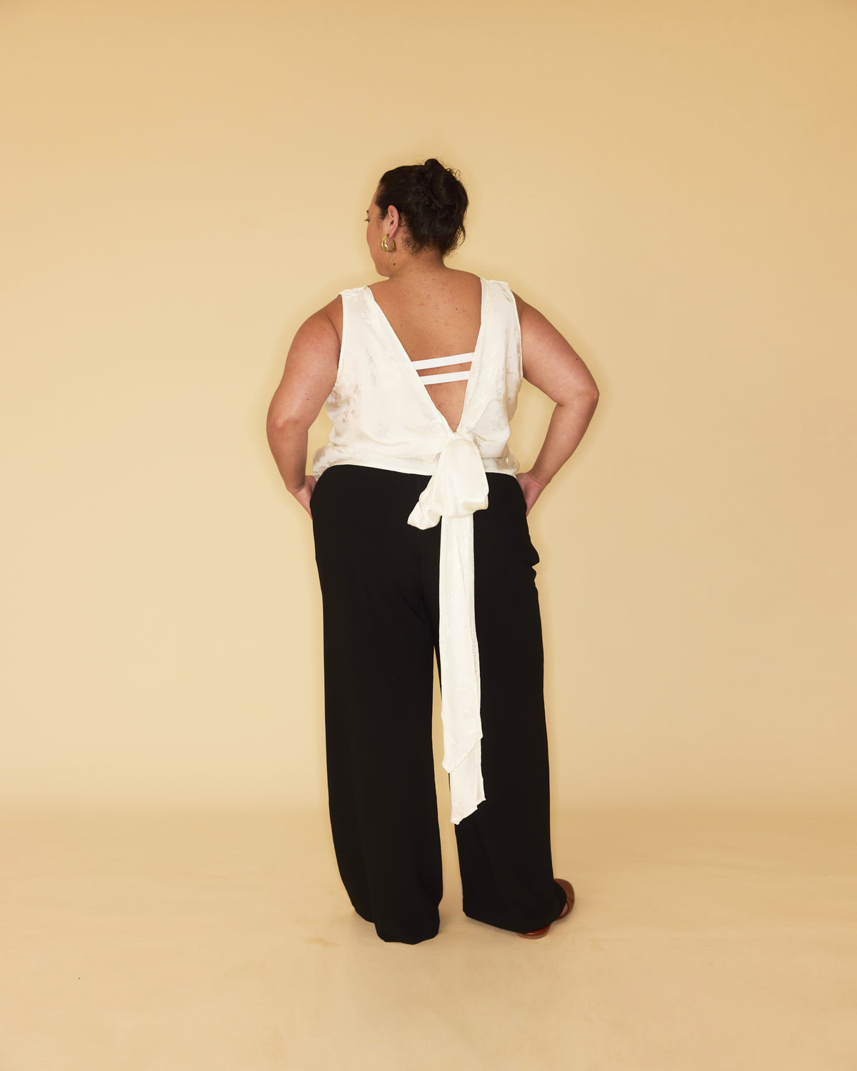 Liz is a relaxed fit sleeveless top with a wrap feature, accentuated with long waist ties that can be tied around the body or at the back in a bow. Imagined in a sheeny jacquard satin, when this fabric catches the light it reveals the delicate cherry blossom floral.