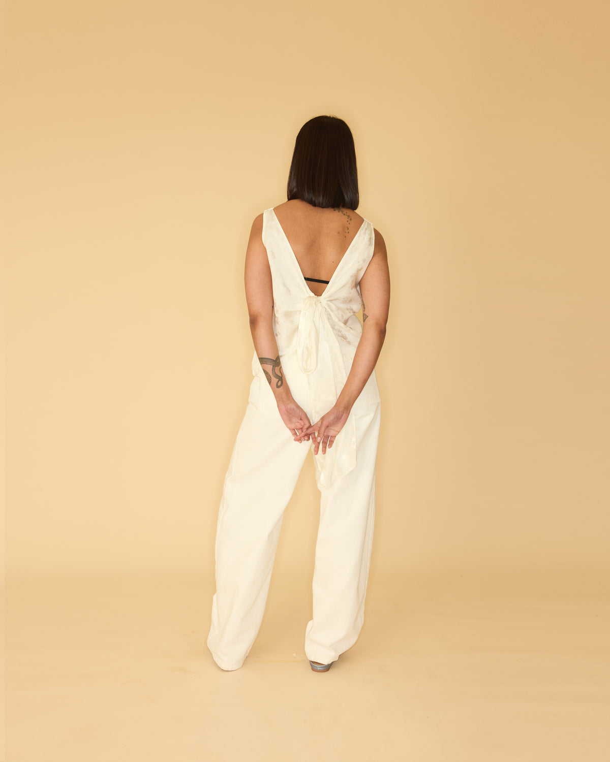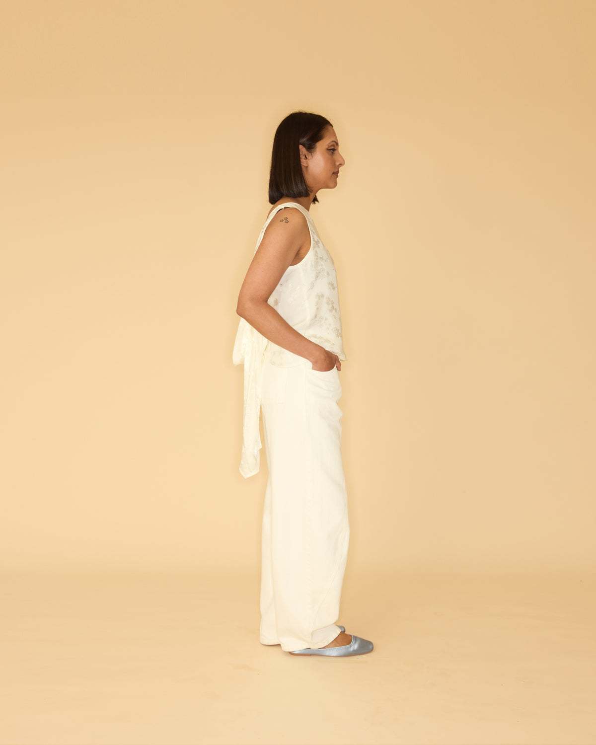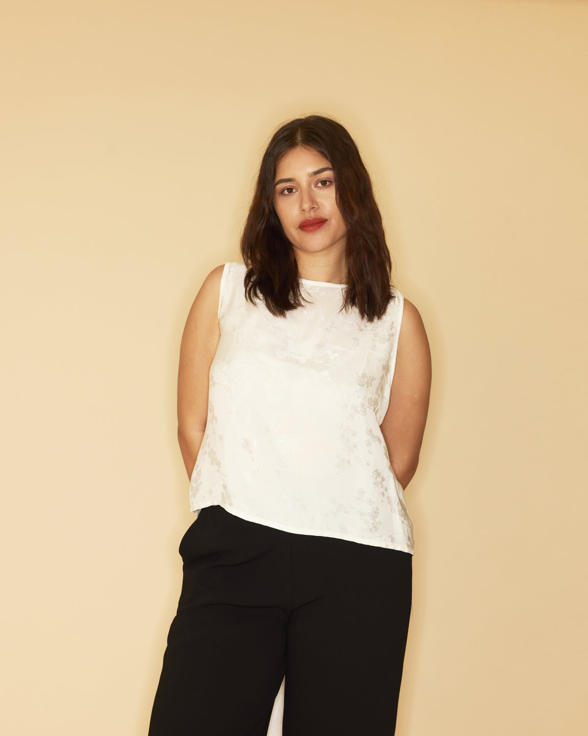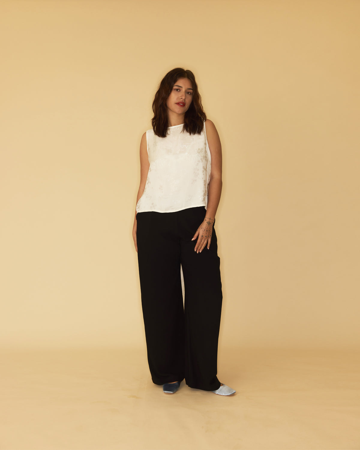 Liz is a relaxed fit sleeveless top with a wrap feature, accentuated with long waist ties that can be tied around the body or at the back in a bow. Imagined in a sheeny jacquard satin, when this fabric catches the light it reveals the delicate cherry blossom floral.