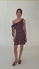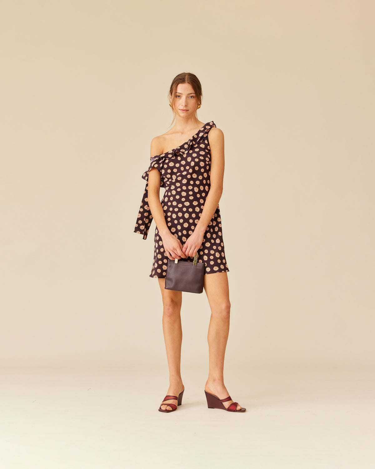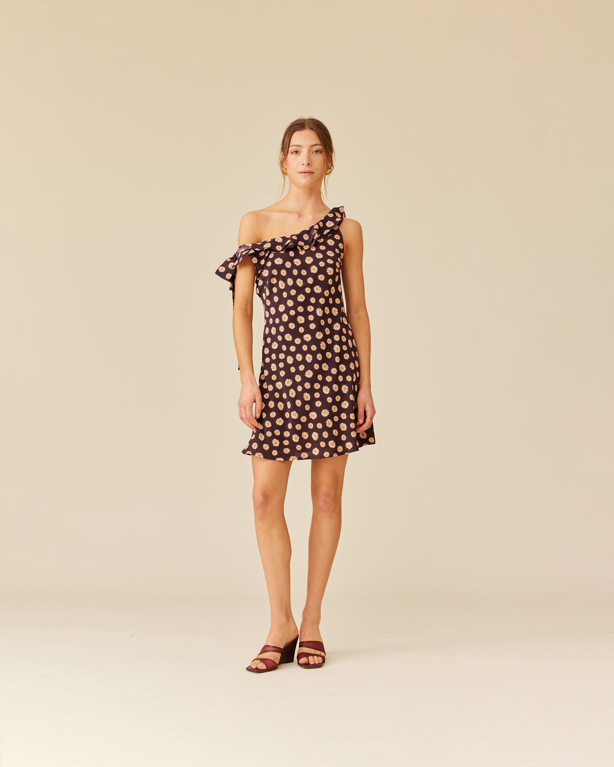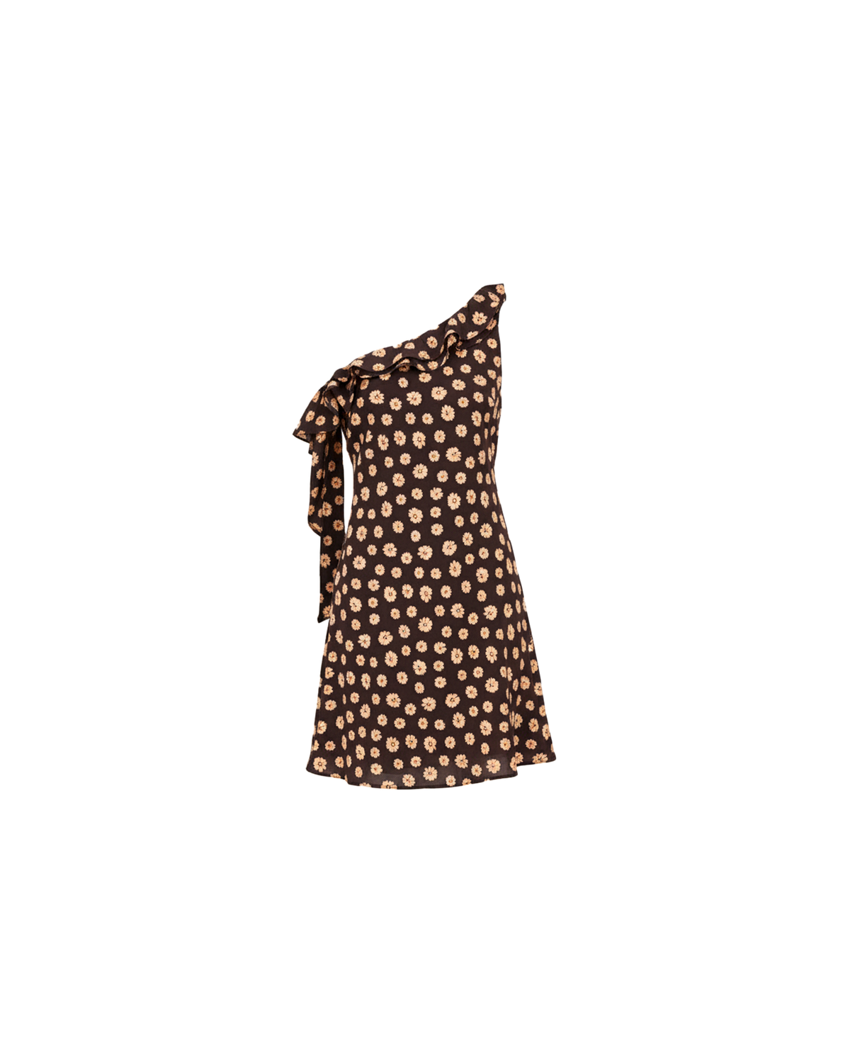 Bias cut mini dress designed in our brown ditzy floral. Features a ruffled neckline and tie-up straps for an asymmetrical look.