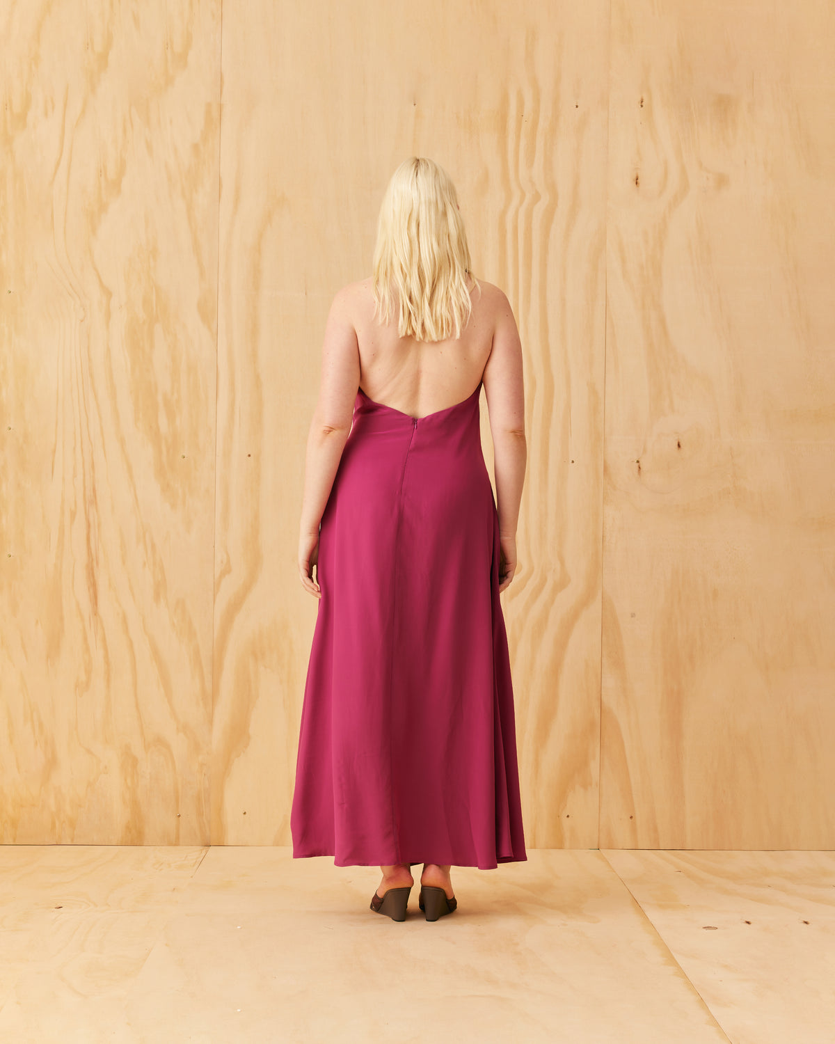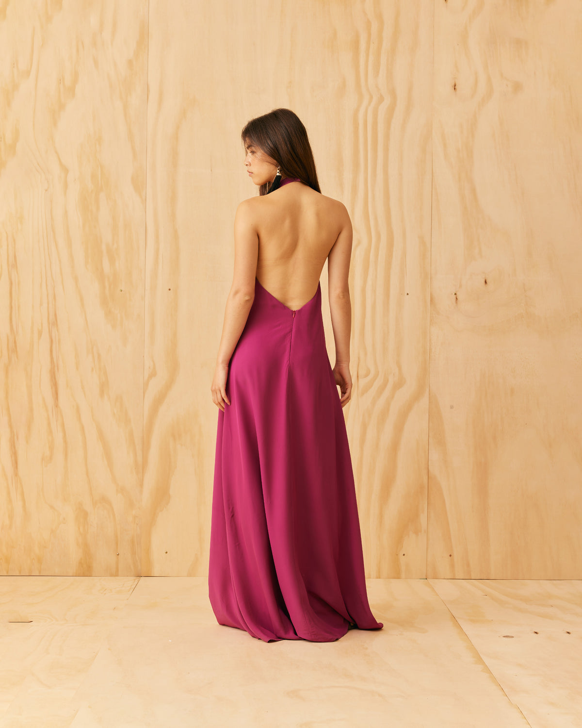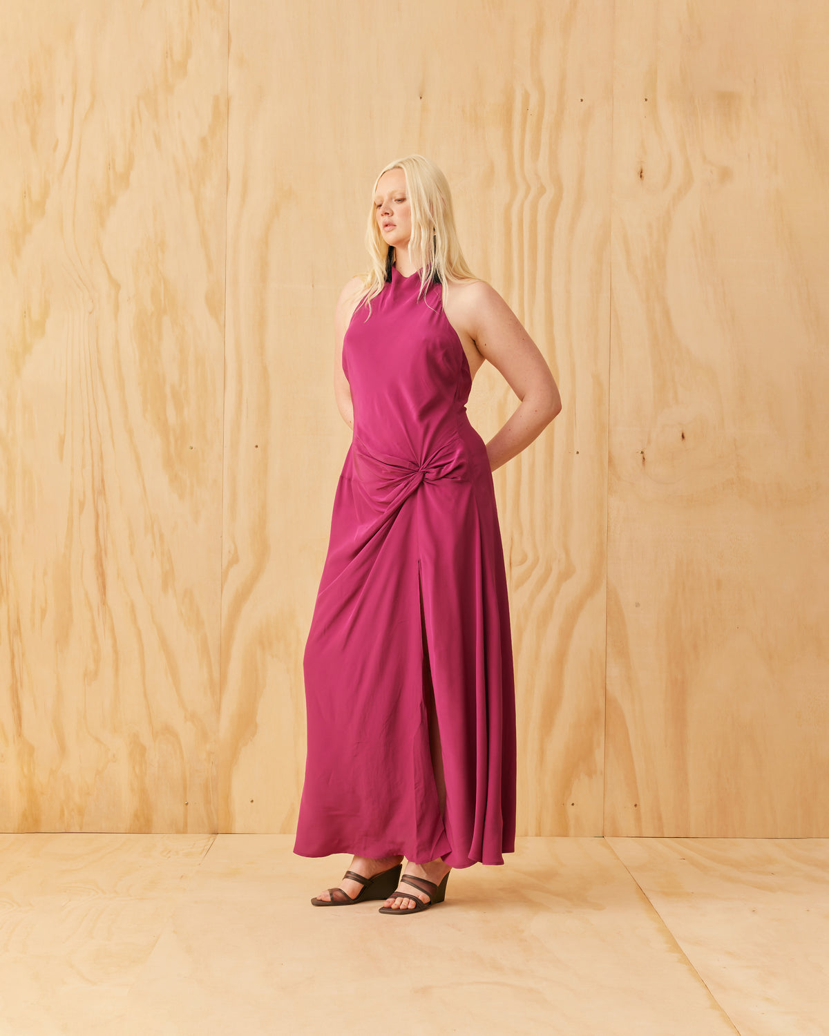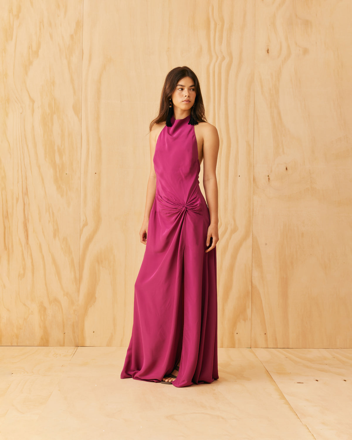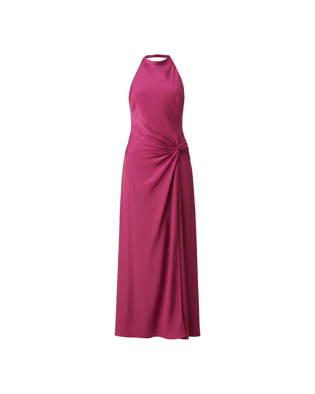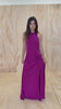 Halter dress designed in a vibrant magenta viscose. Featuring a waist tie gather, open back and side split, this dress is perfect for any formal occasion.
