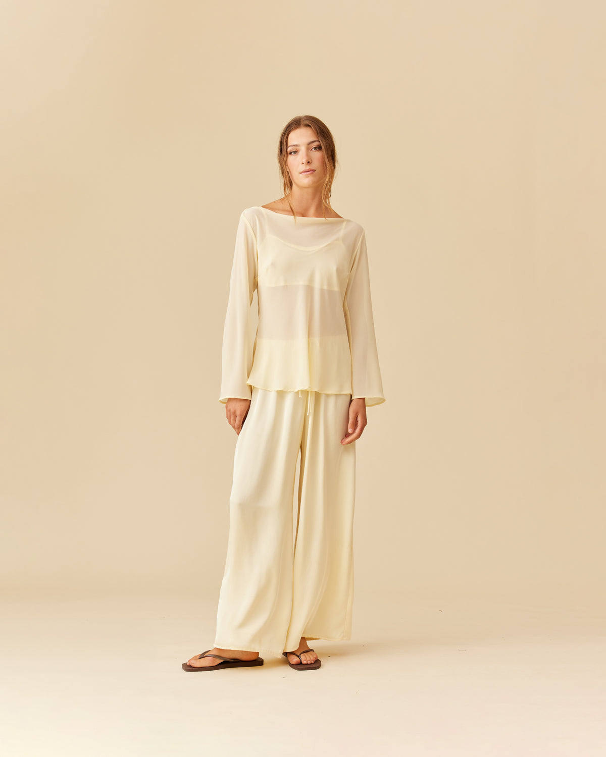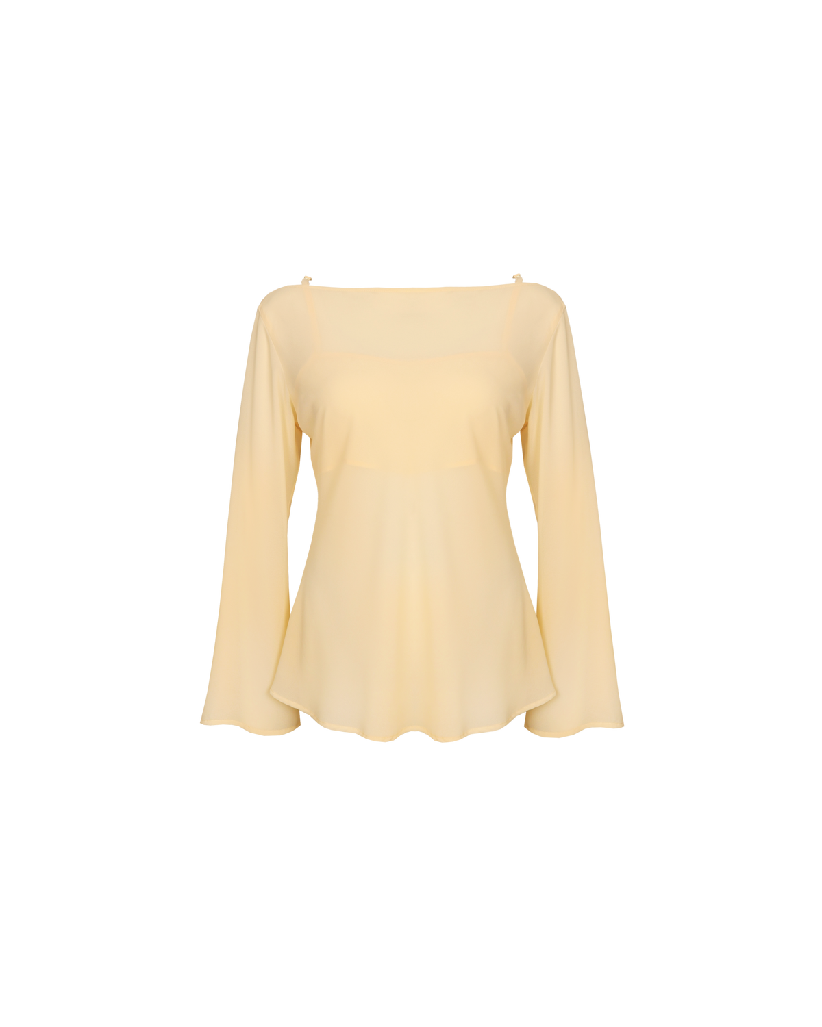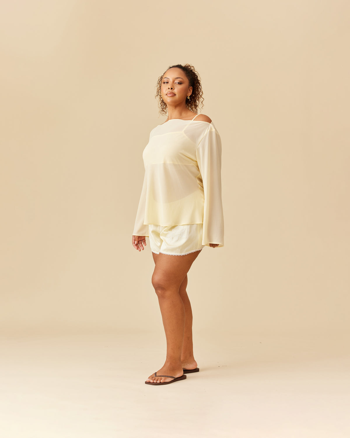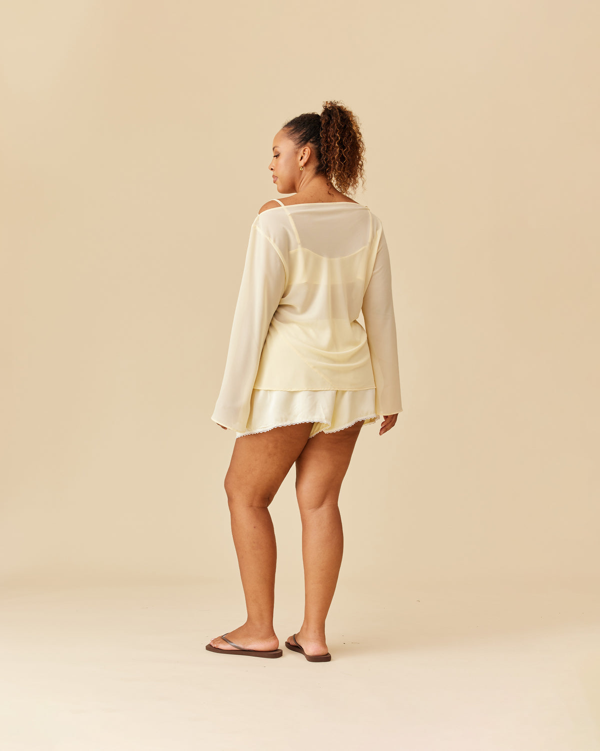 Long sleeve blouse designed in a sheer butter chiffon. Featuring a built in sheer bust panel with adjustable straps, and a soft cowl neckline that can be worn on or off the shoulder. Make it a set with our Halo Short or Andie Satin Pant.