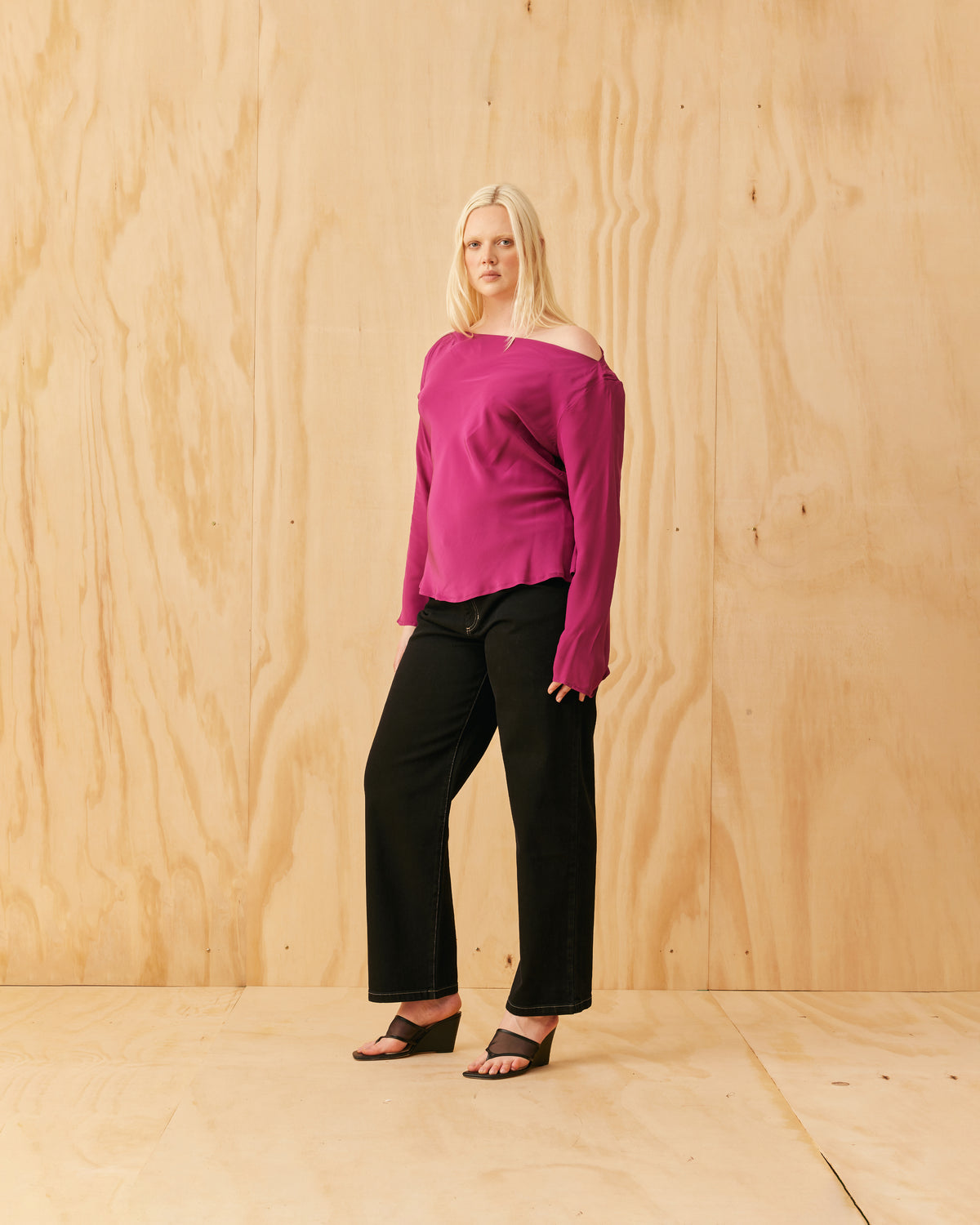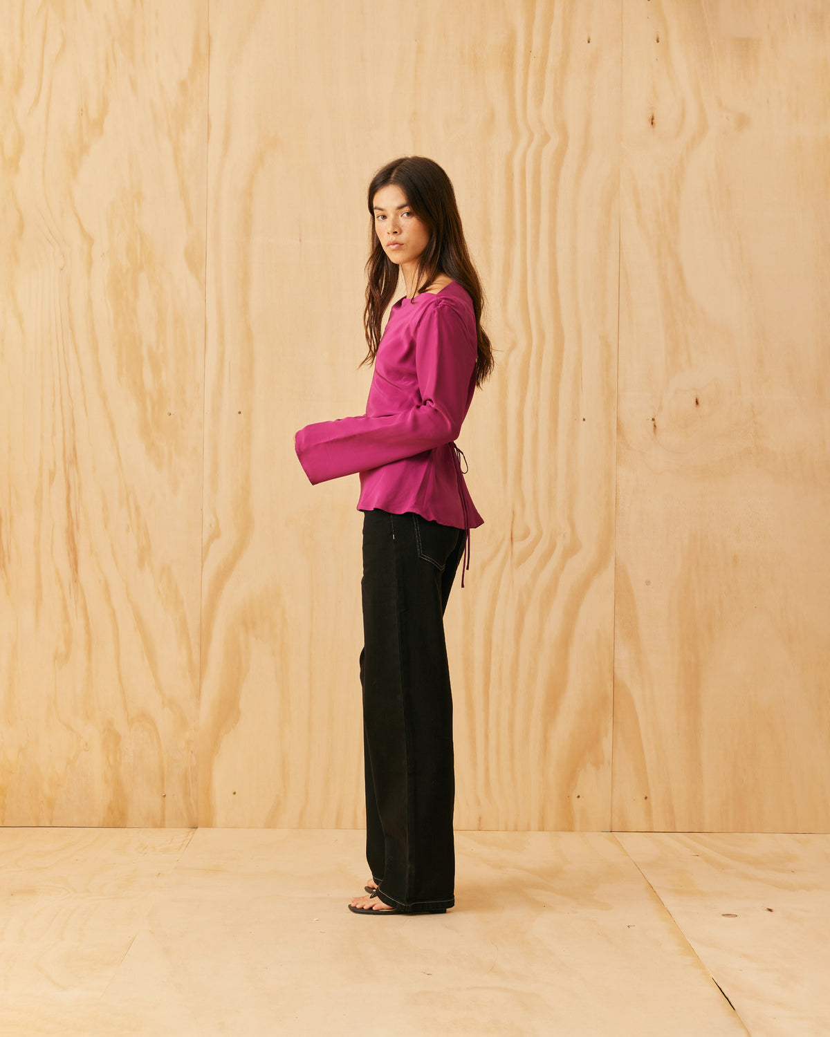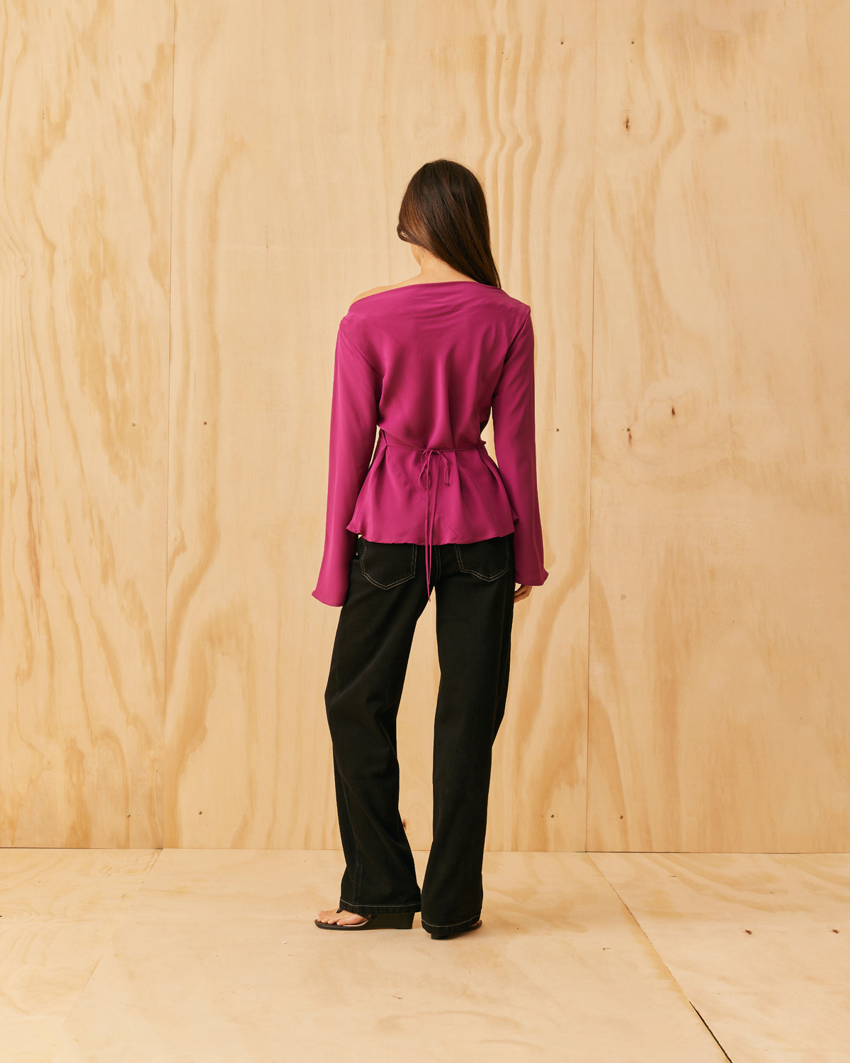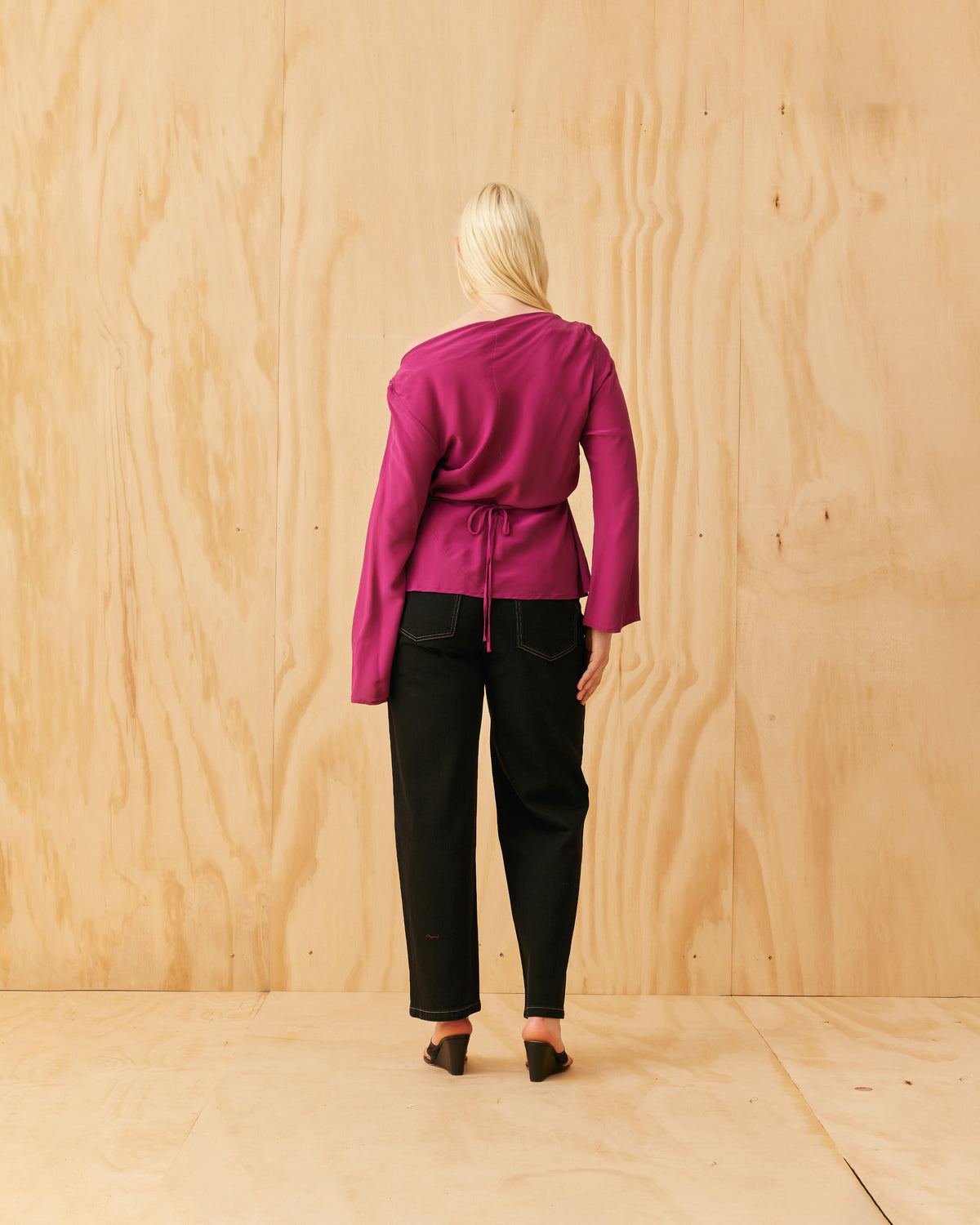Long sleeve blouse designed in a vibrant magenta viscose. This blouse features a tie at the waist and a soft cowl at the neckline, that allows you to wear this on or off the shoulder.