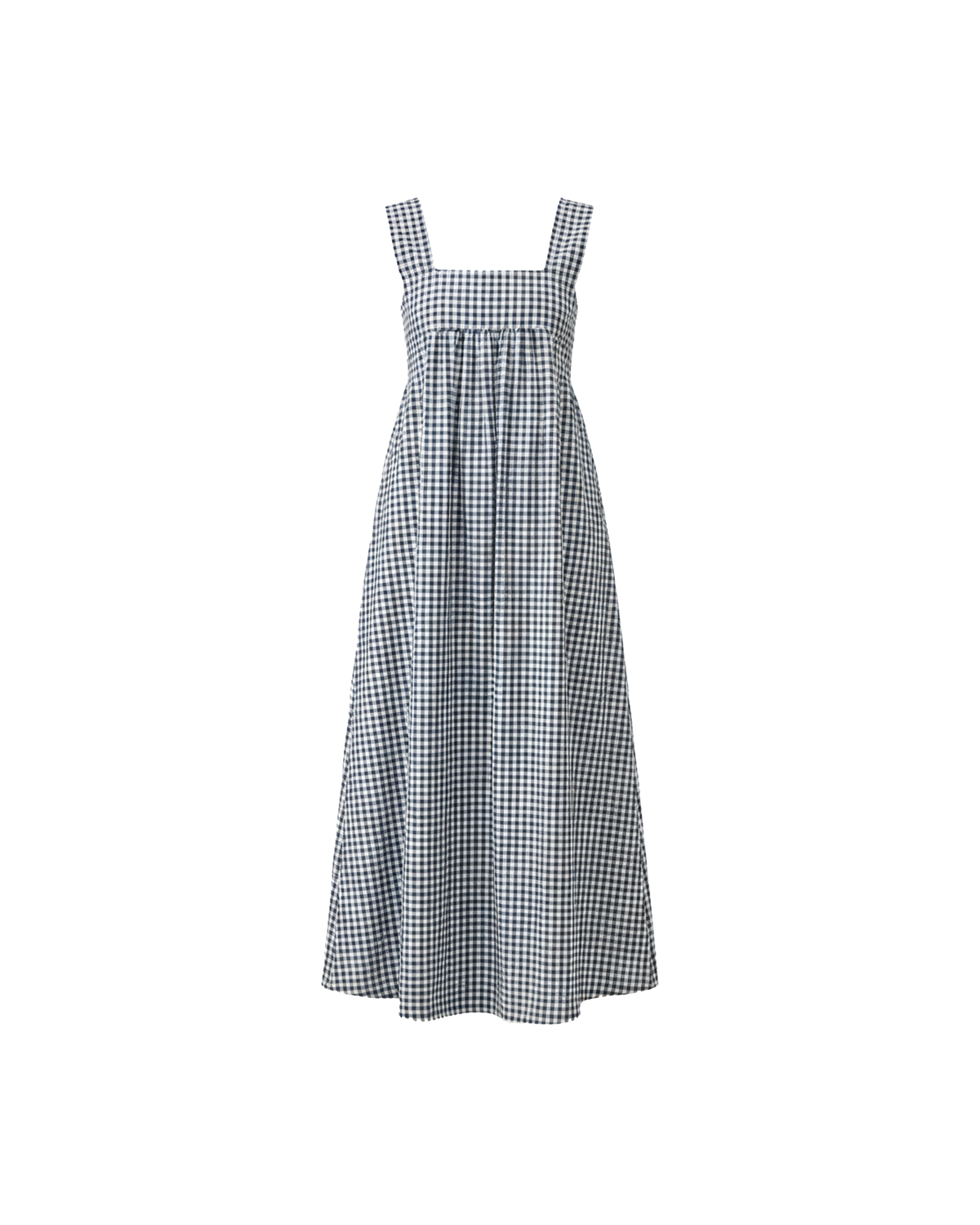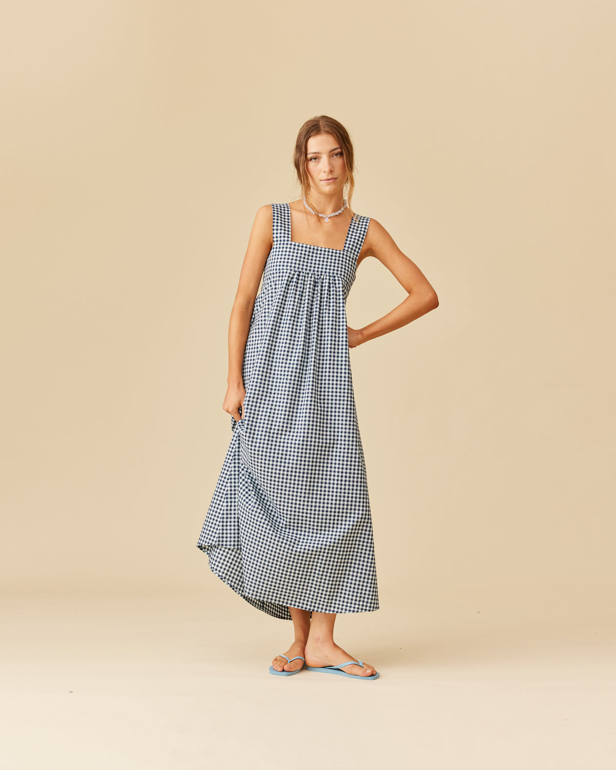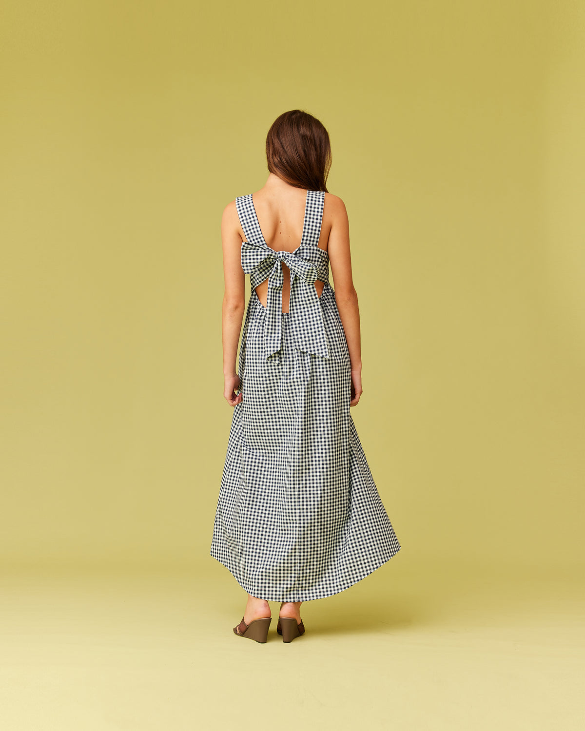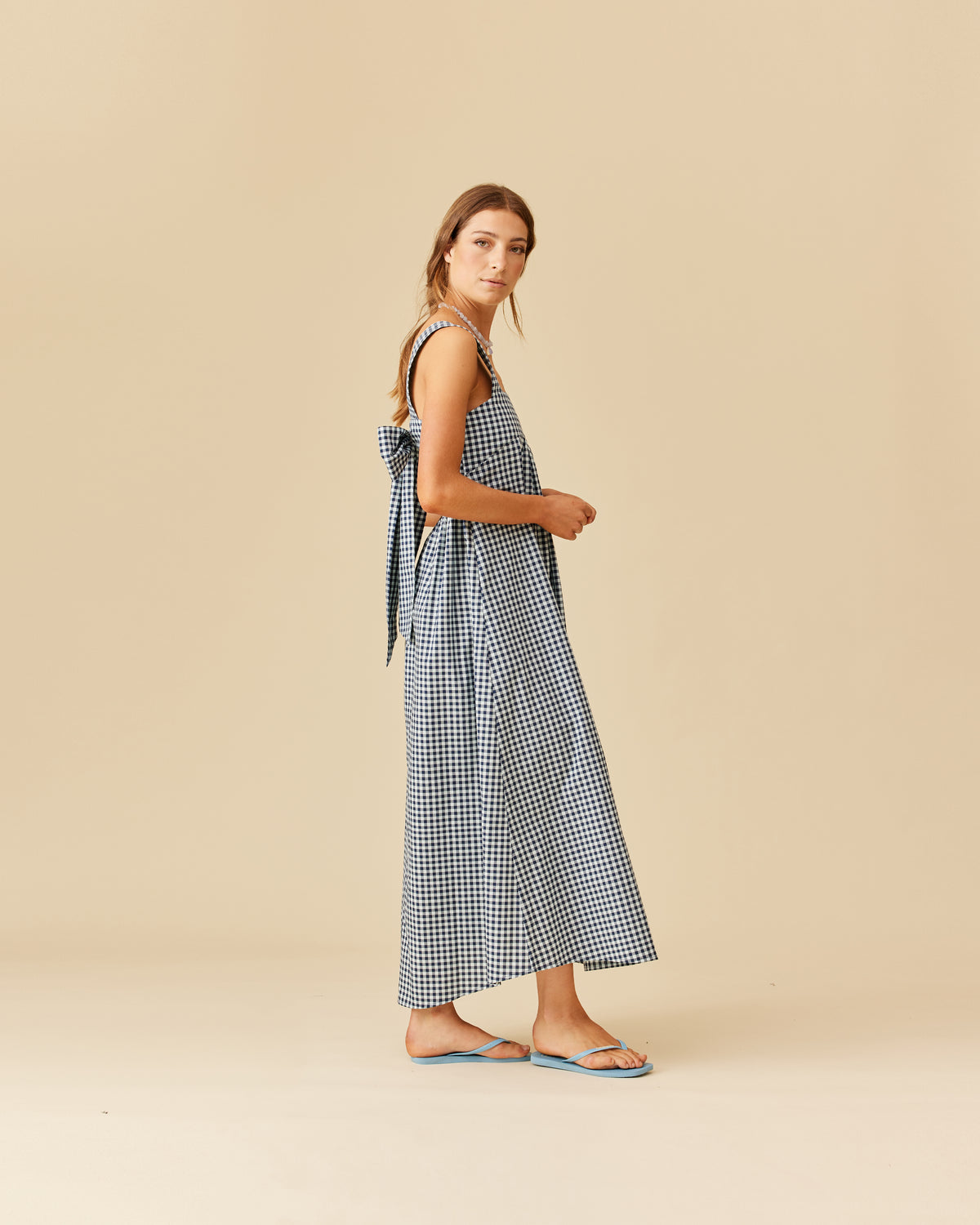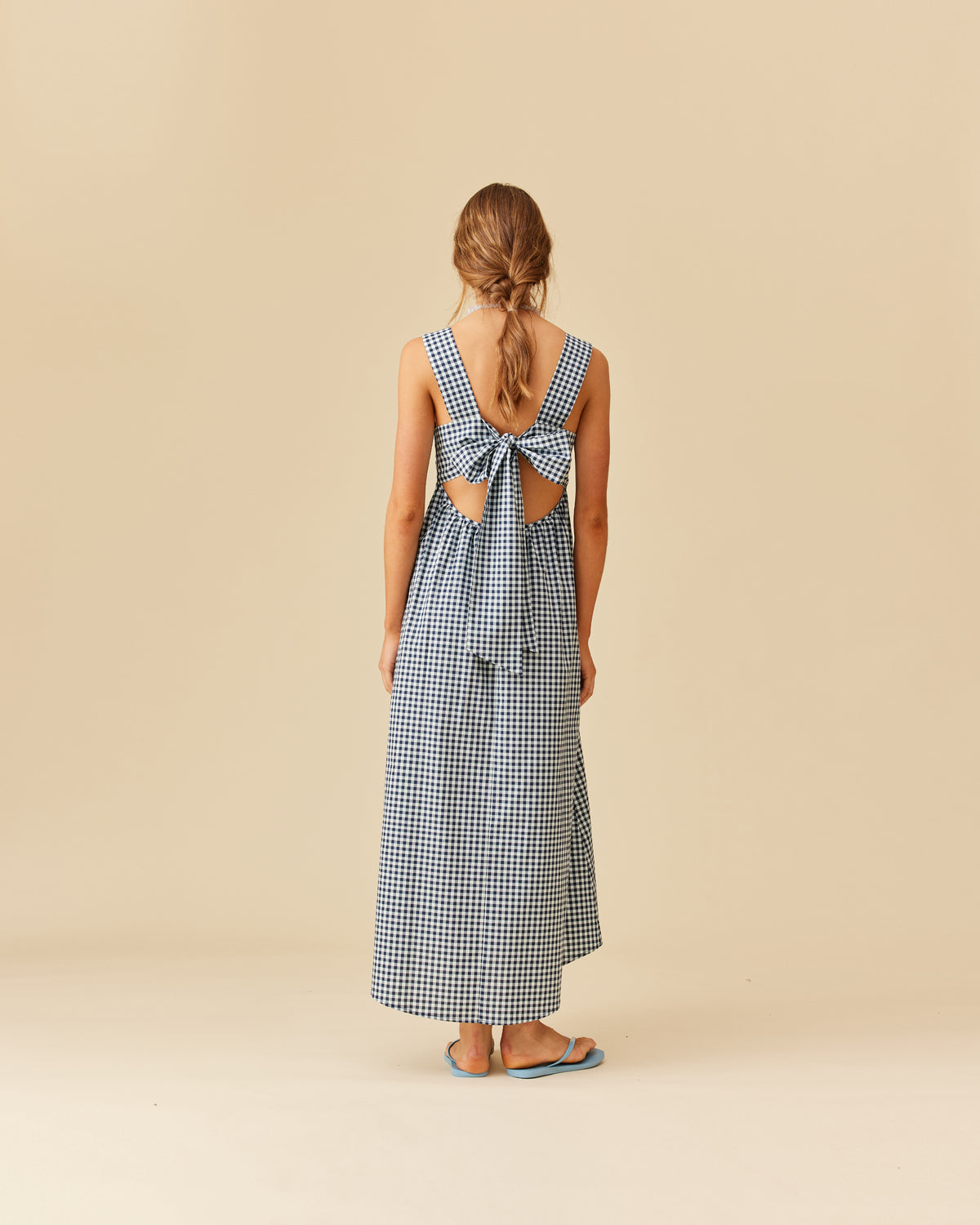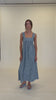 Organic cotton maxi dress with a square band bust. The skirt falls into a ruffled tier hem with an exposed back and bow tie closure.