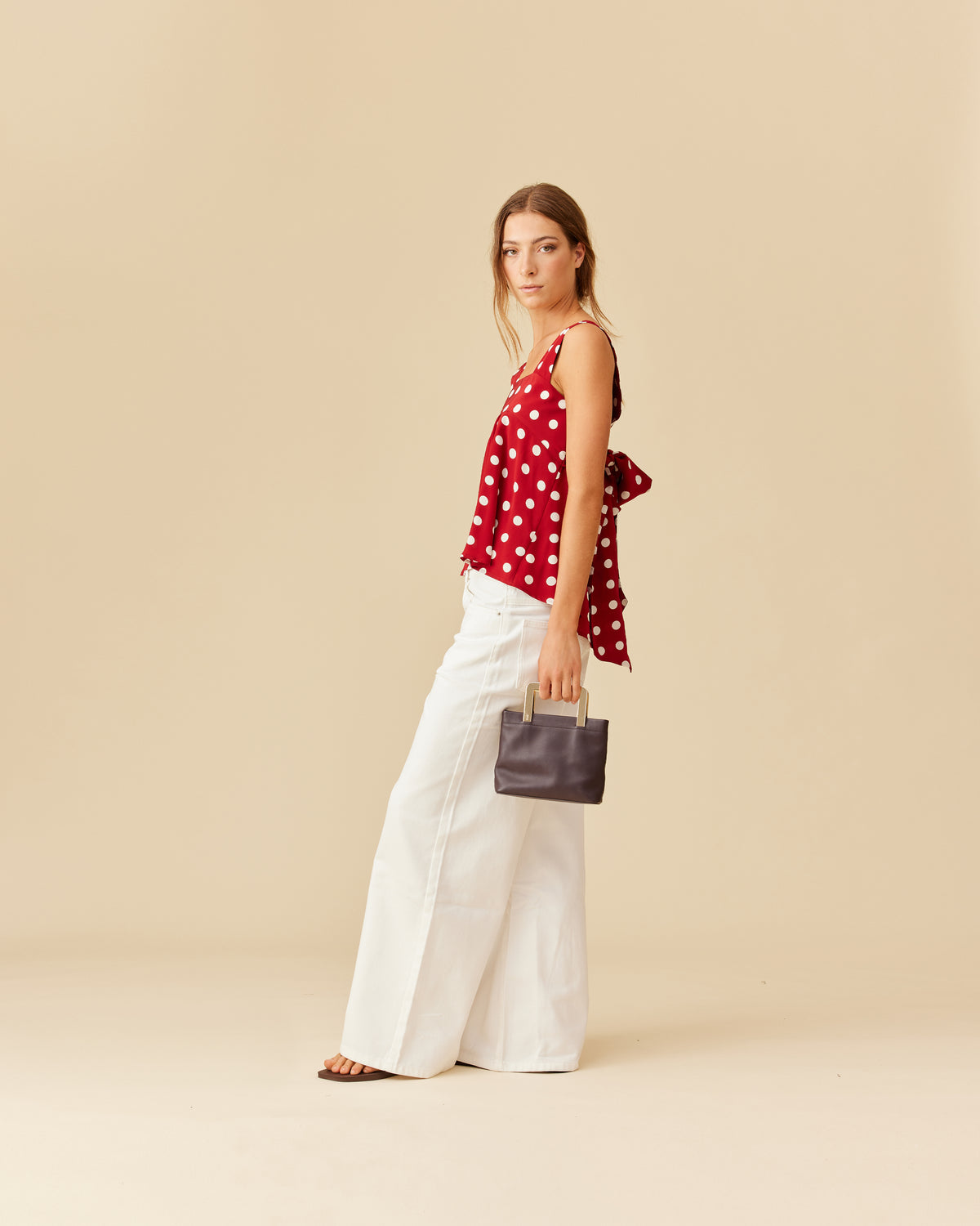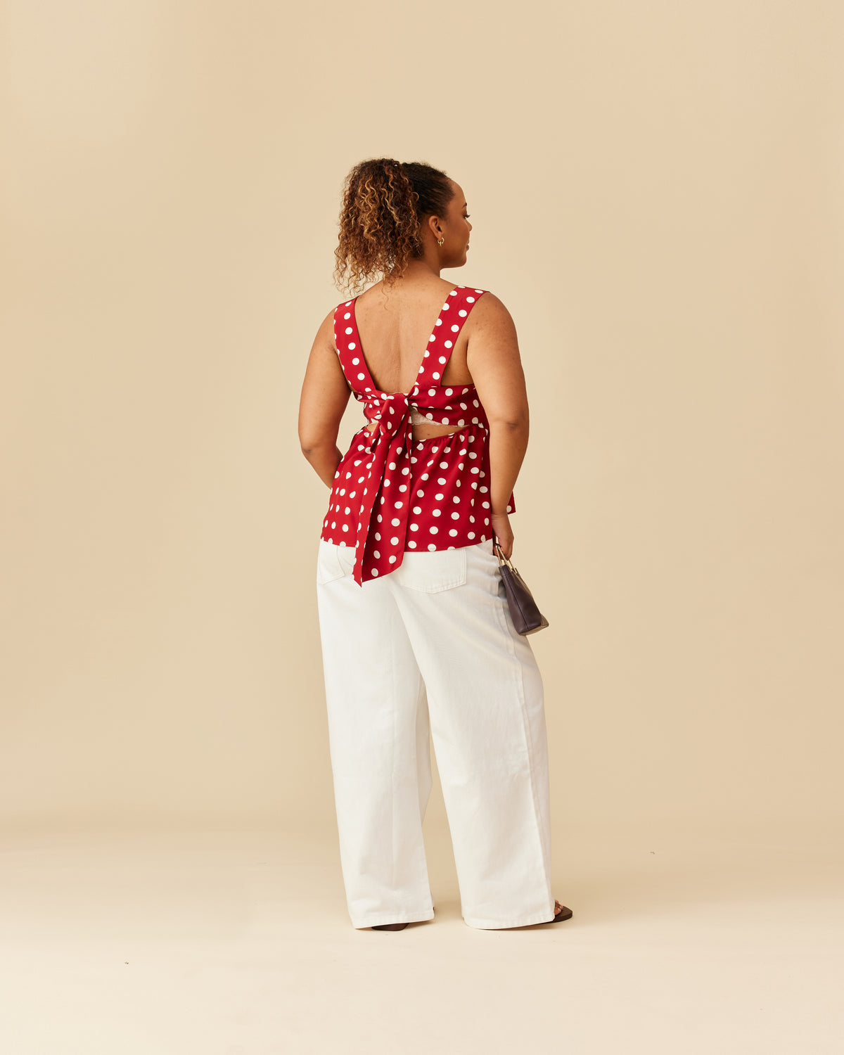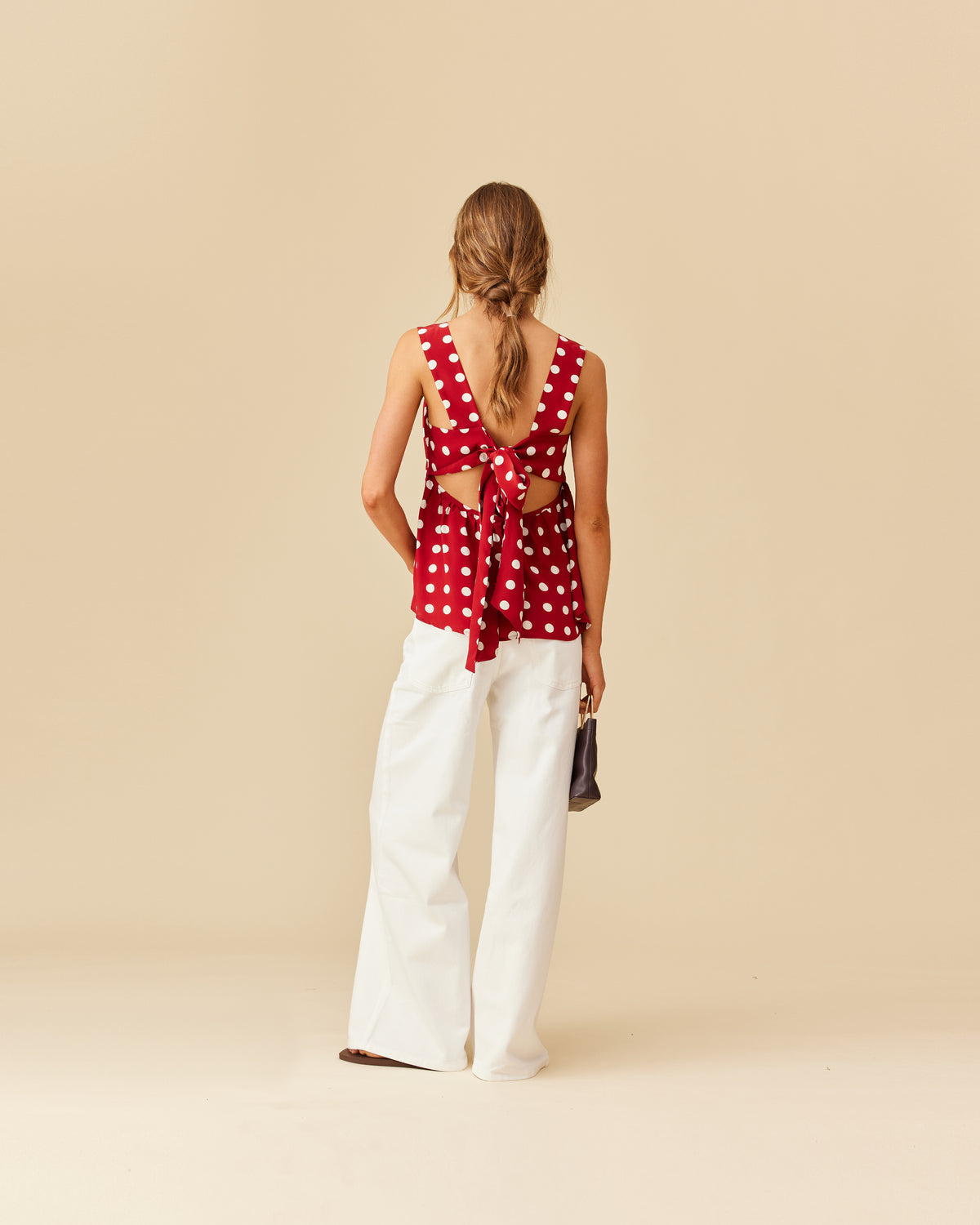 Margie gets an update in our garnet polka dot viscose, making this top more floaty than our previous versions. Sleeveless top with a square band at the bust. Features a bow tie detail at the back and a cut-out, the cutest top worn with your favourite denim.