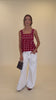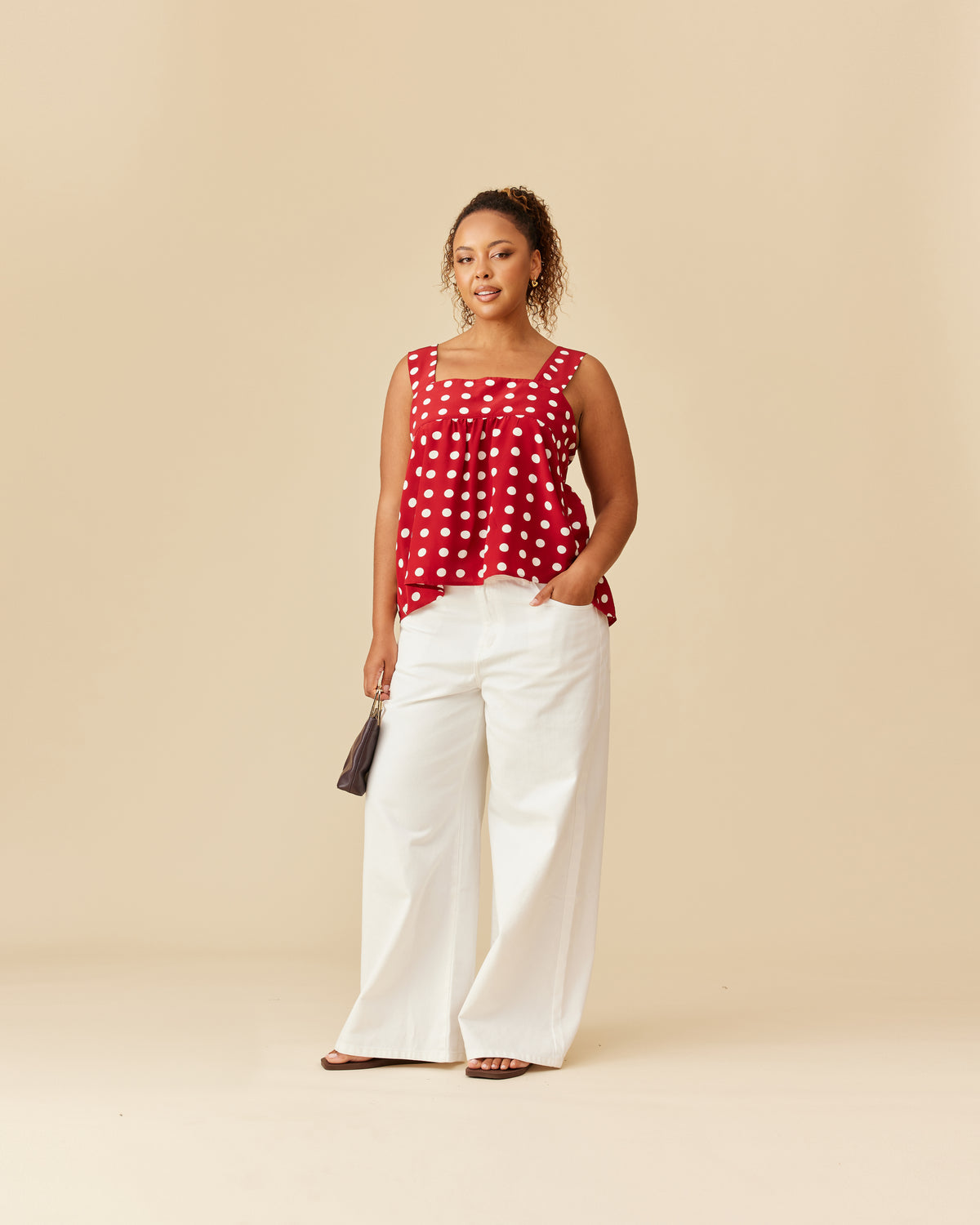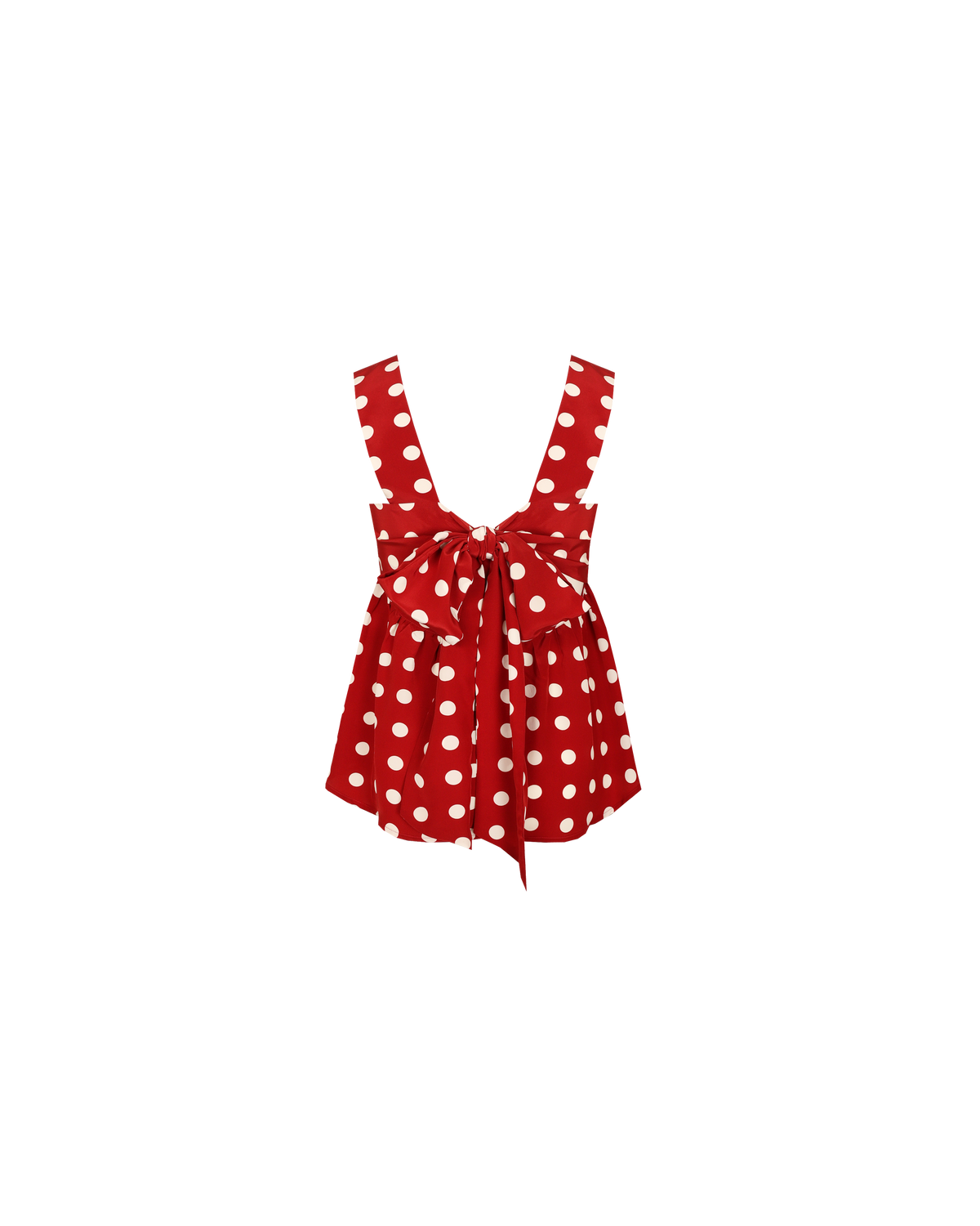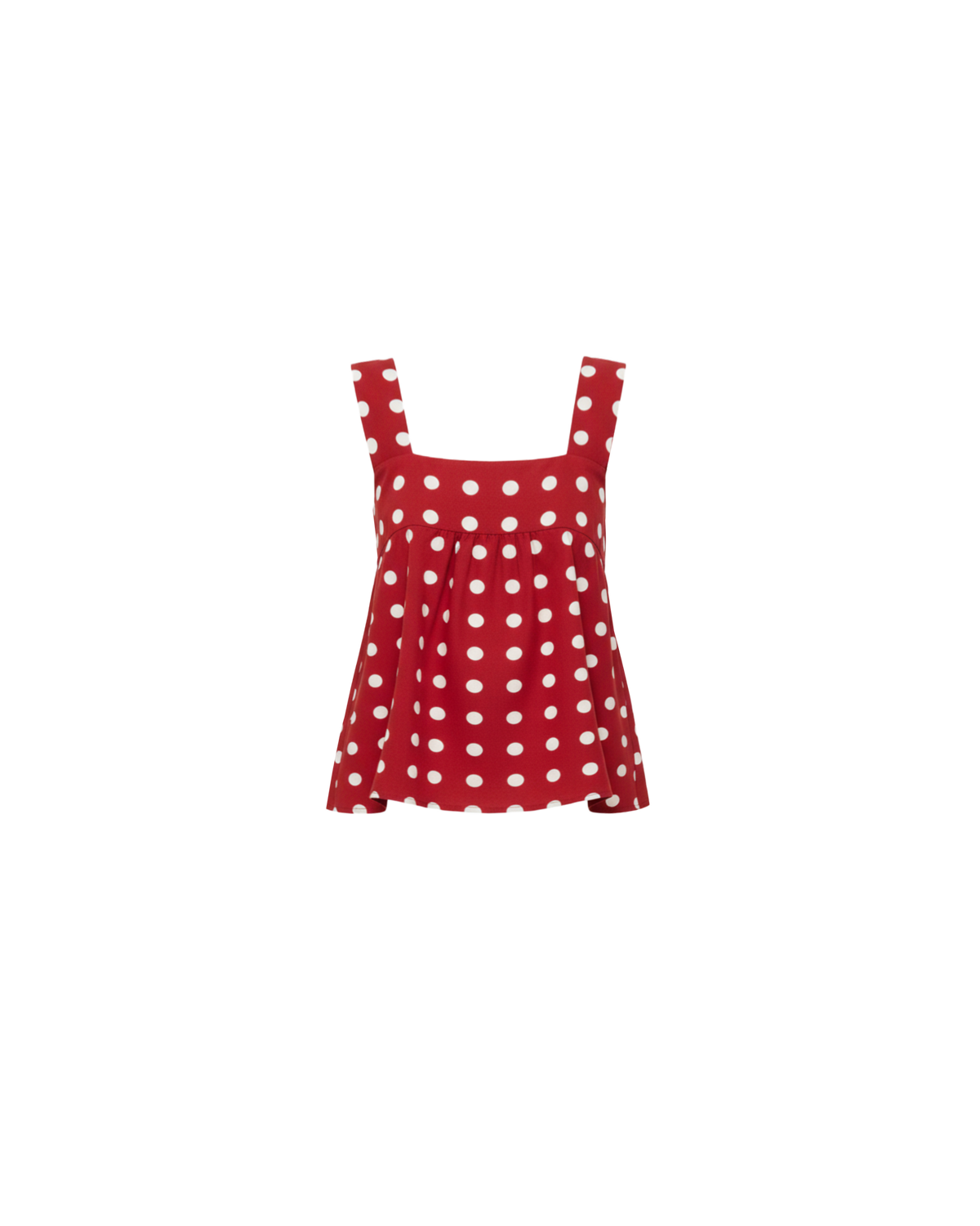 Margie gets an update in our garnet polka dot viscose, making this top more floaty than our previous versions. Sleeveless top with a square band at the bust. Features a bow tie detail at the back and a cut-out, the cutest top worn with your favourite denim.
