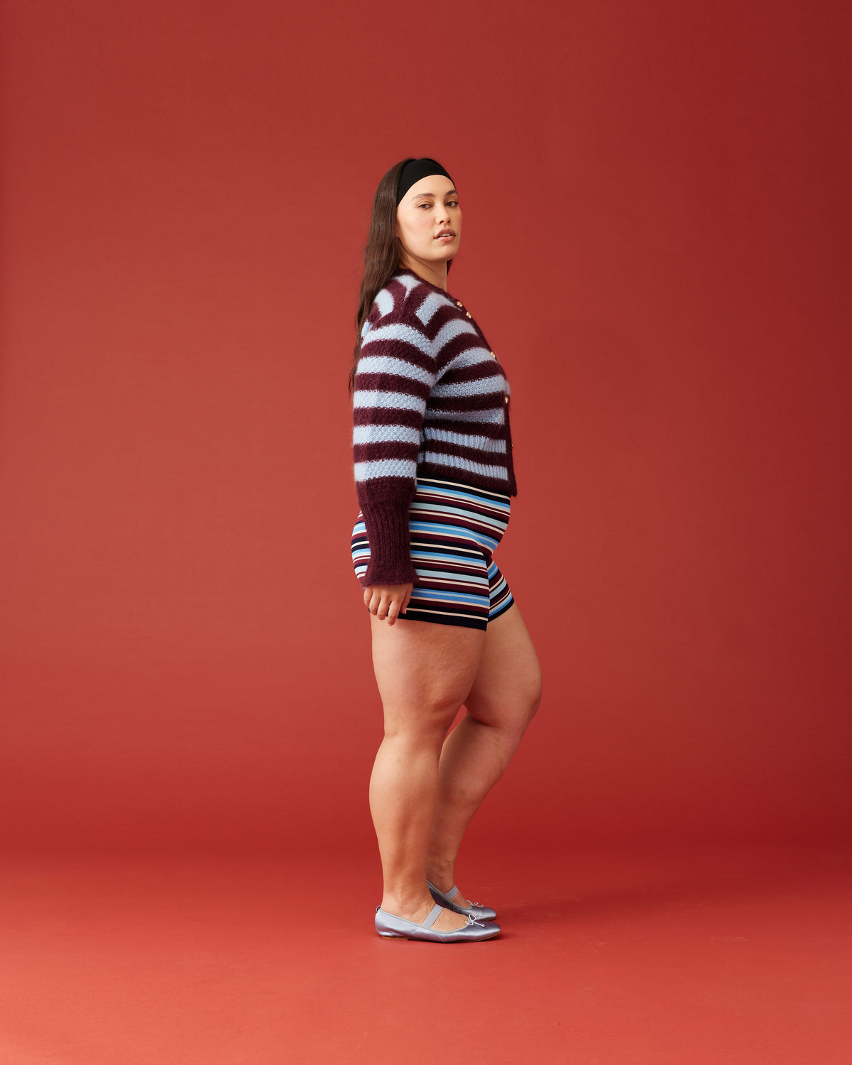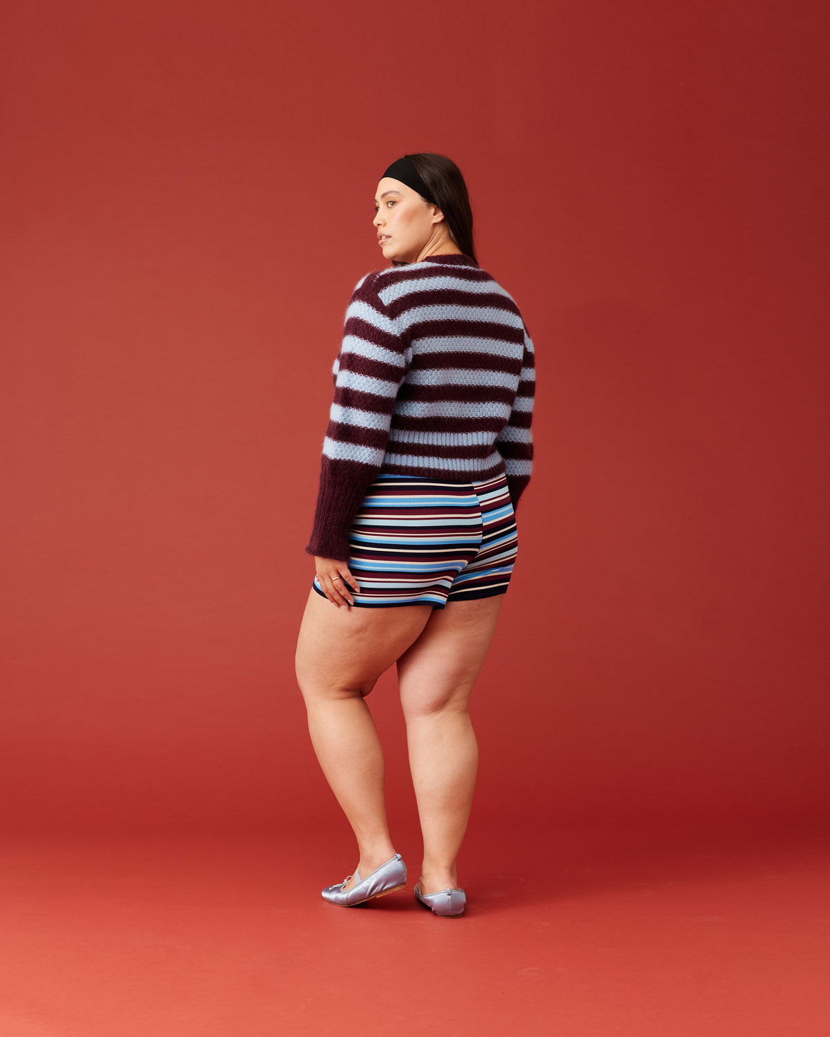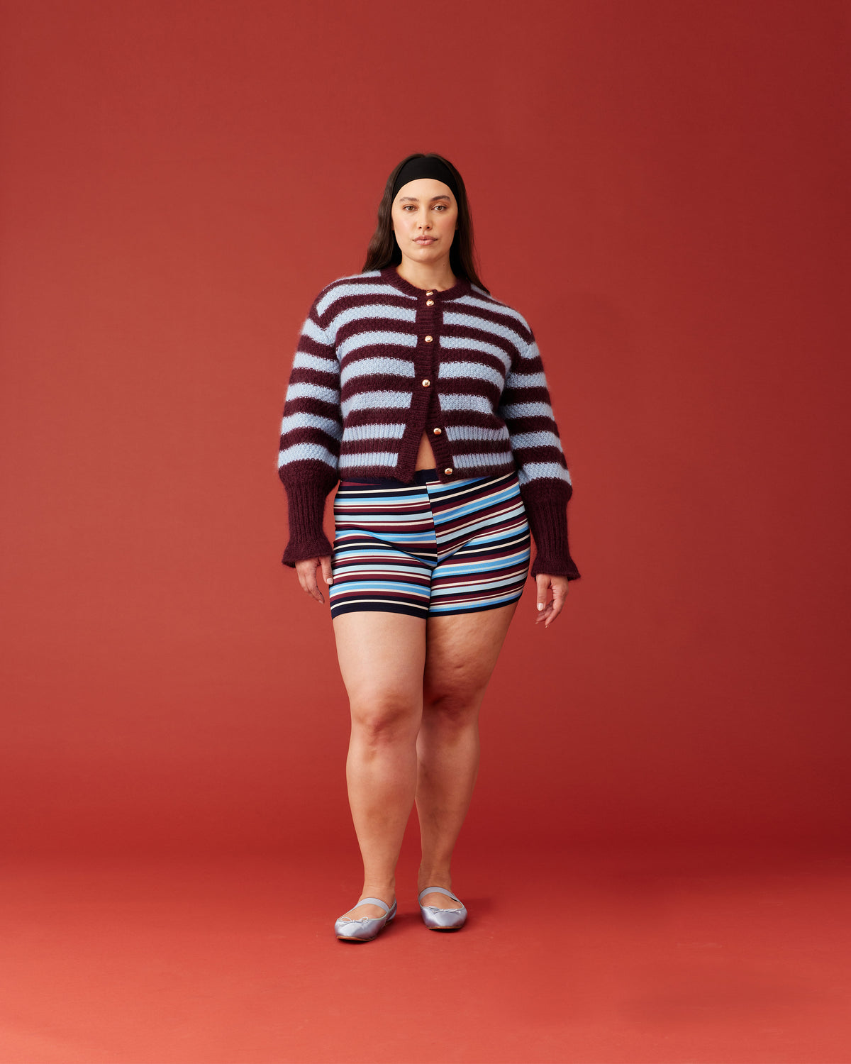Knitted booty shorts, designed in a burgundy blue striped viscose knit. These shorts pair with our Emma Knit Top or look great with a big t-shirt and boots.