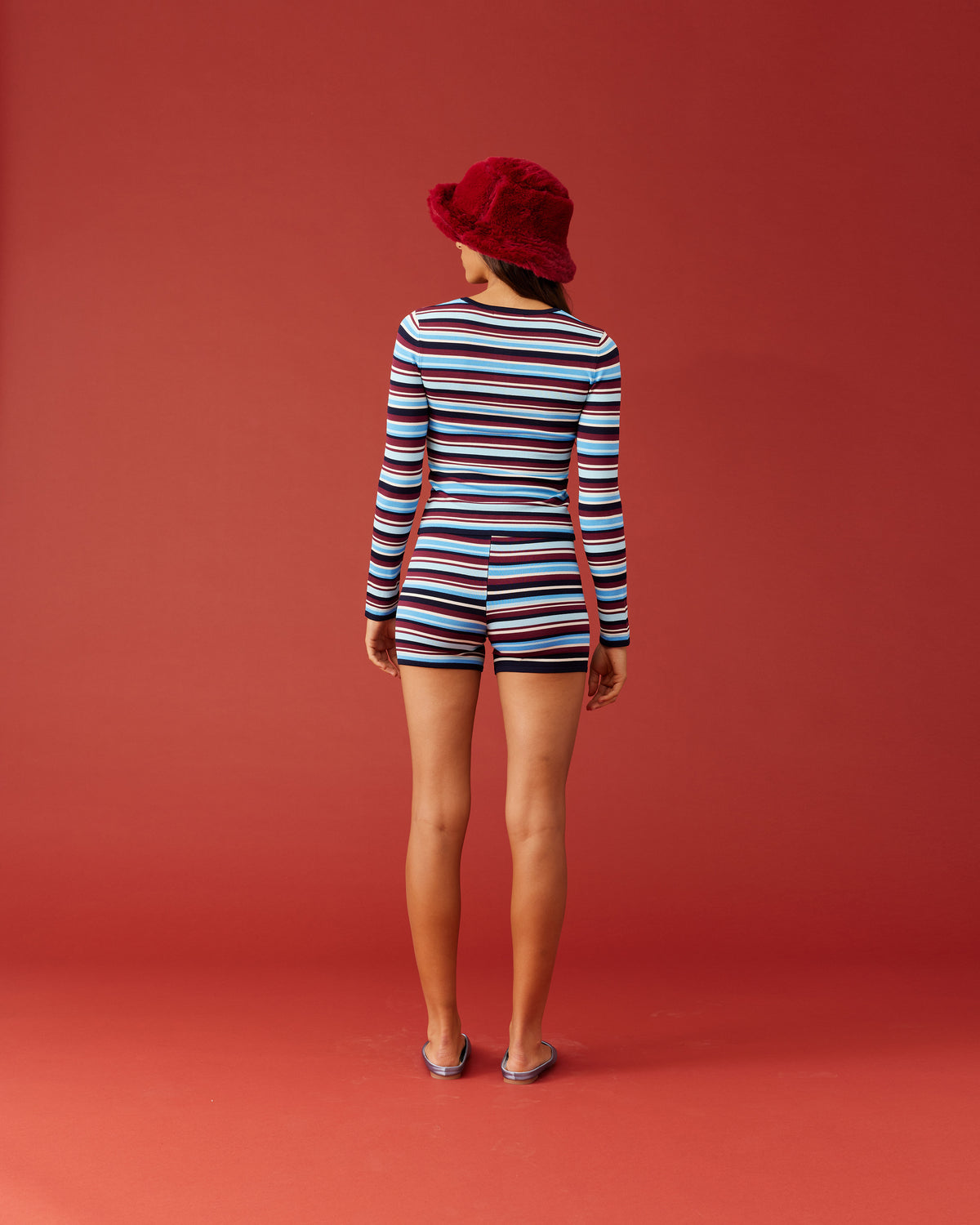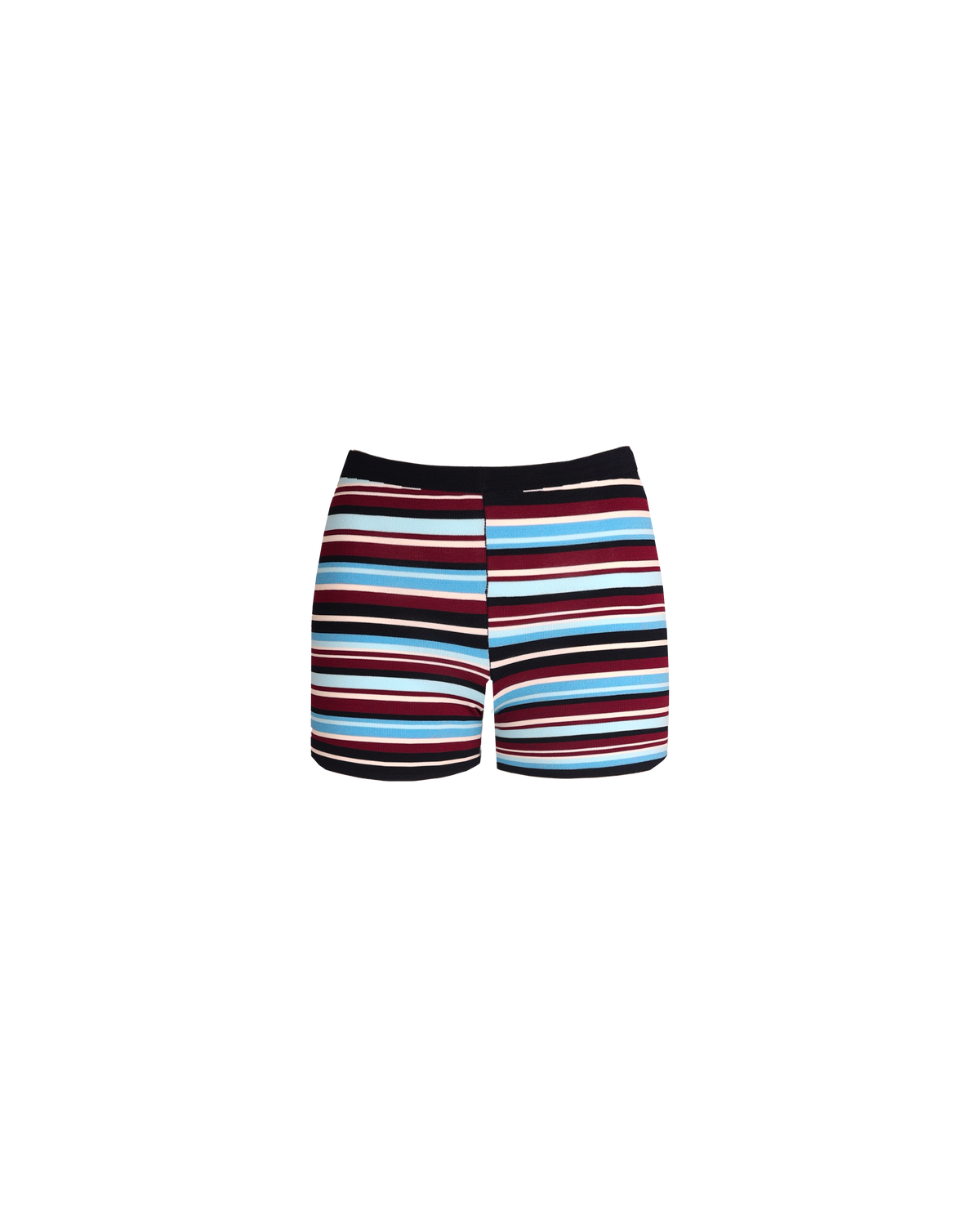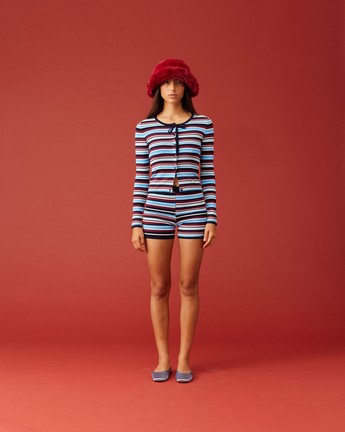 Knitted booty shorts, designed in a burgundy blue striped viscose knit. These shorts pair with our Emma Knit Top or look great with a big t-shirt and boots.