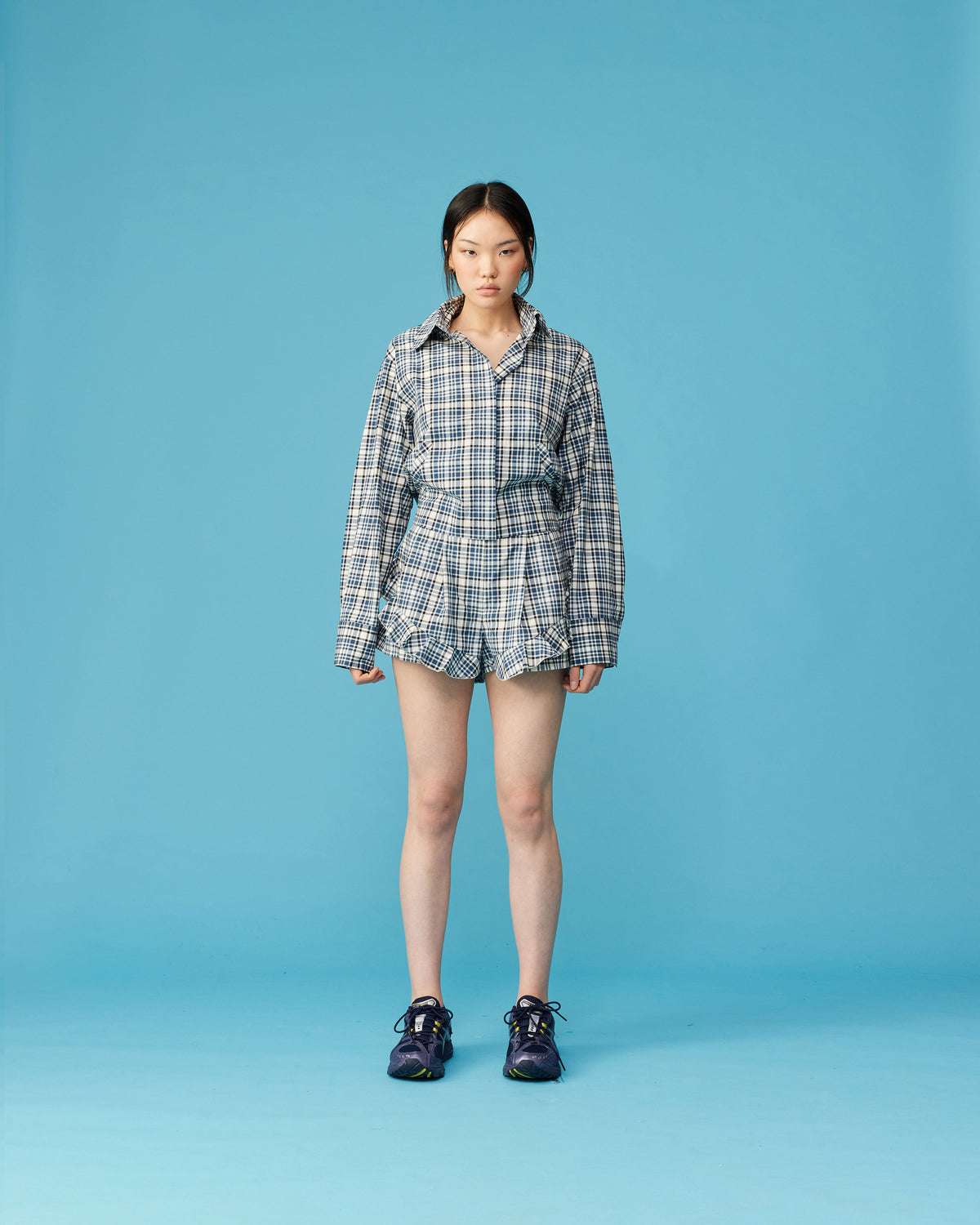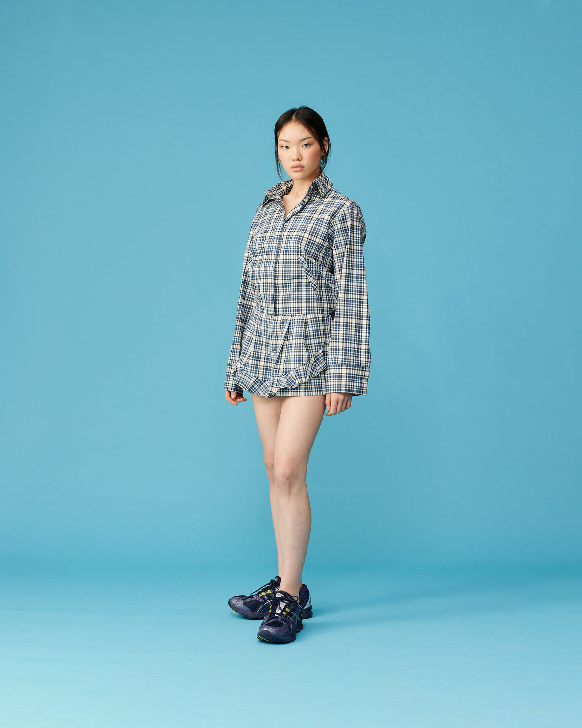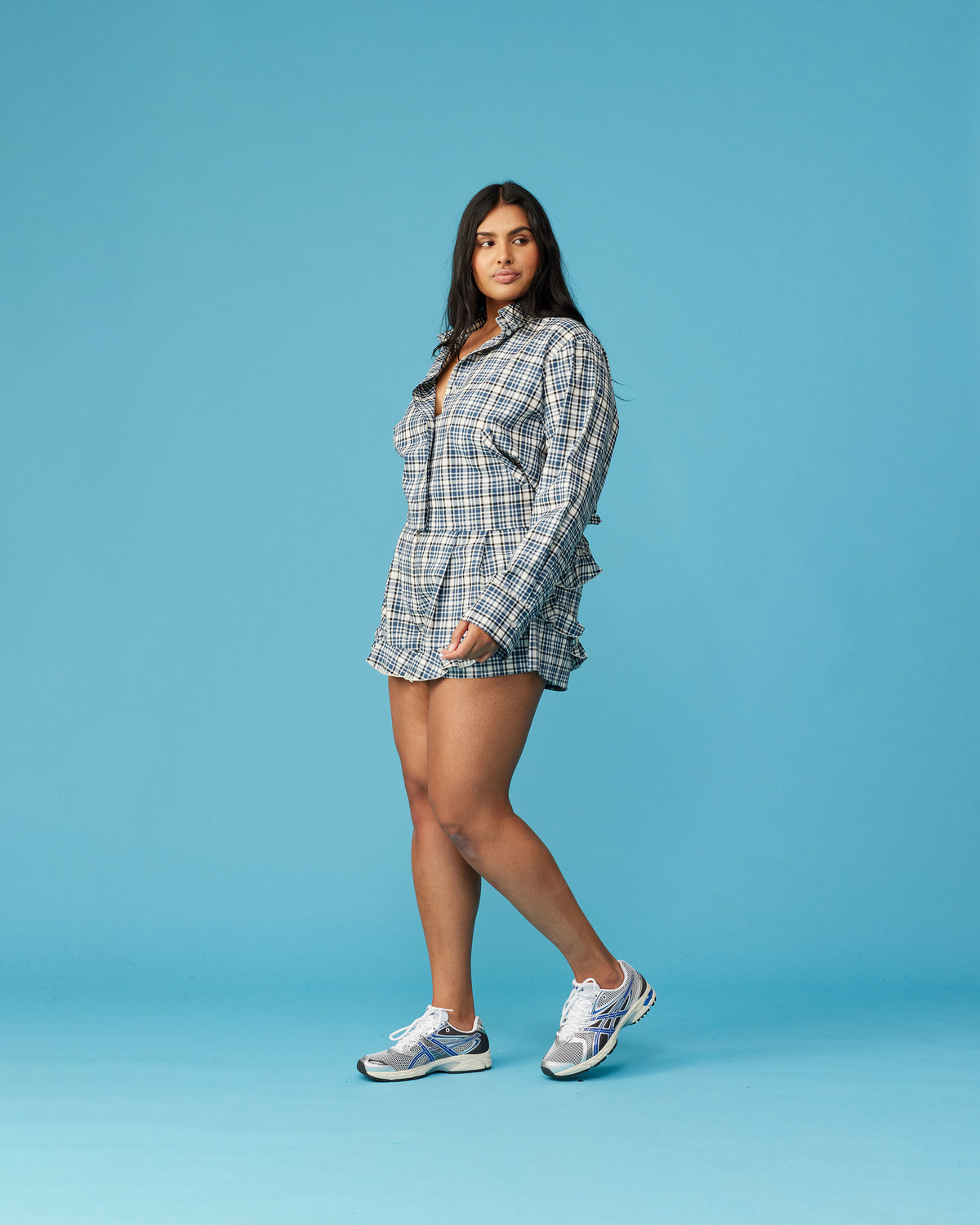 Jacket-style shirt designed in our navy cream tartan cotton. This shirt sits slightly cropped and features elasticated sides with D-ring closures, which allow you to cinch in the waist and create a bomber jacket look. Make it a set by pairing this shirt with the Dove Short or Trulli Maxi Skirt.