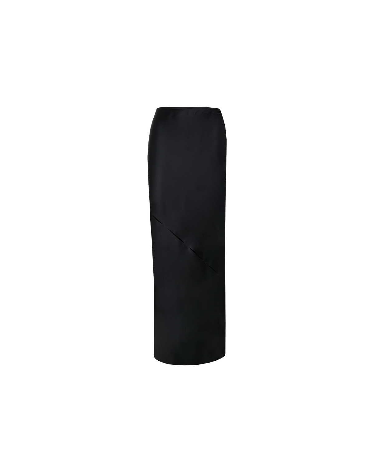 Maxi-length satin skirt with a side split and flat waistband. This skirt features subtle cut-outs on the bias that run down the front of the skirt, elevating this staple piece.