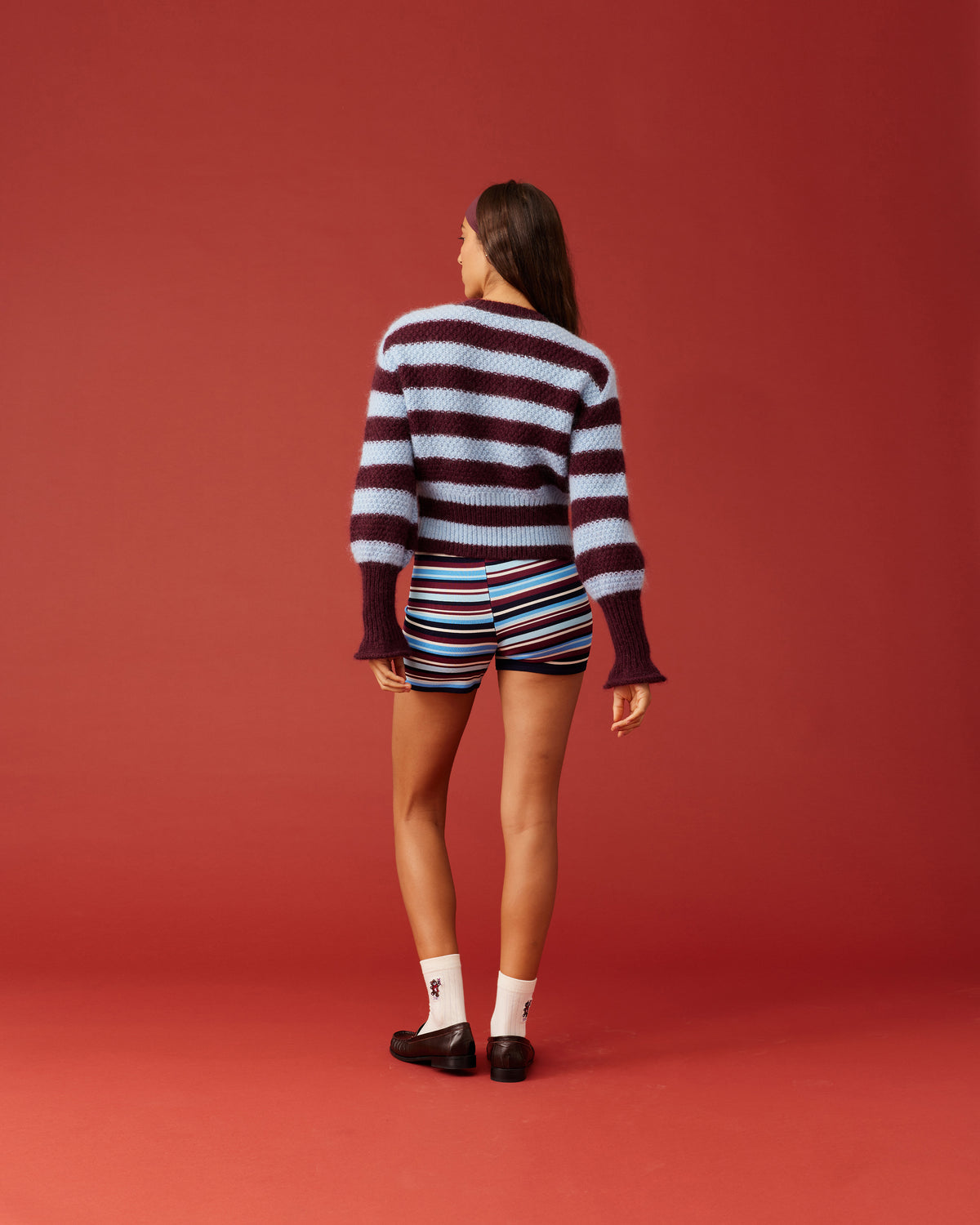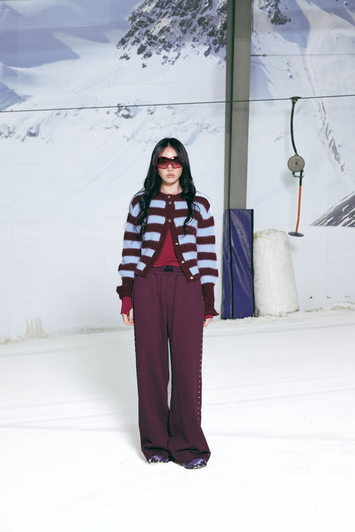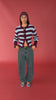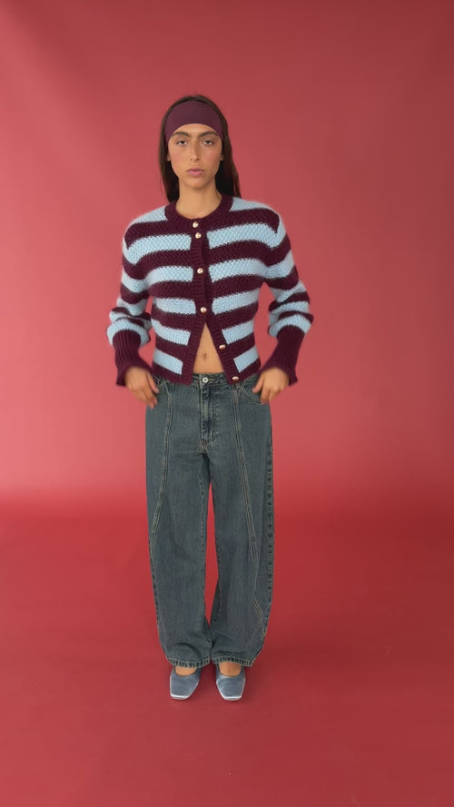 A fresh take on a Rubette favourite, introducing the striped Matilda Cardigan. A button-down cardigan with gold metallic dome buttons and a slightly puff-shouldered silhouette. Features an exaggerated flute cuff crafted in a chunky wool blend.