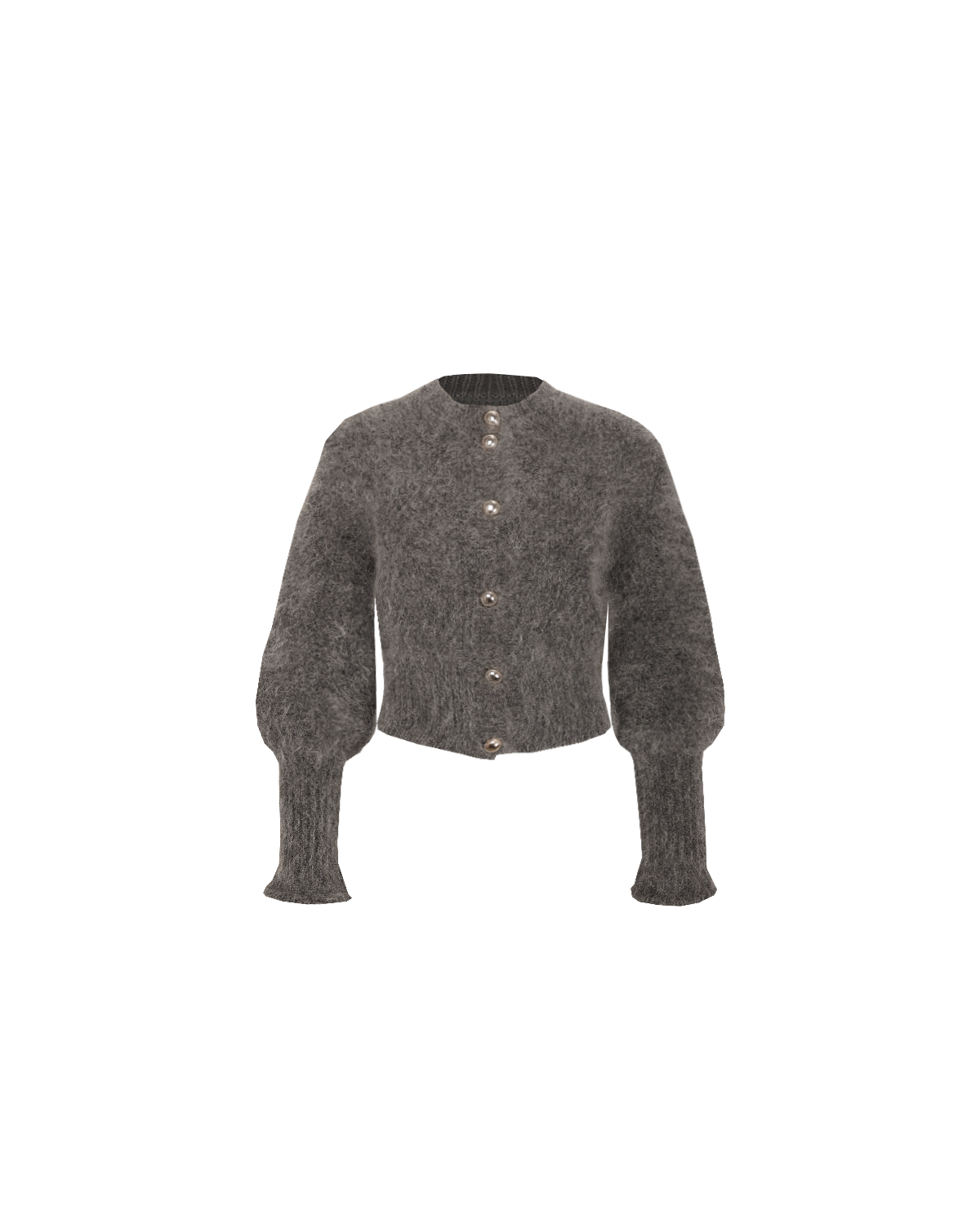 Button-down cardigan with silver metallic dome buttons and a slightly puff-shouldered silhouette. Features an exaggerated flute cuff crafted in a chunky wool blend.