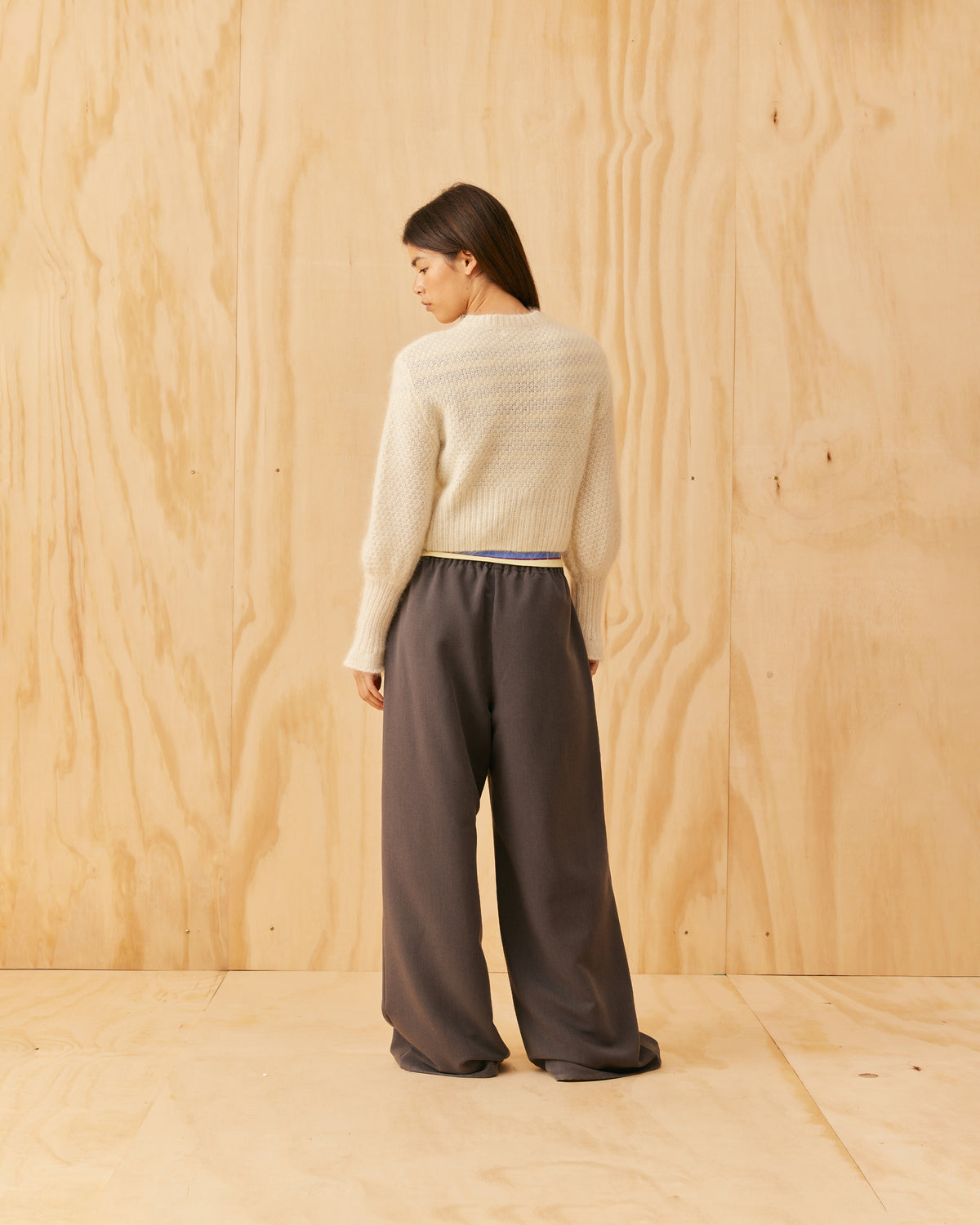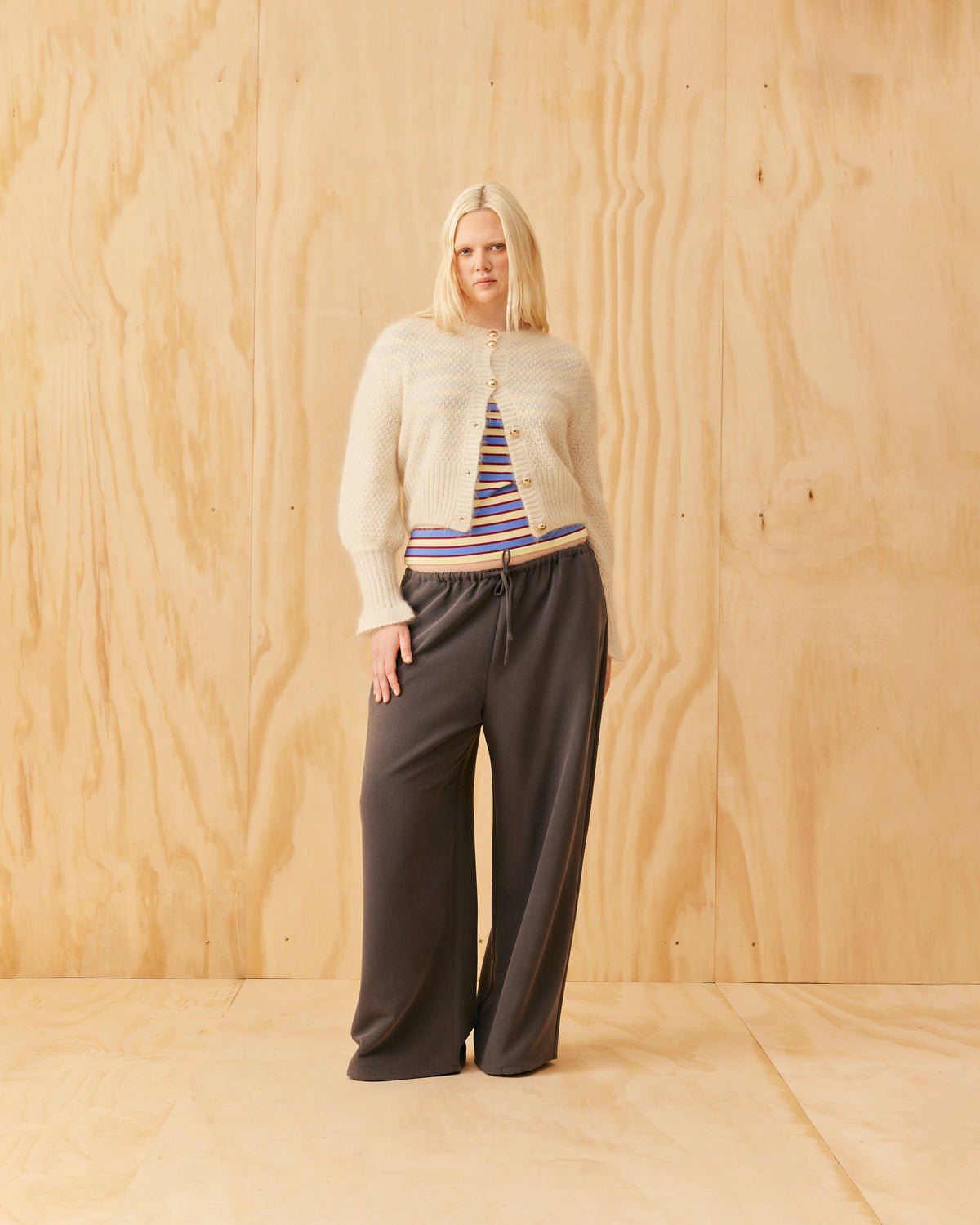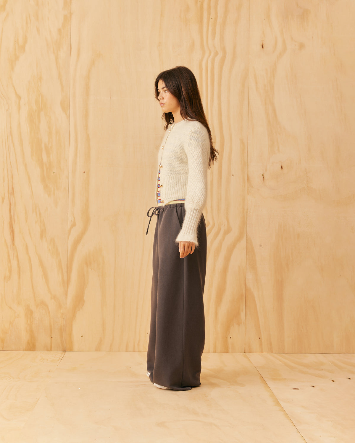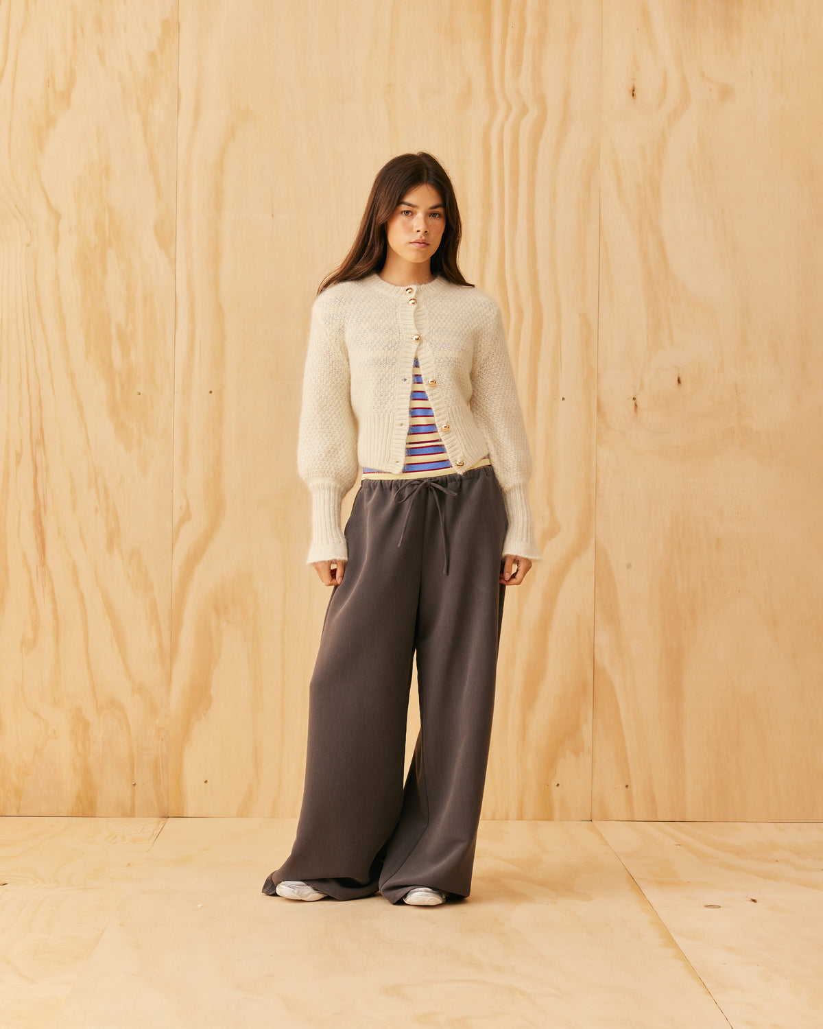 Button-down cardigan with gold metallic dome buttons and a slightly puff-shouldered silhouette. Features an exaggerated flute cuff crafted in a chunky wool blend.