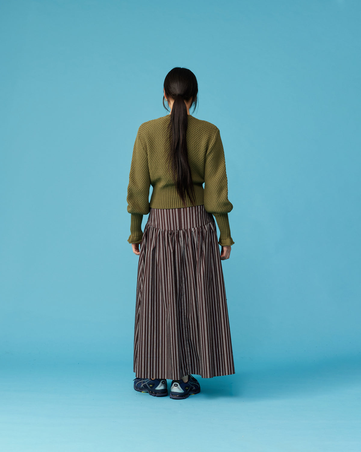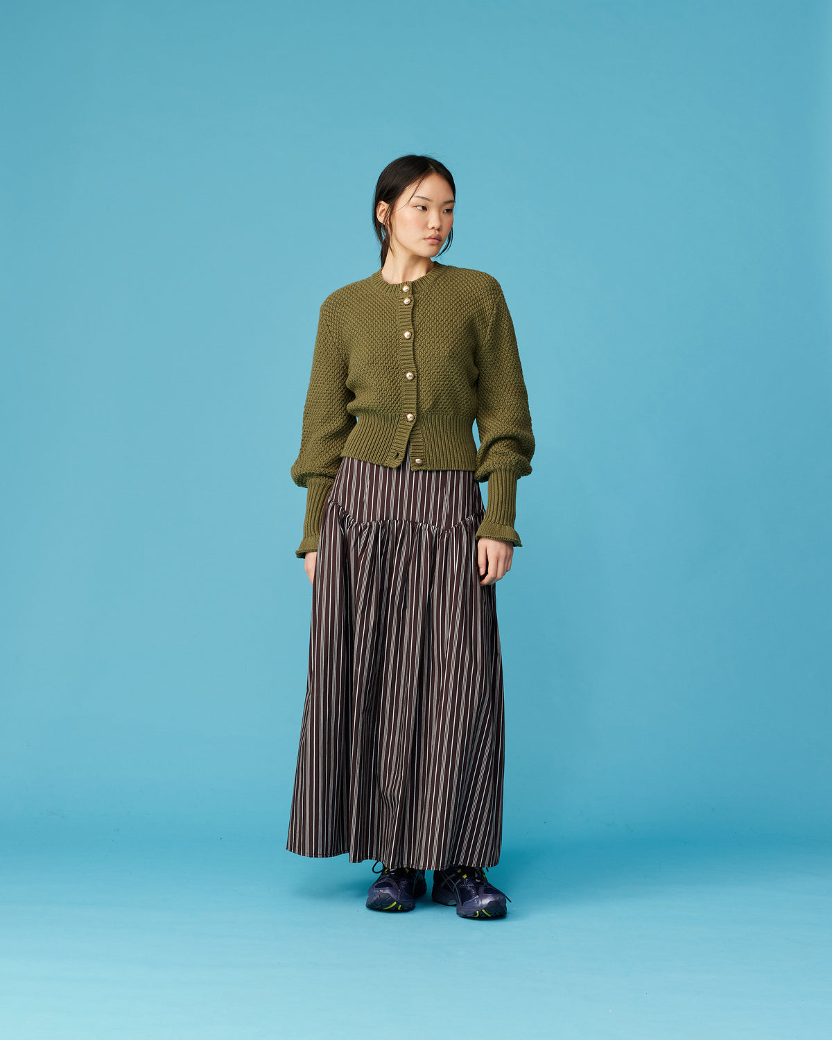 Your wool Matilda's, allergy-friendly twin! All the best bits crafted in a plush cotton knit version. Button-down cardigan with gold metallic dome buttons and a slightly puff-shouldered silhouette. Features an exaggerated flute cuff.