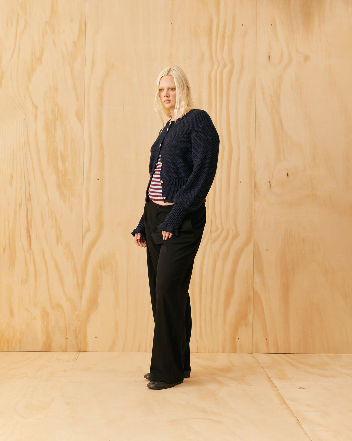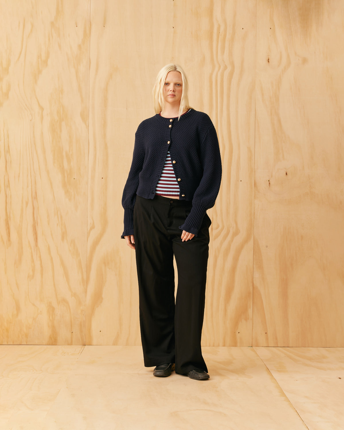Your wool Matilda's, allergy-friendly twin! All the best bits crafted in a plush cotton knit version. Button-down cardigan with gold metallic dome buttons and a slightly puff-shouldered silhouette. Features an exaggerated flute cuff.