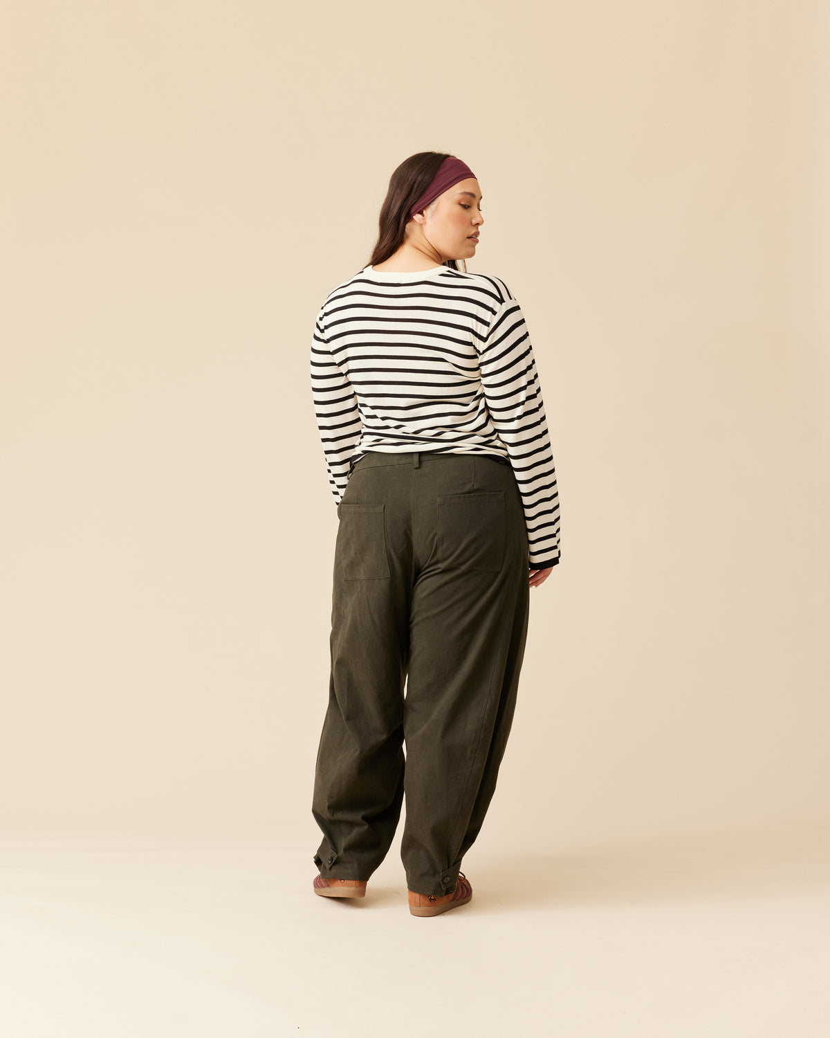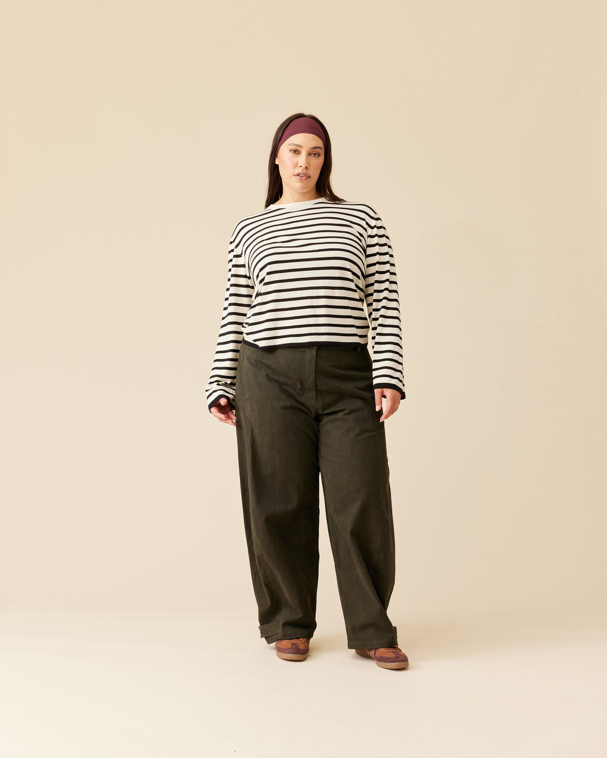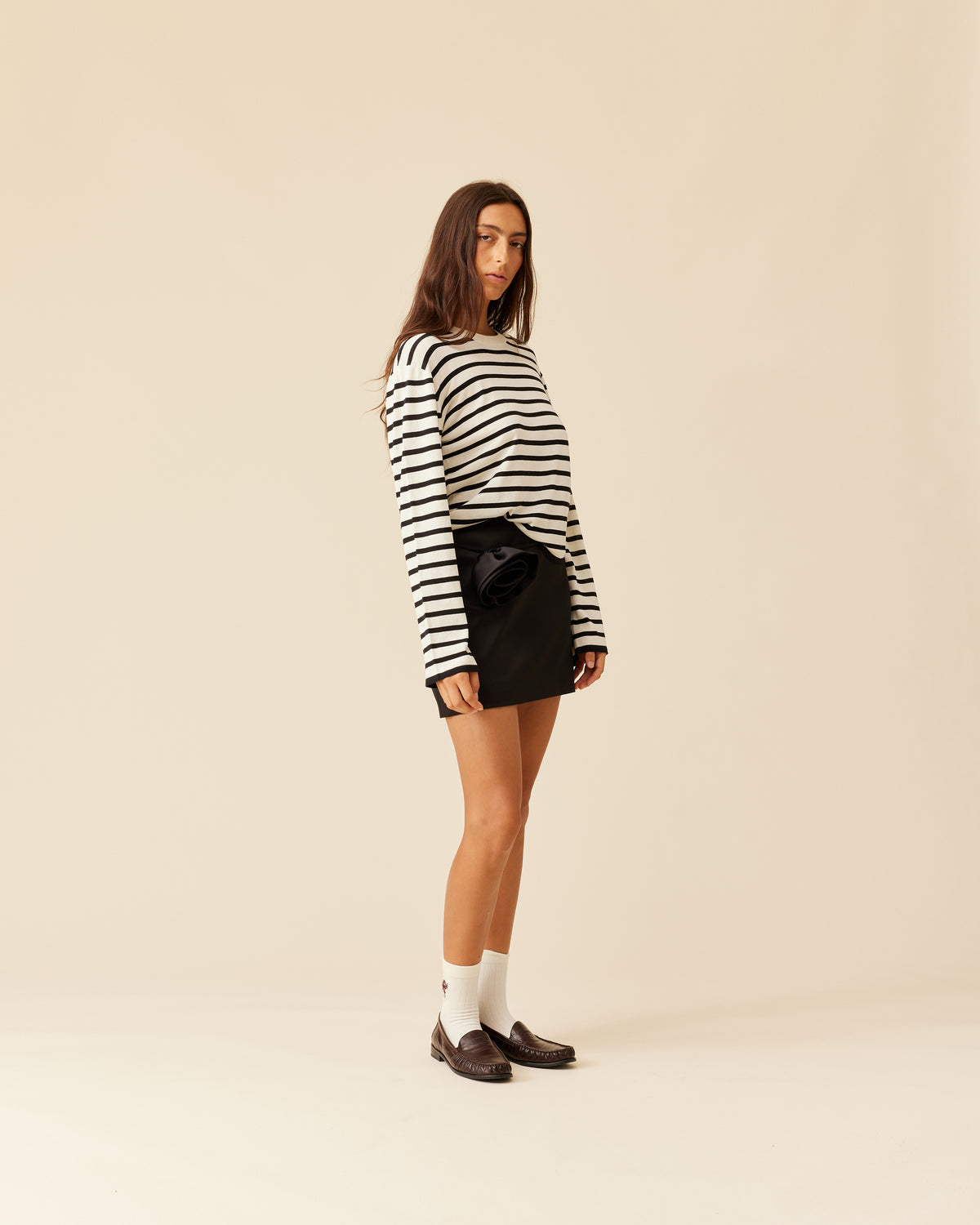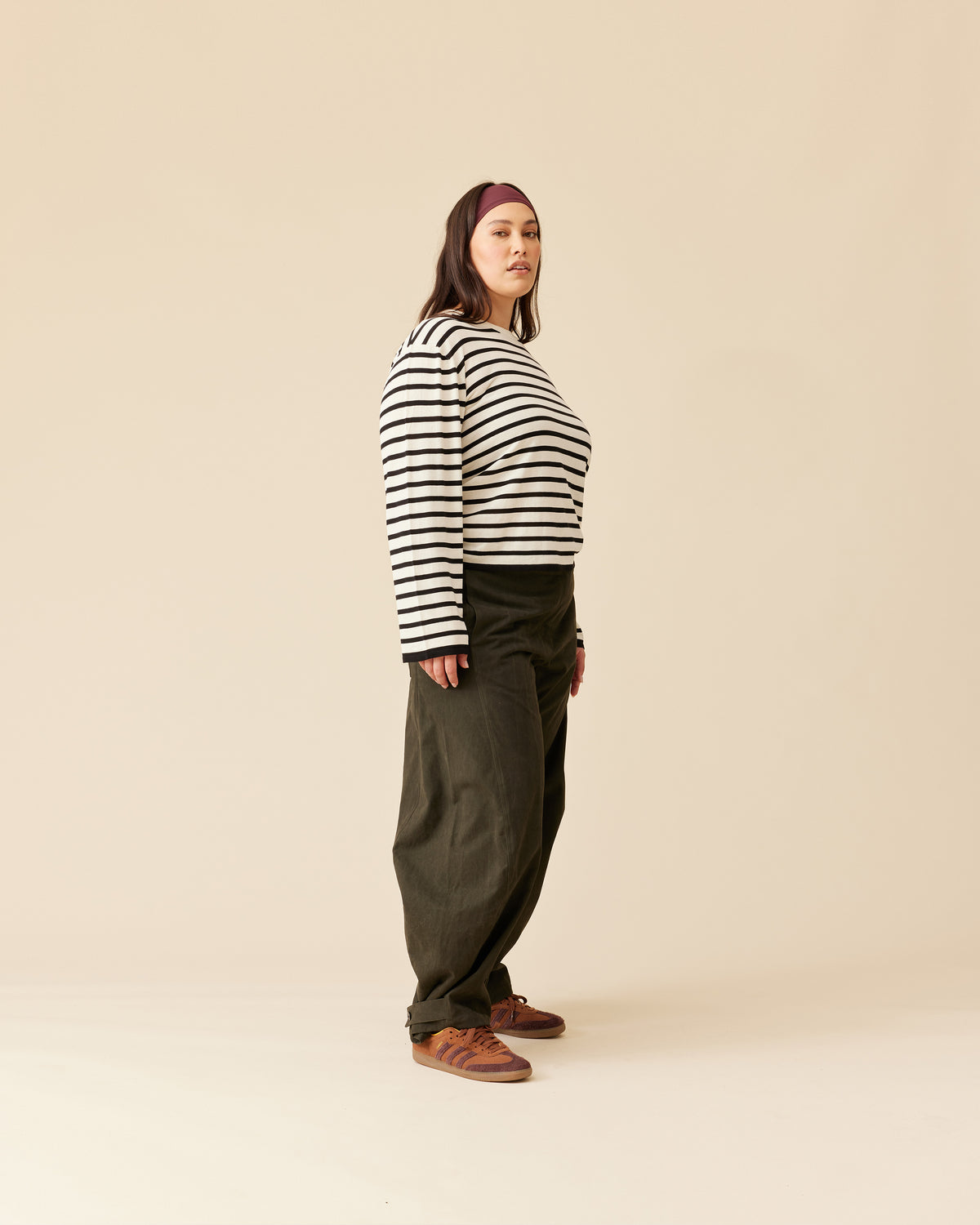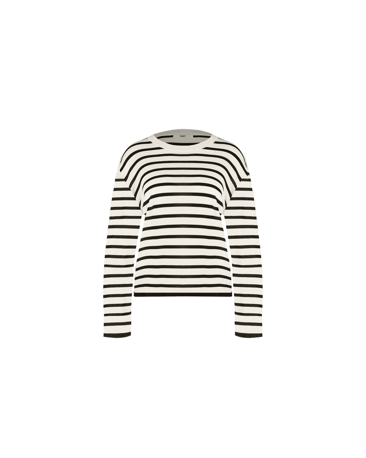 Relaxed fit long sleeve top, in a black and white striped knit. This top fits loose throughout the arms and body, and makes for a great wardrobe staple, worn on its own or layered under tops and coats for extra warmth.