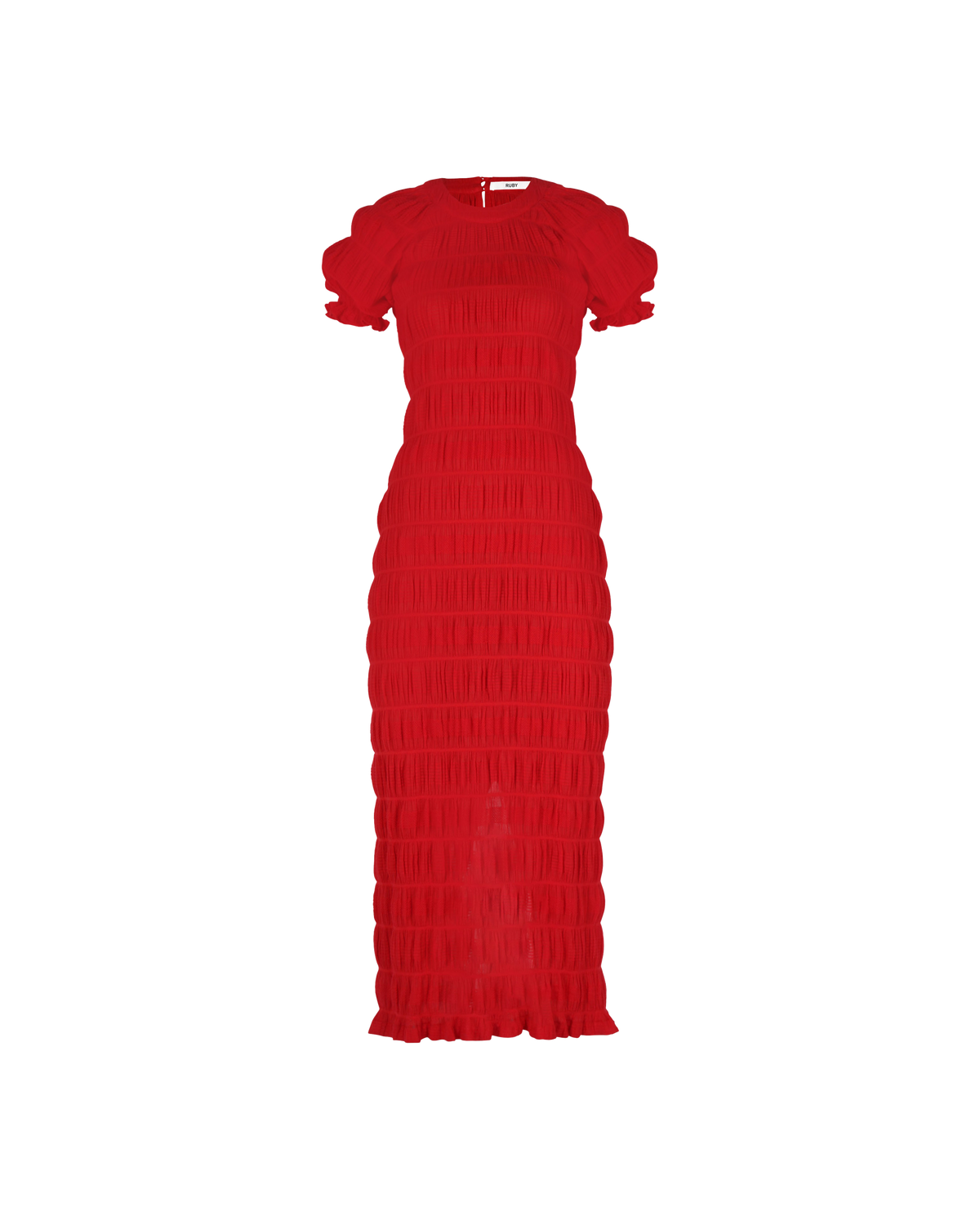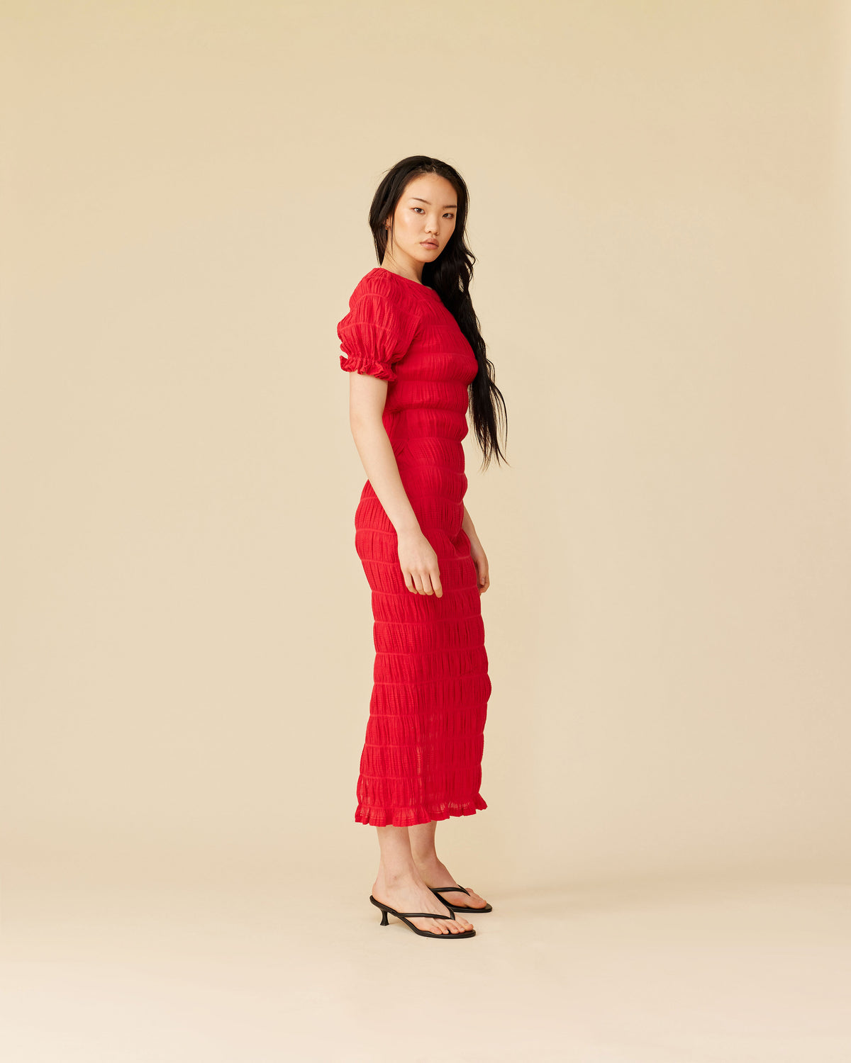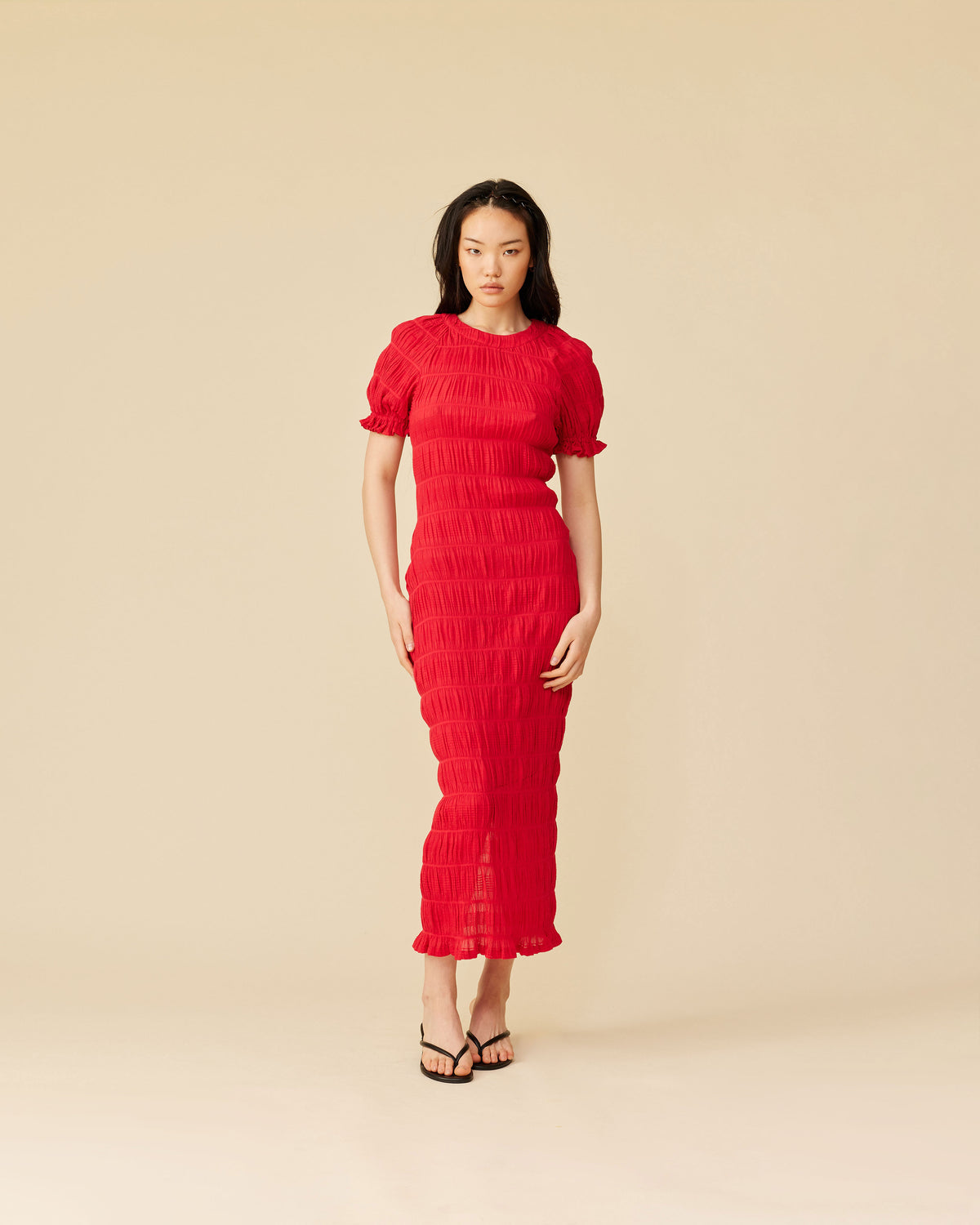 The Mirella T-Shirt Dress is a crewneck fitted maxi dress. It features elasticated short puff sleeves and a keyhole closure at the back secured with two buttons. Made in signature RUBY Mirella fabric, a delicate embroidered cotton.