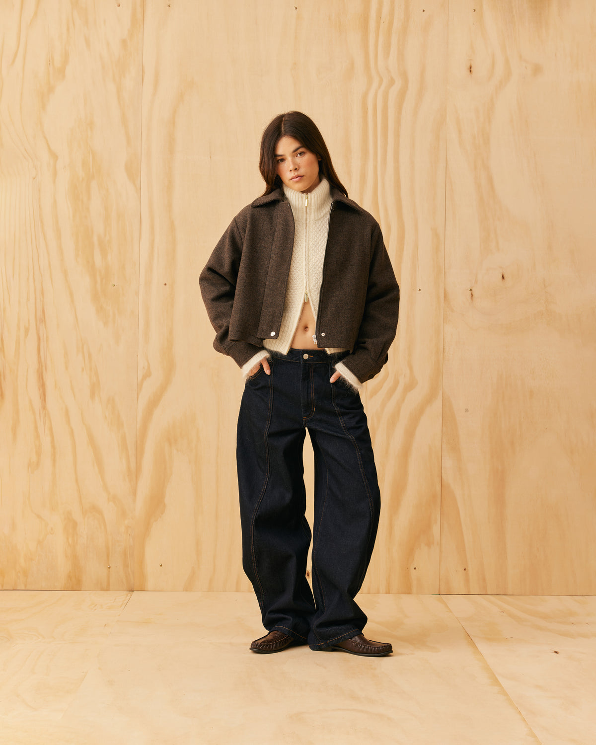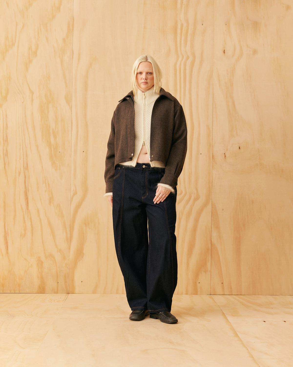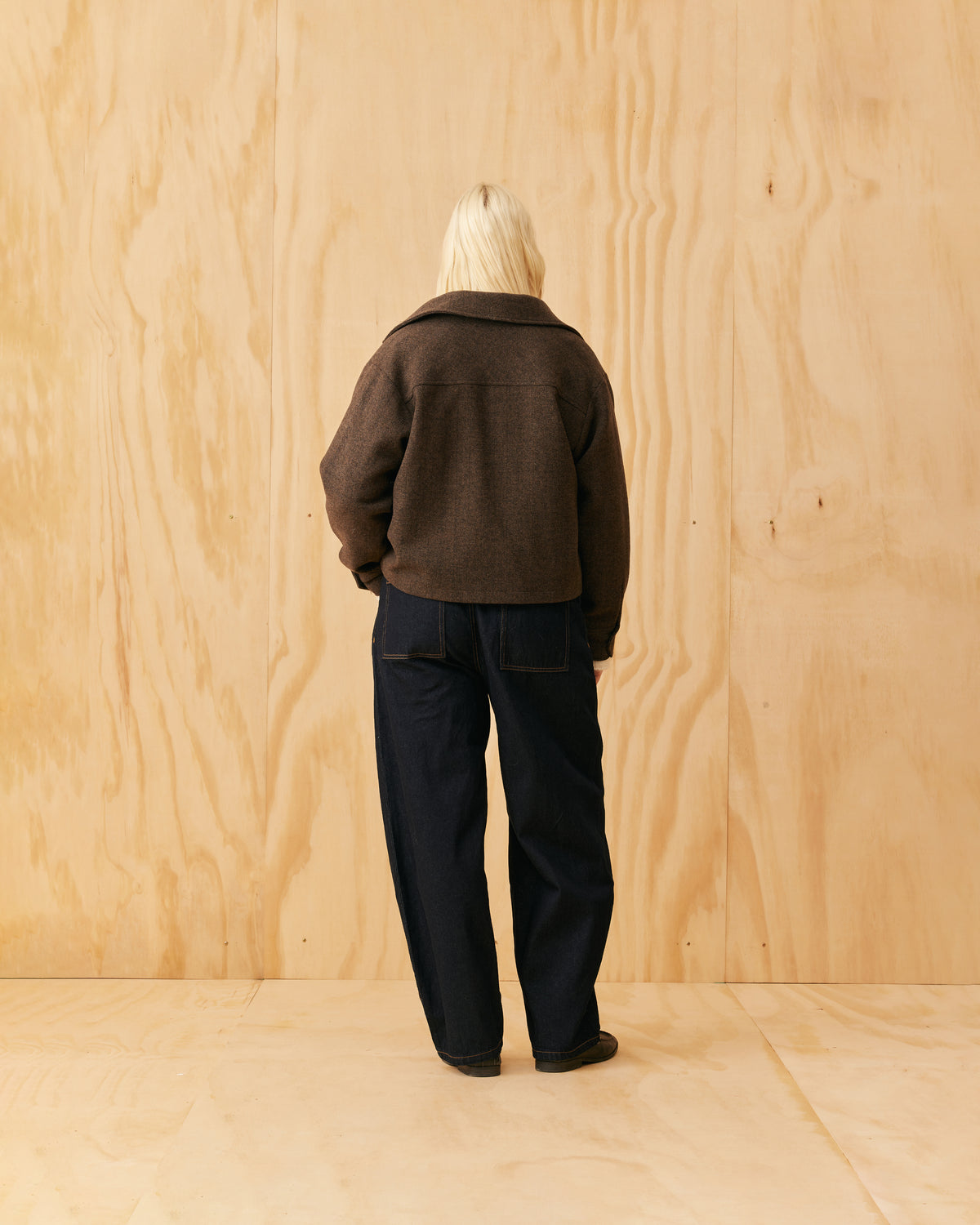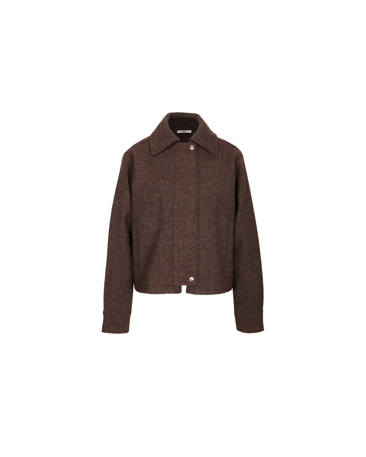 Classic wool jacket with a covered zip front and collar, designed in a heavyweight herringbone fabric. This jacket sits boxy and a bit cropped, and features cuffs at the sleeve which create a slight balloon shape.