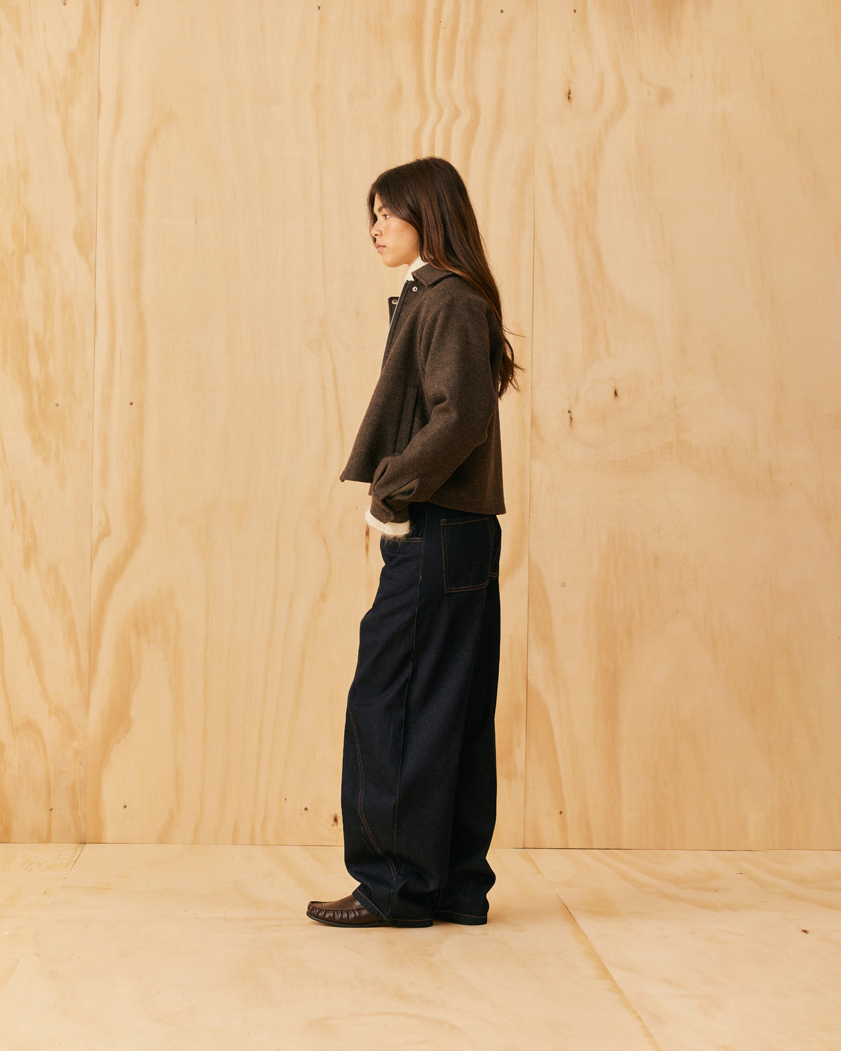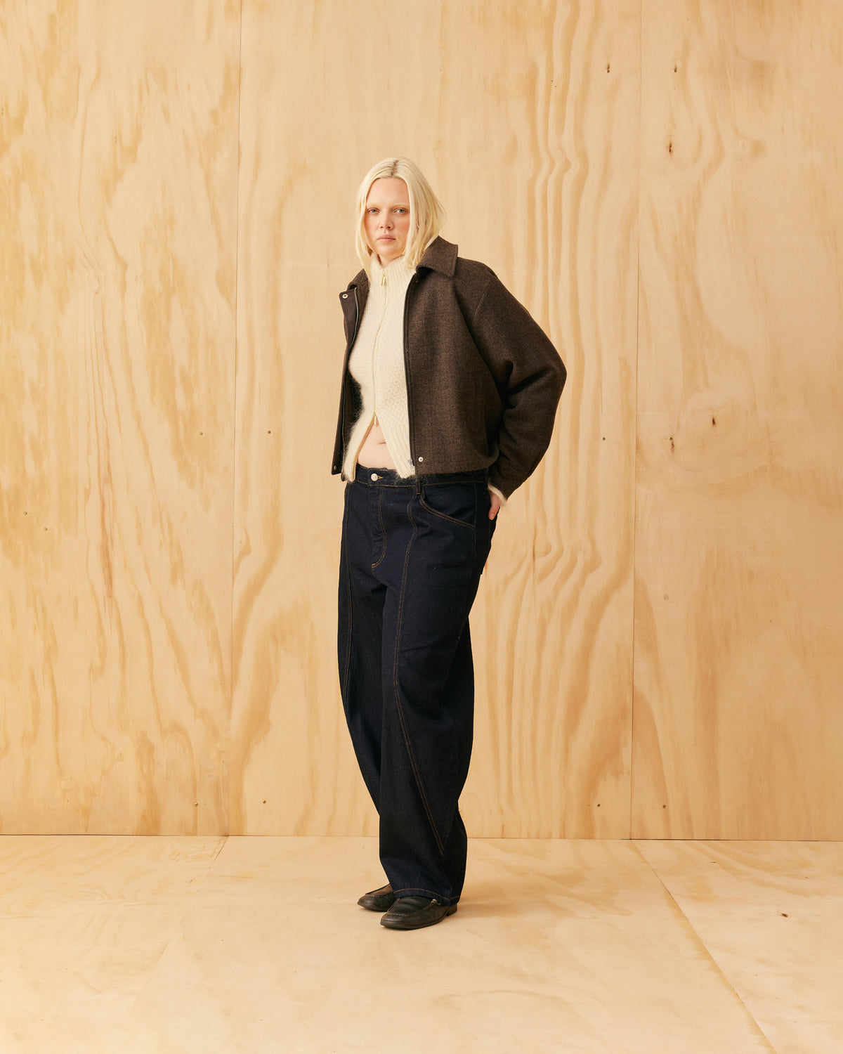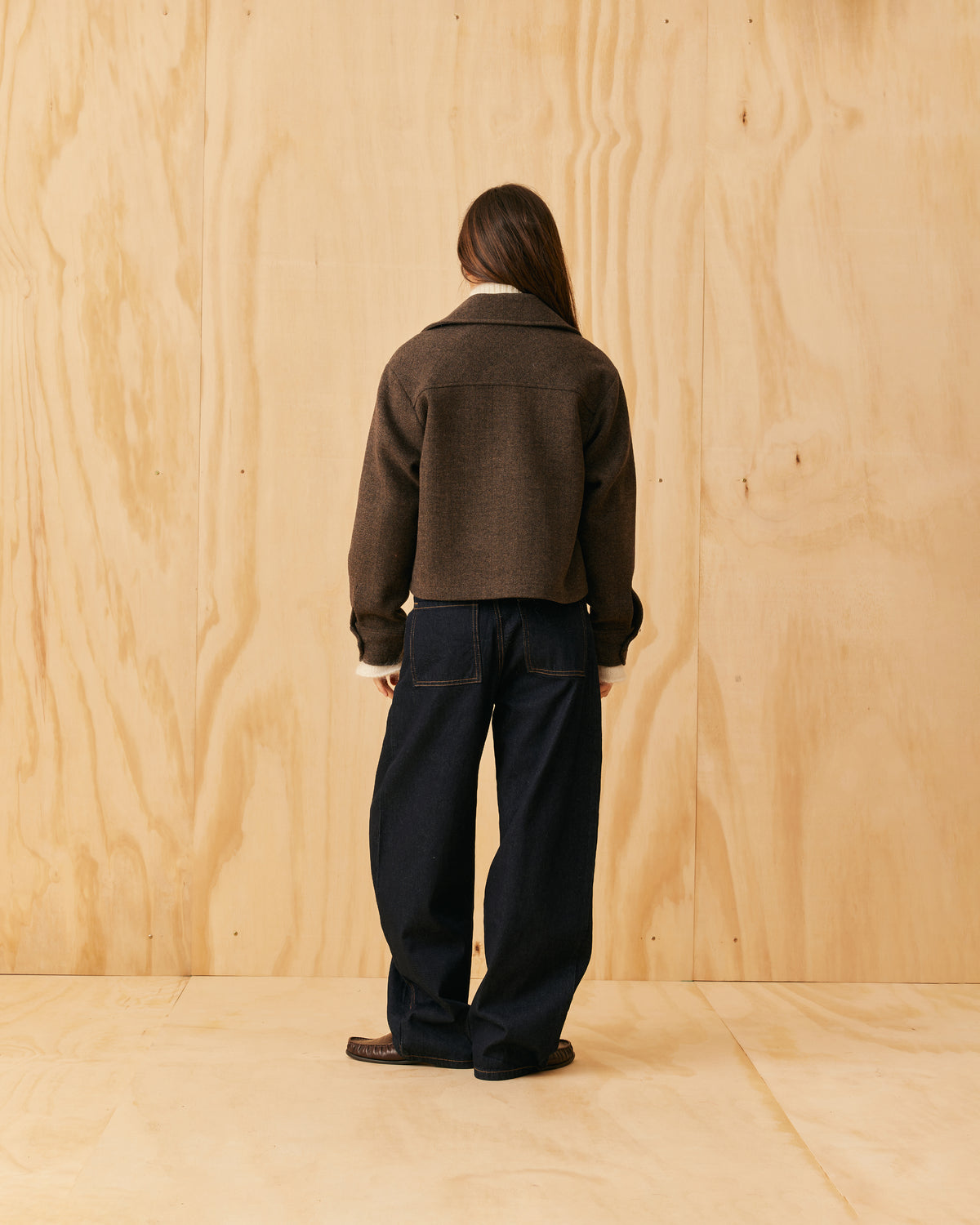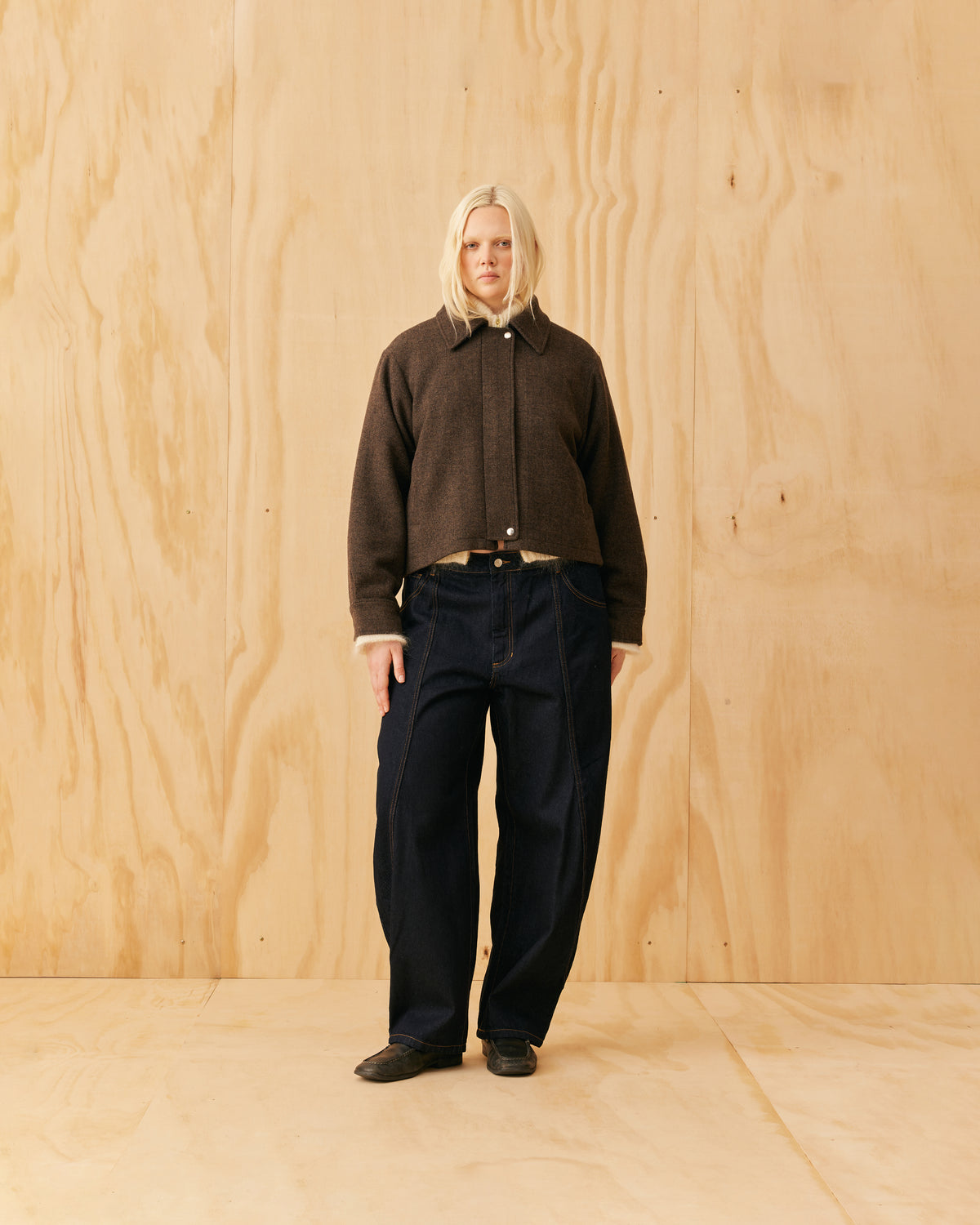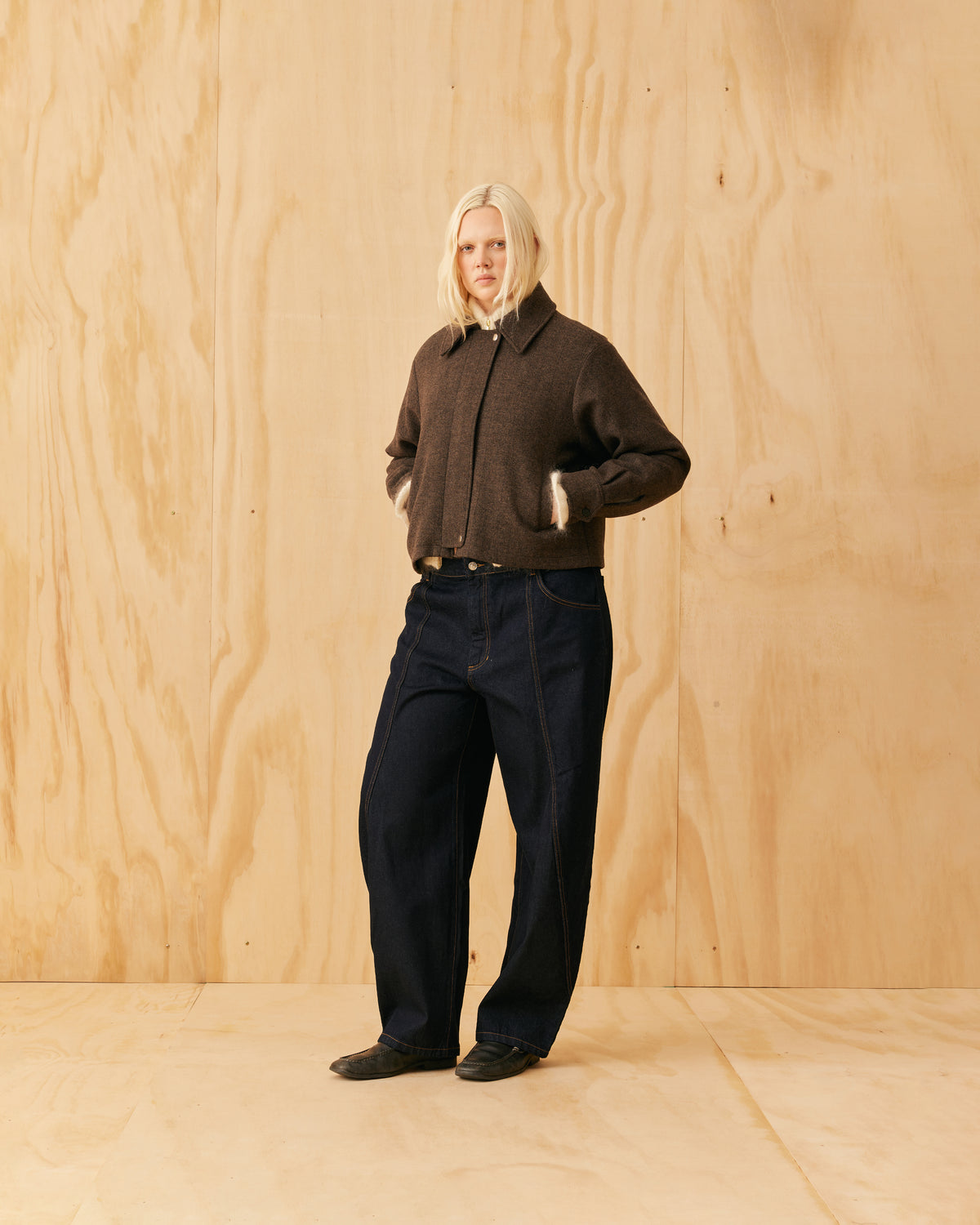 Classic wool jacket with a covered zip front and collar, designed in a heavyweight herringbone fabric. This jacket sits boxy and a bit cropped, and features cuffs at the sleeve which create a slight balloon shape.