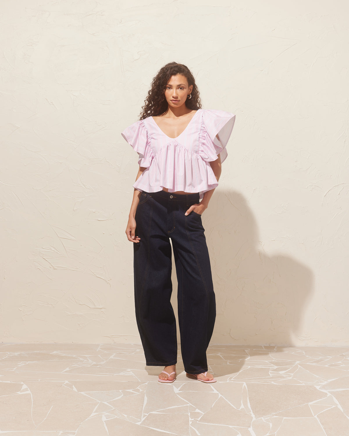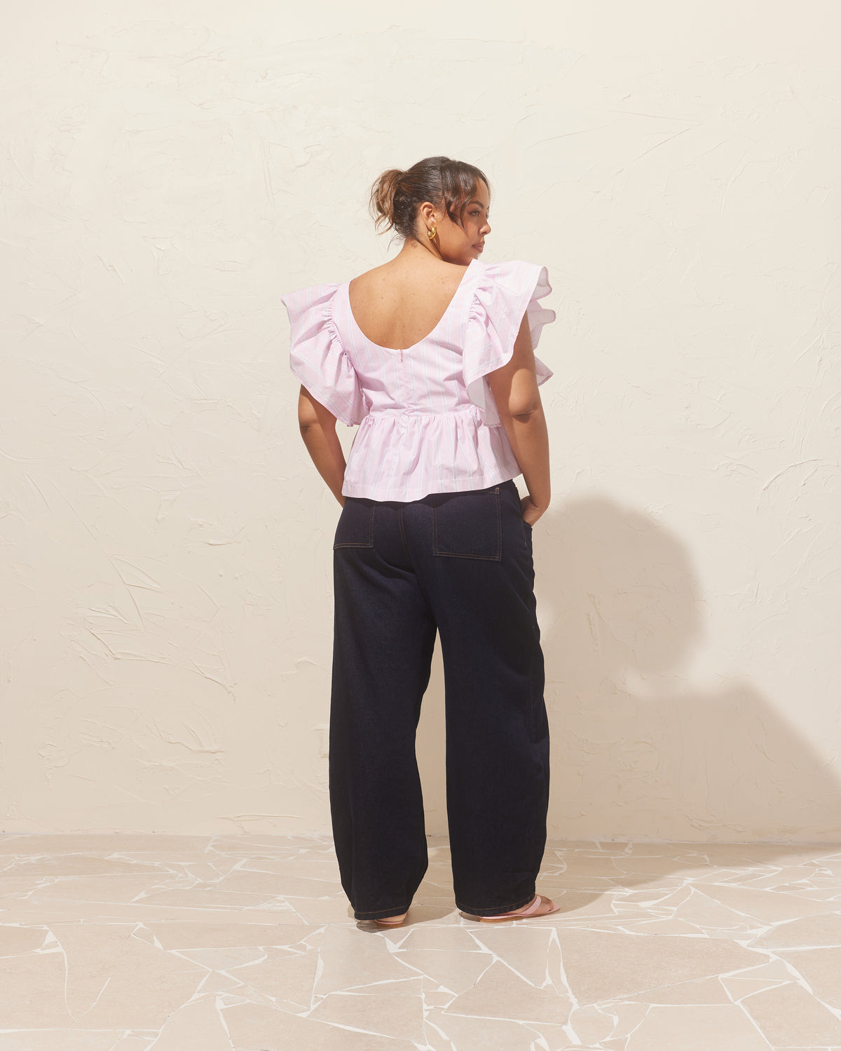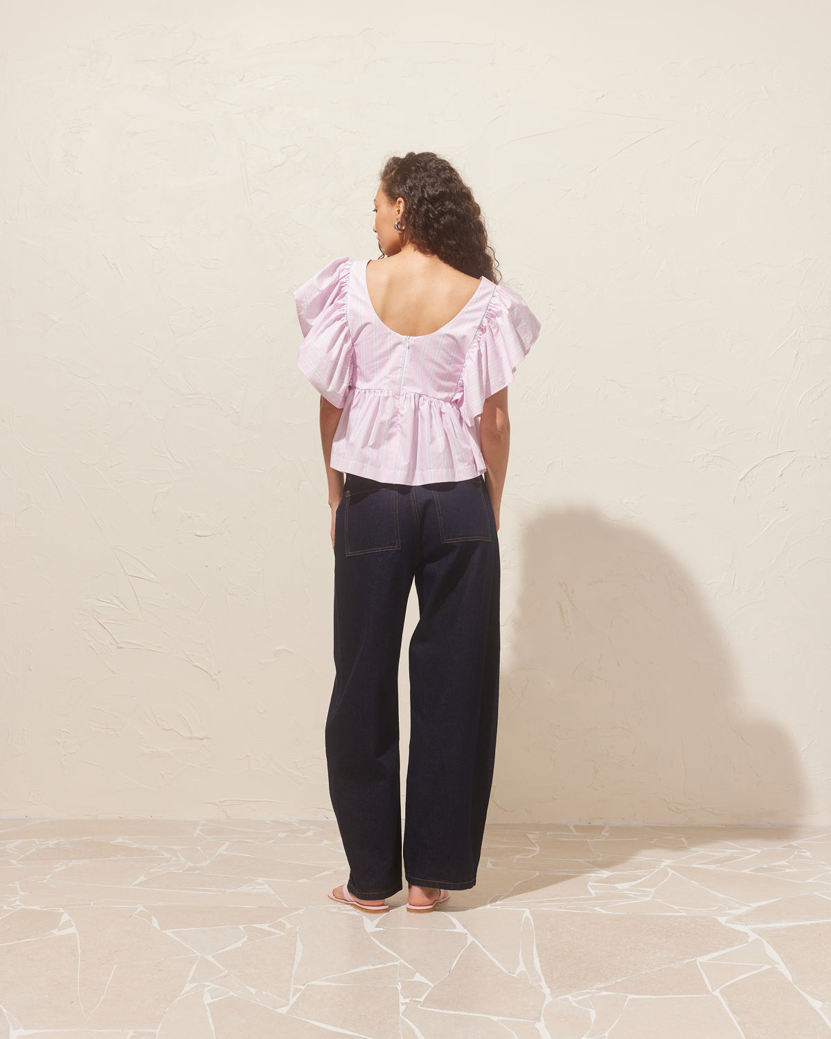 Short sleeve organic cotton blouse, design with feature ruffled sleeves and a ruffle peplum hem. This top has bust shaping and a v-neckline, which makes for an easy-wear style.