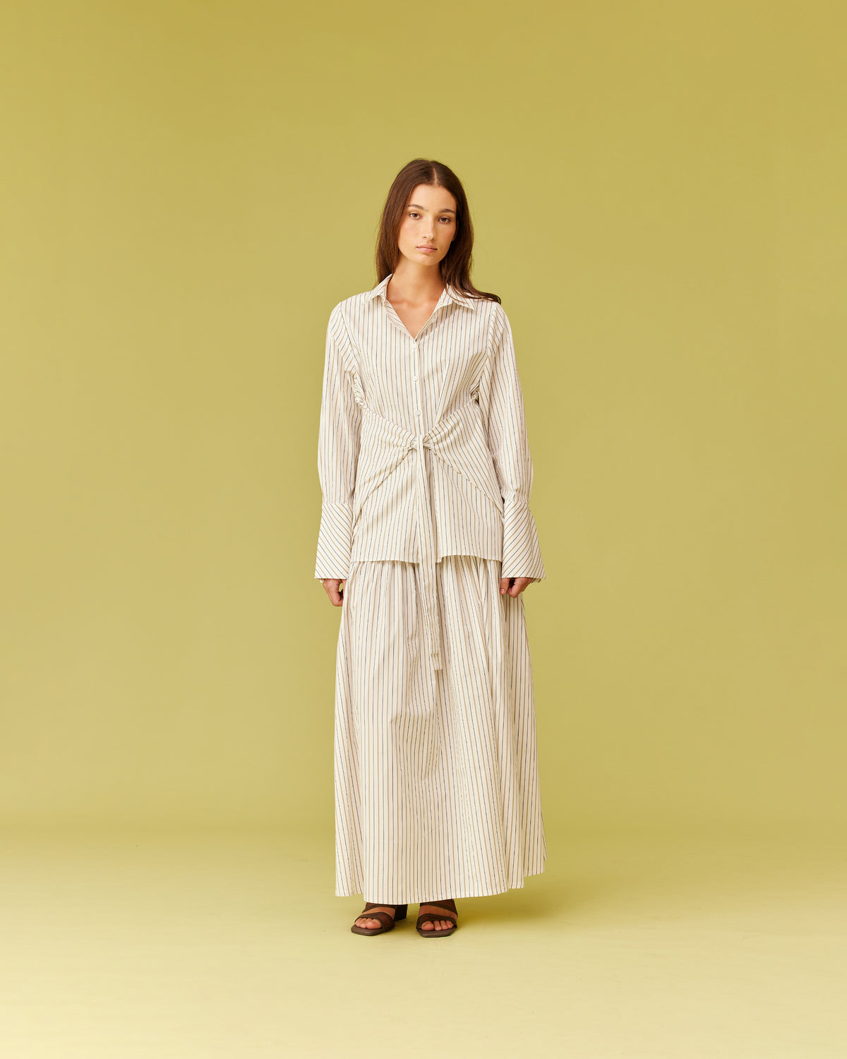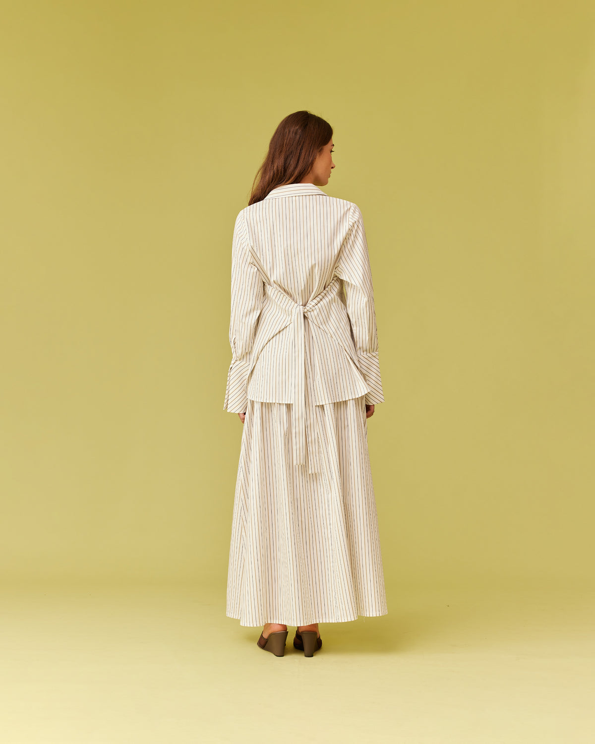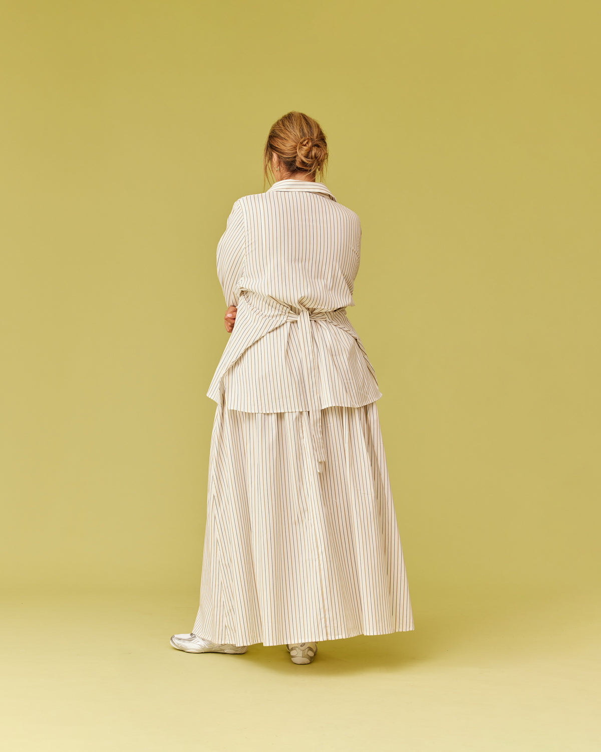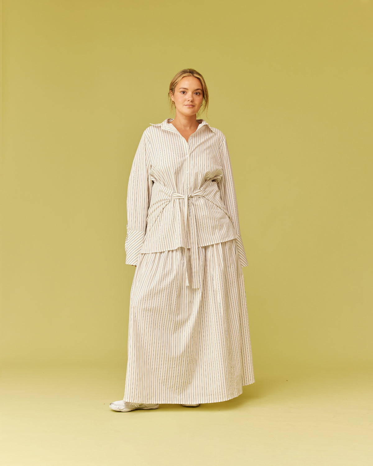 Long sleeve organic cotton shirt designed in our dune stripe. Featuring a side panel wrap design which can be tied in the front or the back for a cinched look. Make it a matching set with our Trulli Skirt.