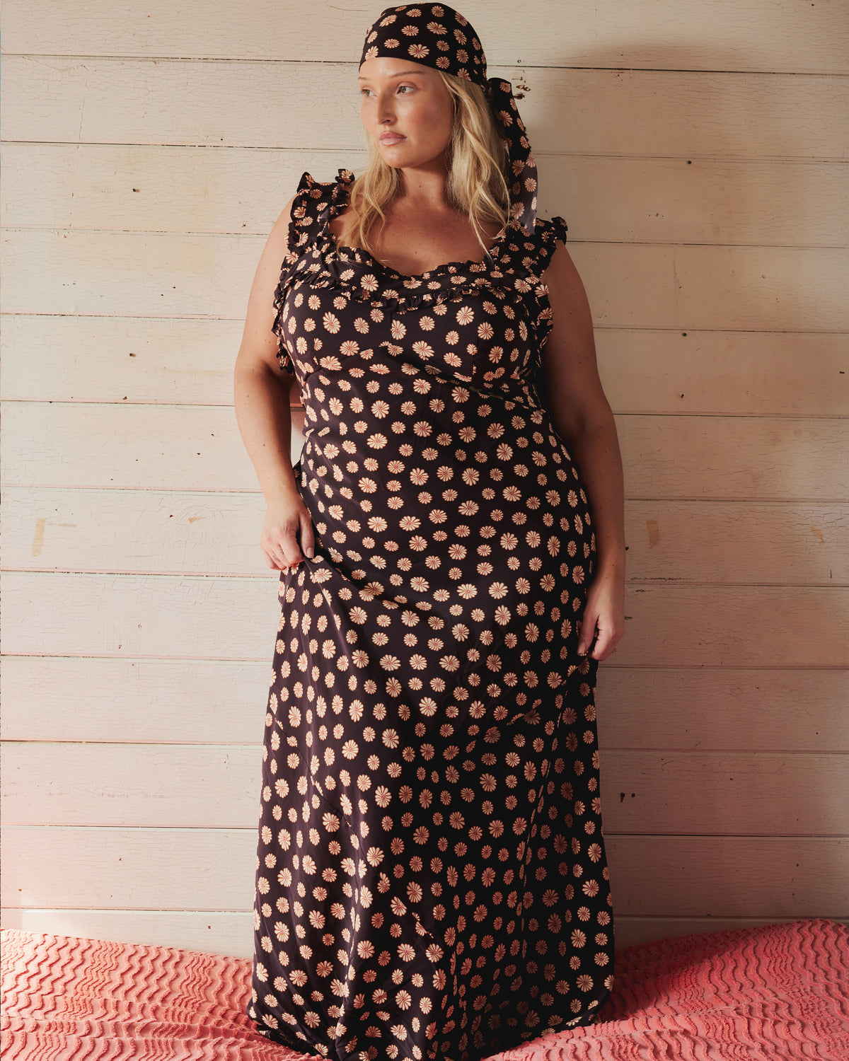 Maxi slip dress with ruffle details, designed in our brown ditzy print. With a soft vintage look, this is the perfect lightweight summer dress. Make it set by pairing this dress with our Lydia Head Scarf.