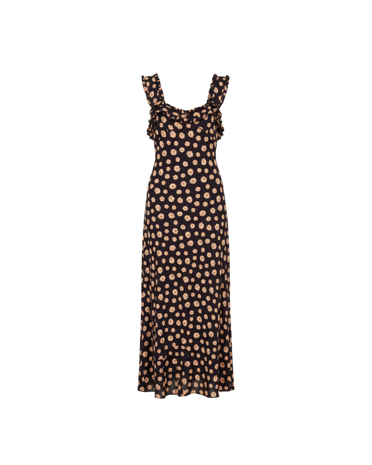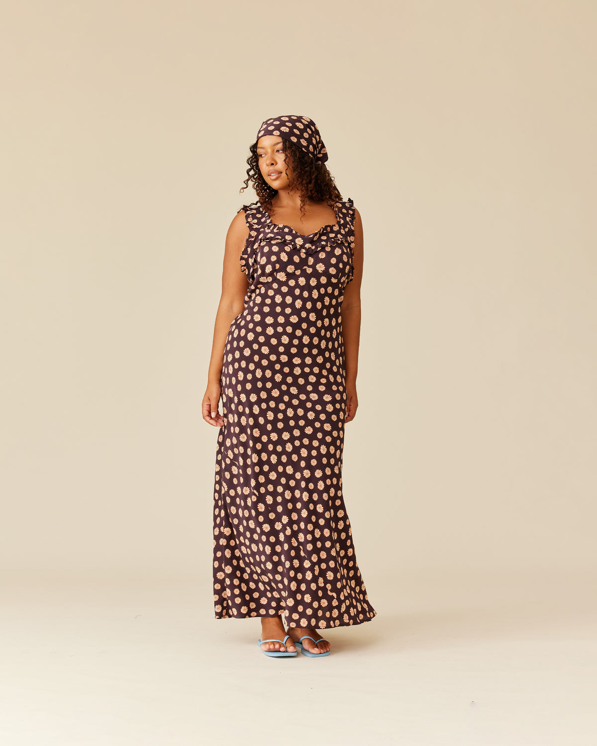 Maxi slip dress with ruffle details, designed in our brown ditzy print. With a soft vintage look, this is the perfect light-weight summer dress.