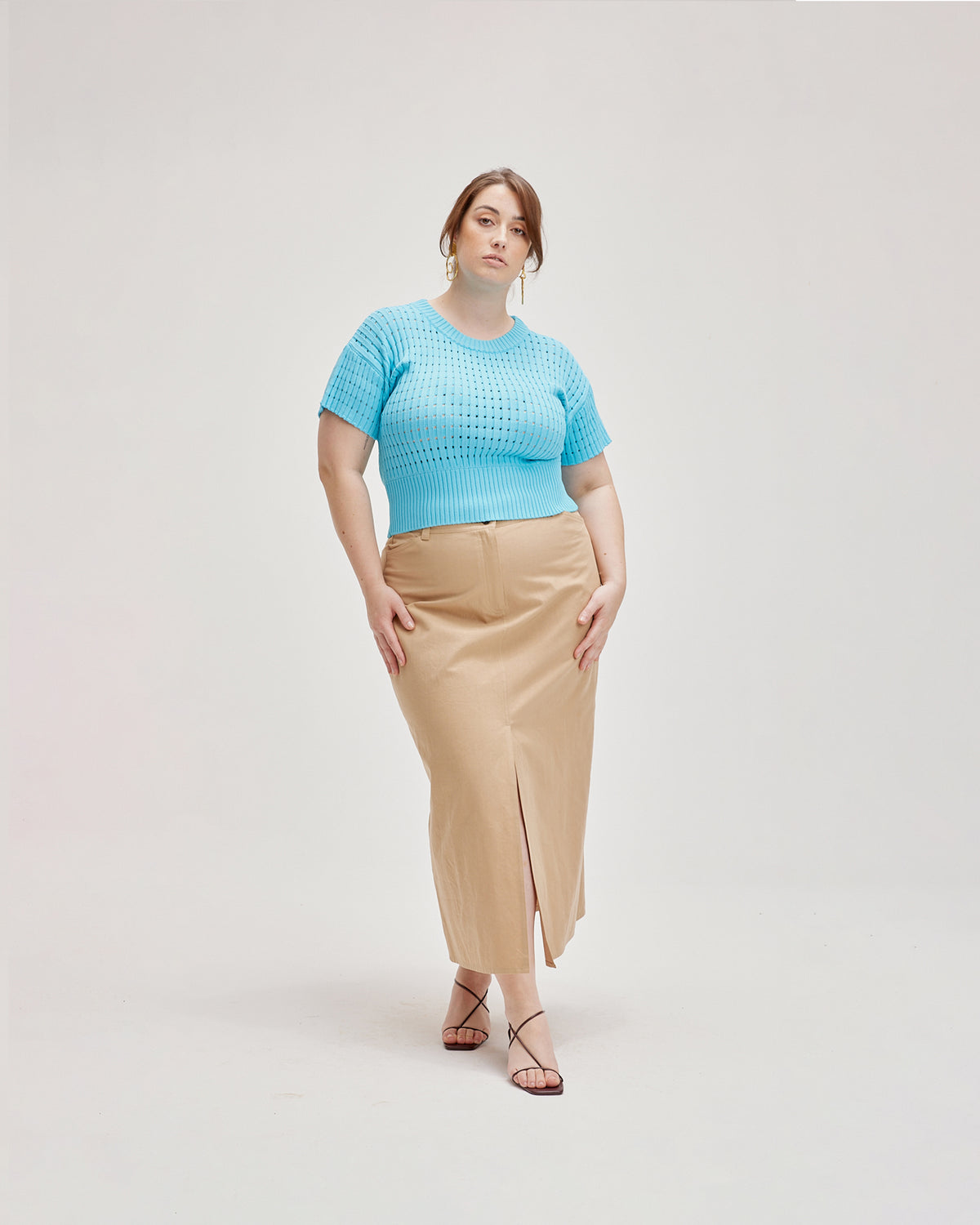 Straight fit midi skirt cut from a mid-weight tan cotton drill. A timeless staple that features a front split for movement and pockets to house your essentials.