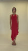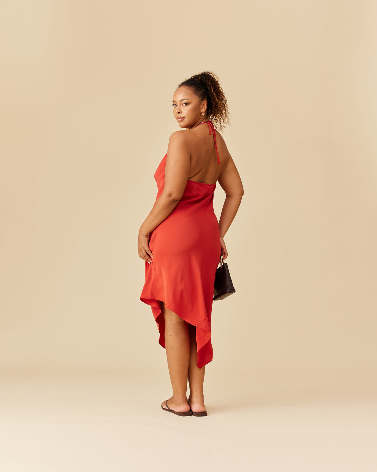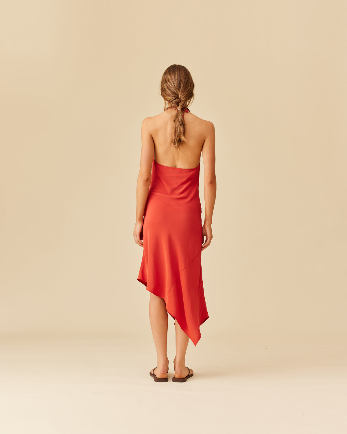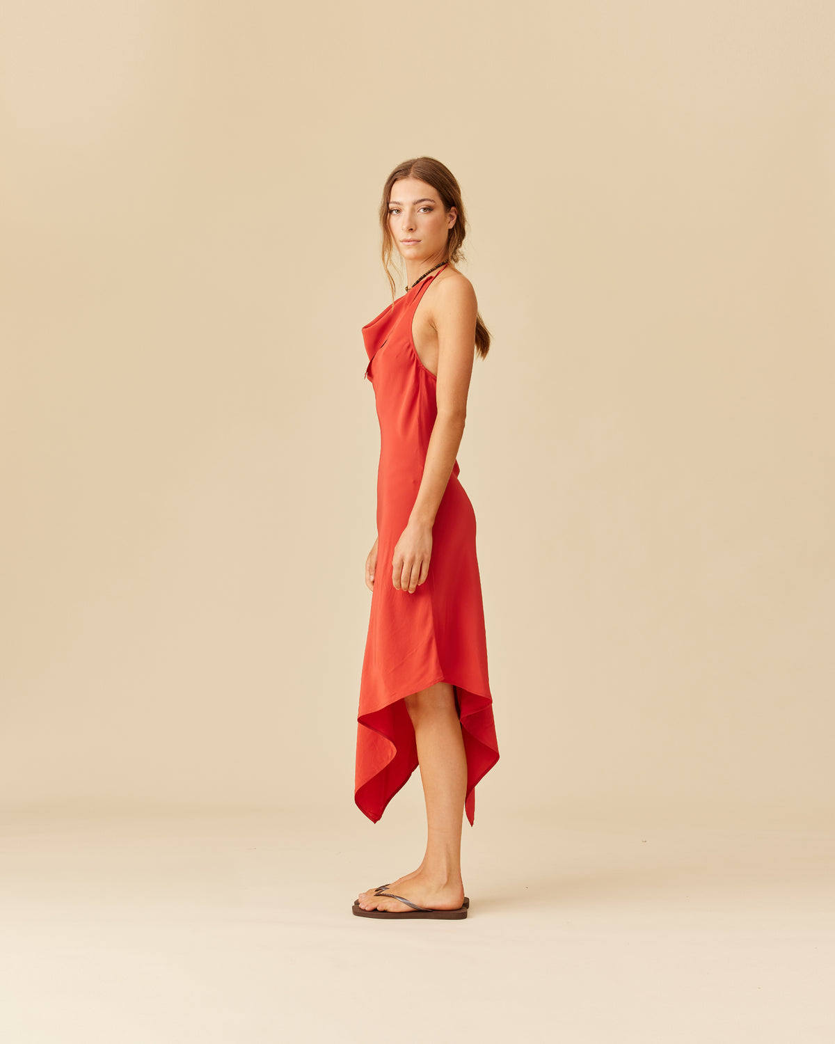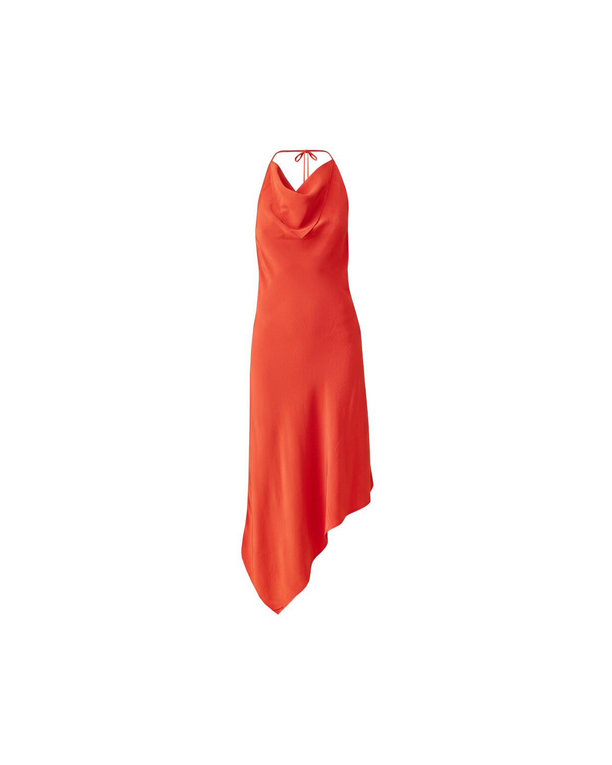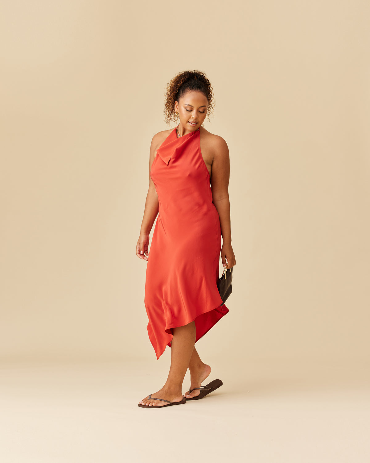 Midi slip dress designed in our firewhirl red colour. This slip features a halter neckline with a handkerchief cowl at the front, and an asymmetrical hem.