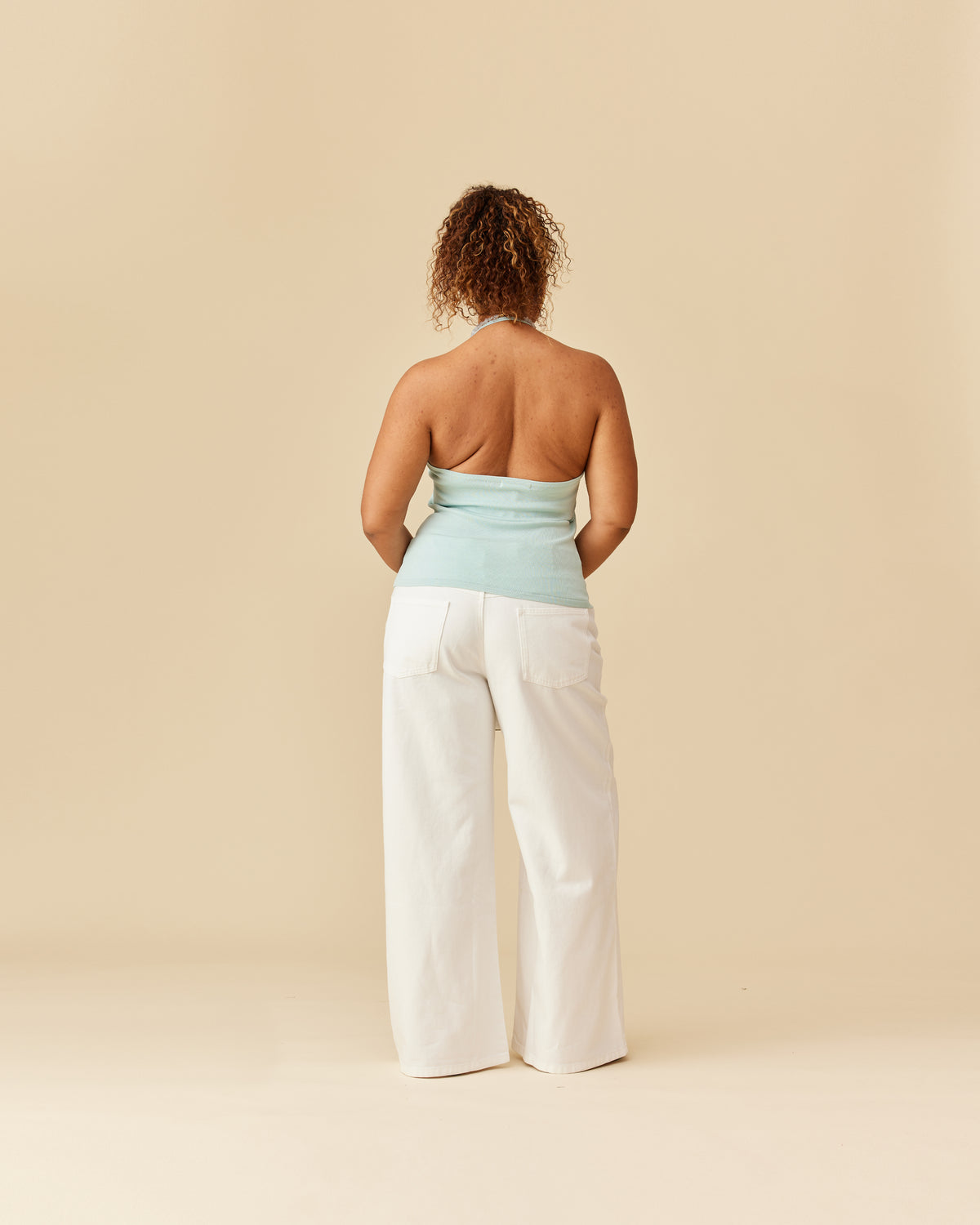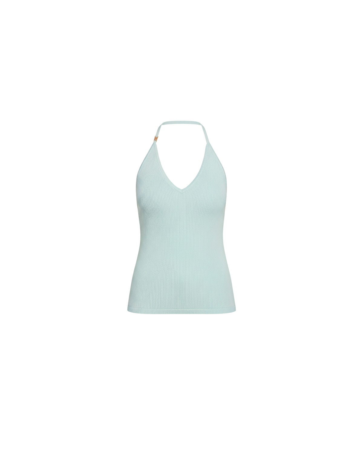 Halter neck tank top designed in a mid-weight knit. Features a gold hardware clip on one side, to elevate this staple piece.