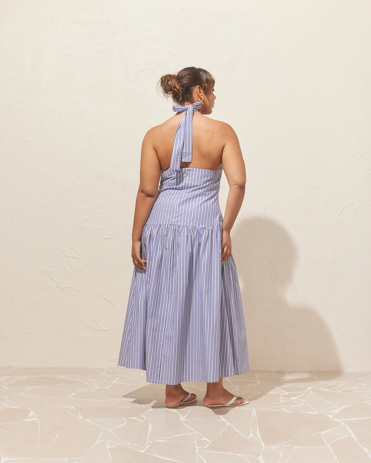 Halter maxi dress designed in a navy striped organic cotton. This dress is fitted through the body, and then falls to a floaty basque-style skirt. Features a bodice-style waistline with a full skirt.