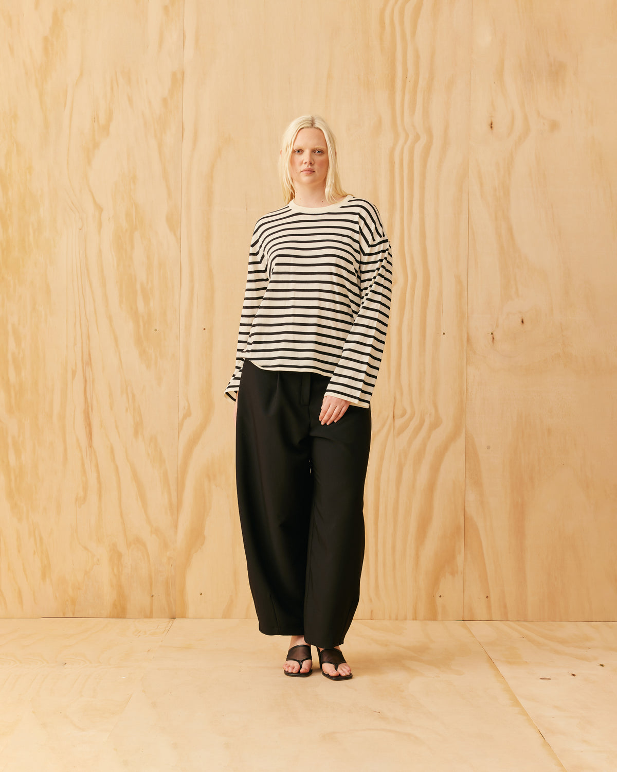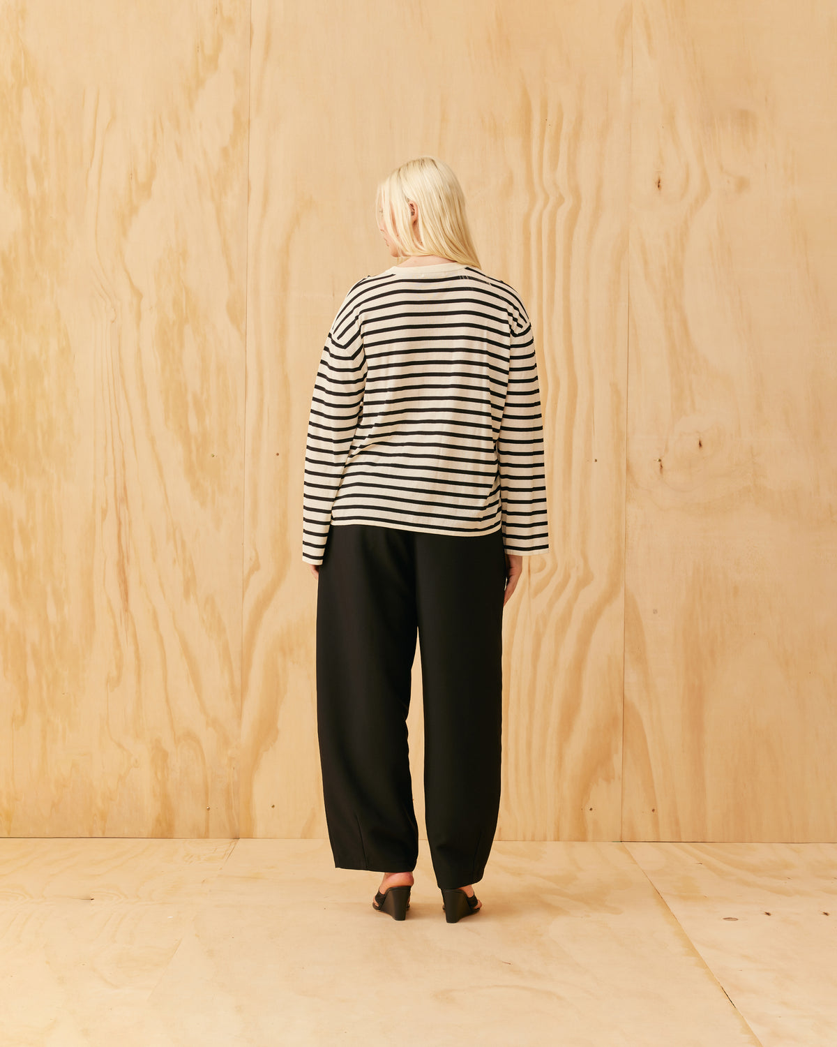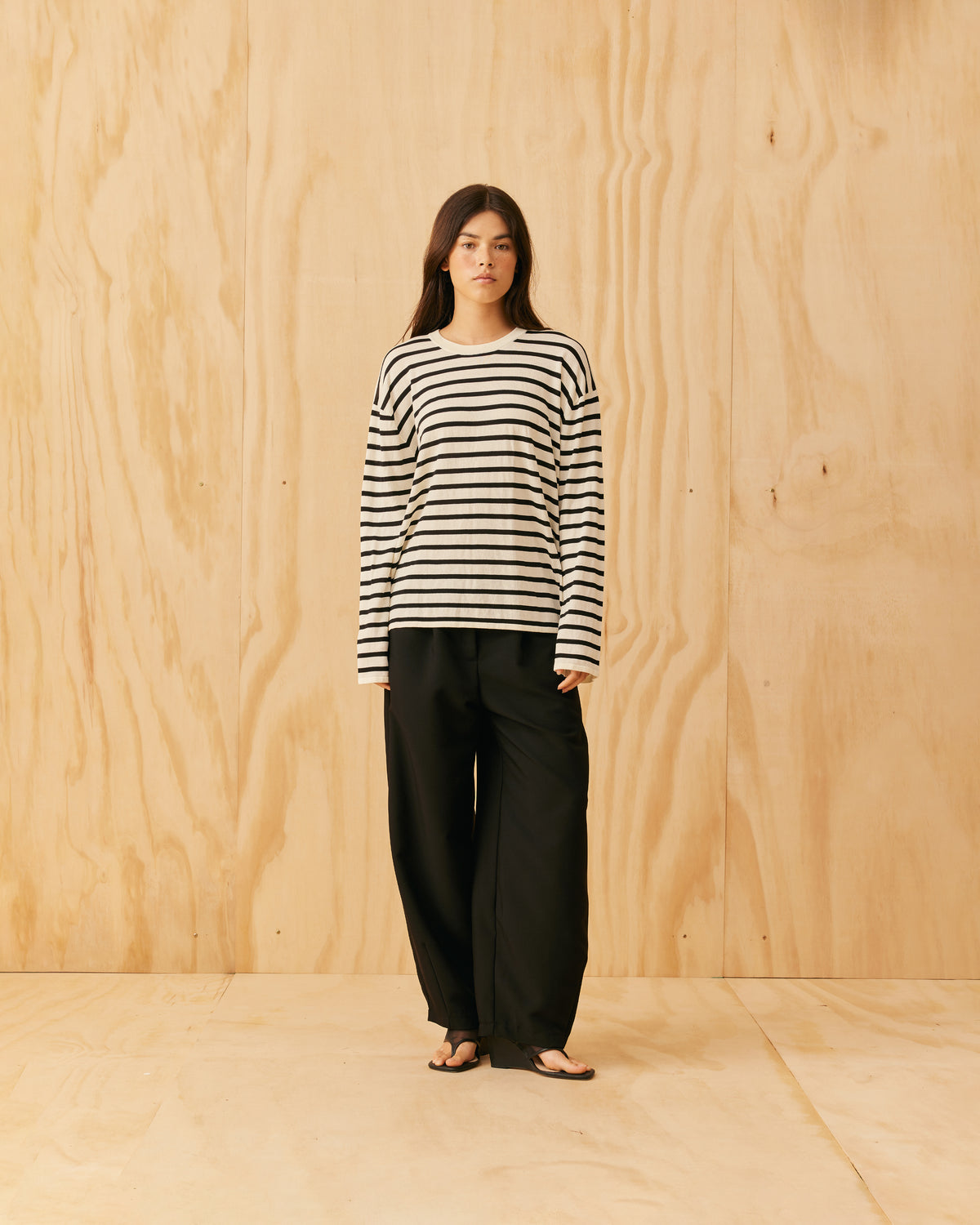 An update of our Minnie Long Sleeve, now with a more relaxed fit designed in a black and white striped knit. This top fits loose throughout the arms and body, and makes for a great wardrobe staple, worn on its own or layered under tops and coats for extra warmth.