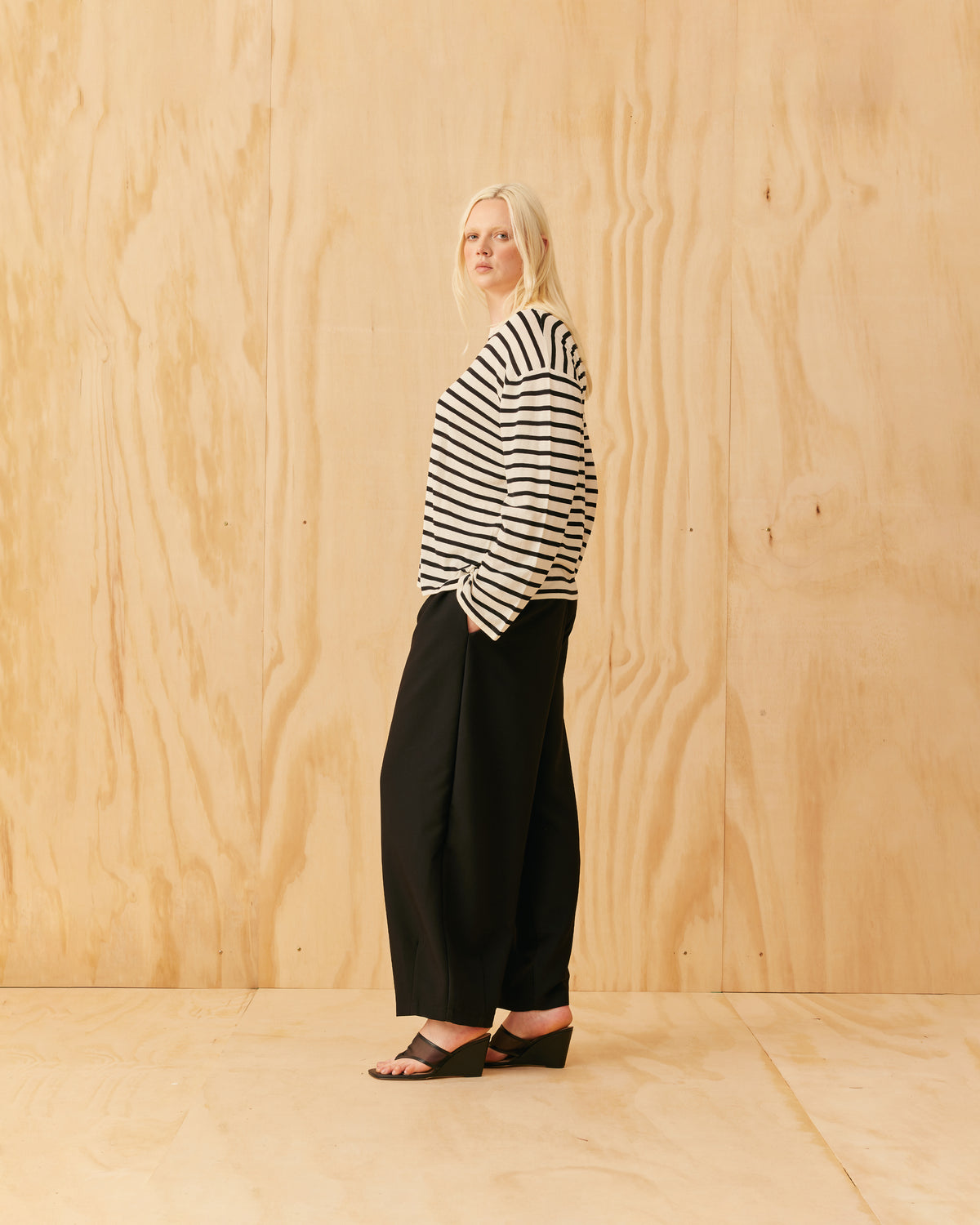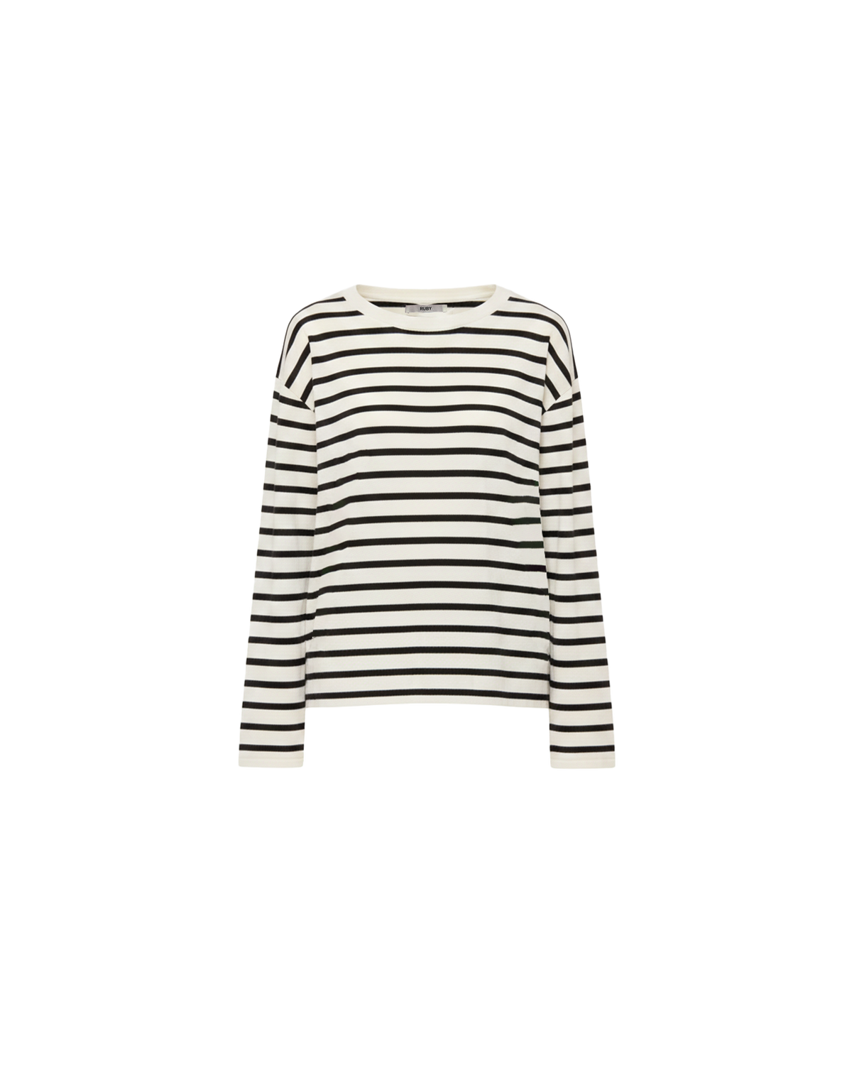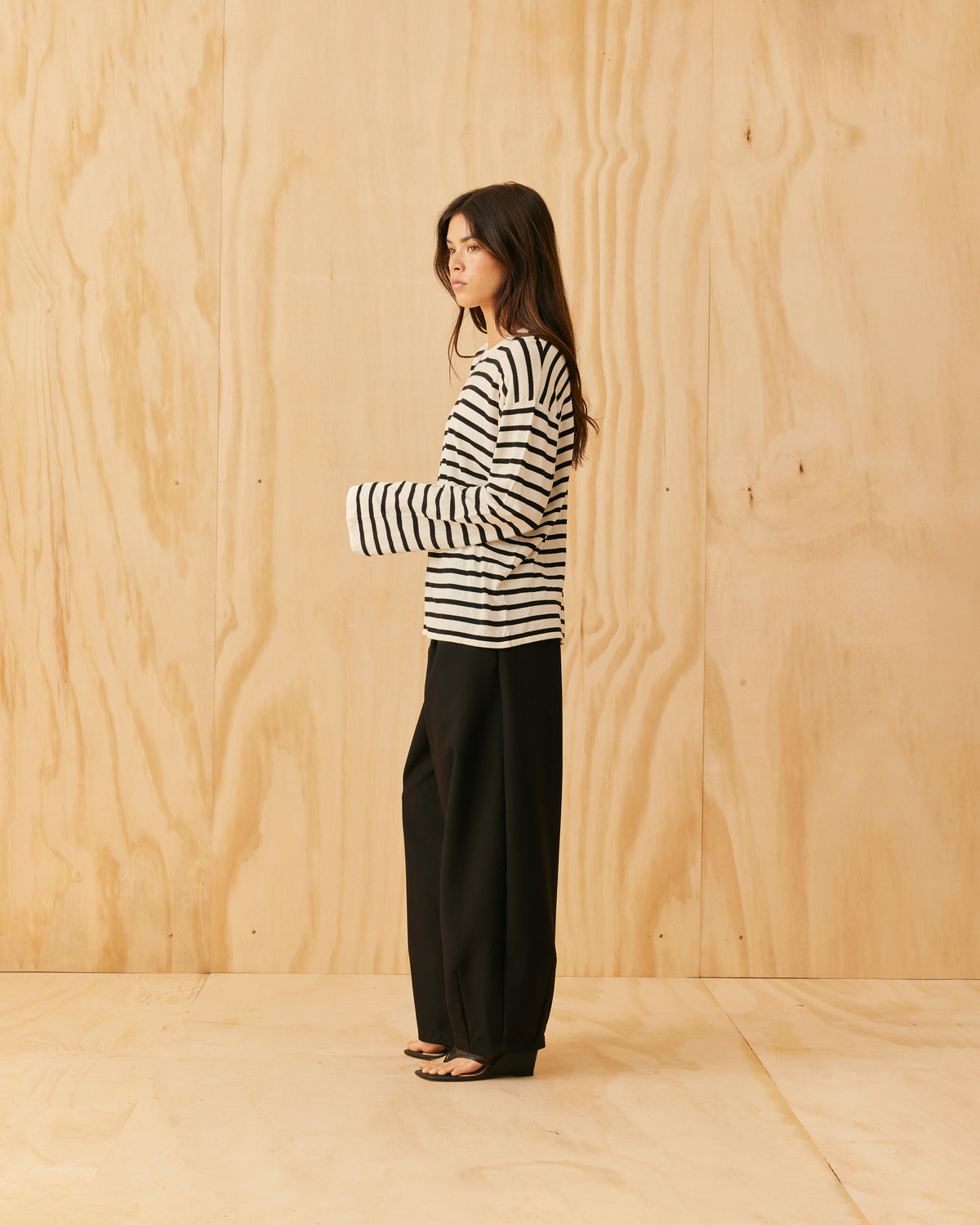 An update of our Minnie Long Sleeve, now with a more relaxed fit designed in a black and white striped knit. This top fits loose throughout the arms and body, and makes for a great wardrobe staple, worn on its own or layered under tops and coats for extra warmth.