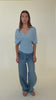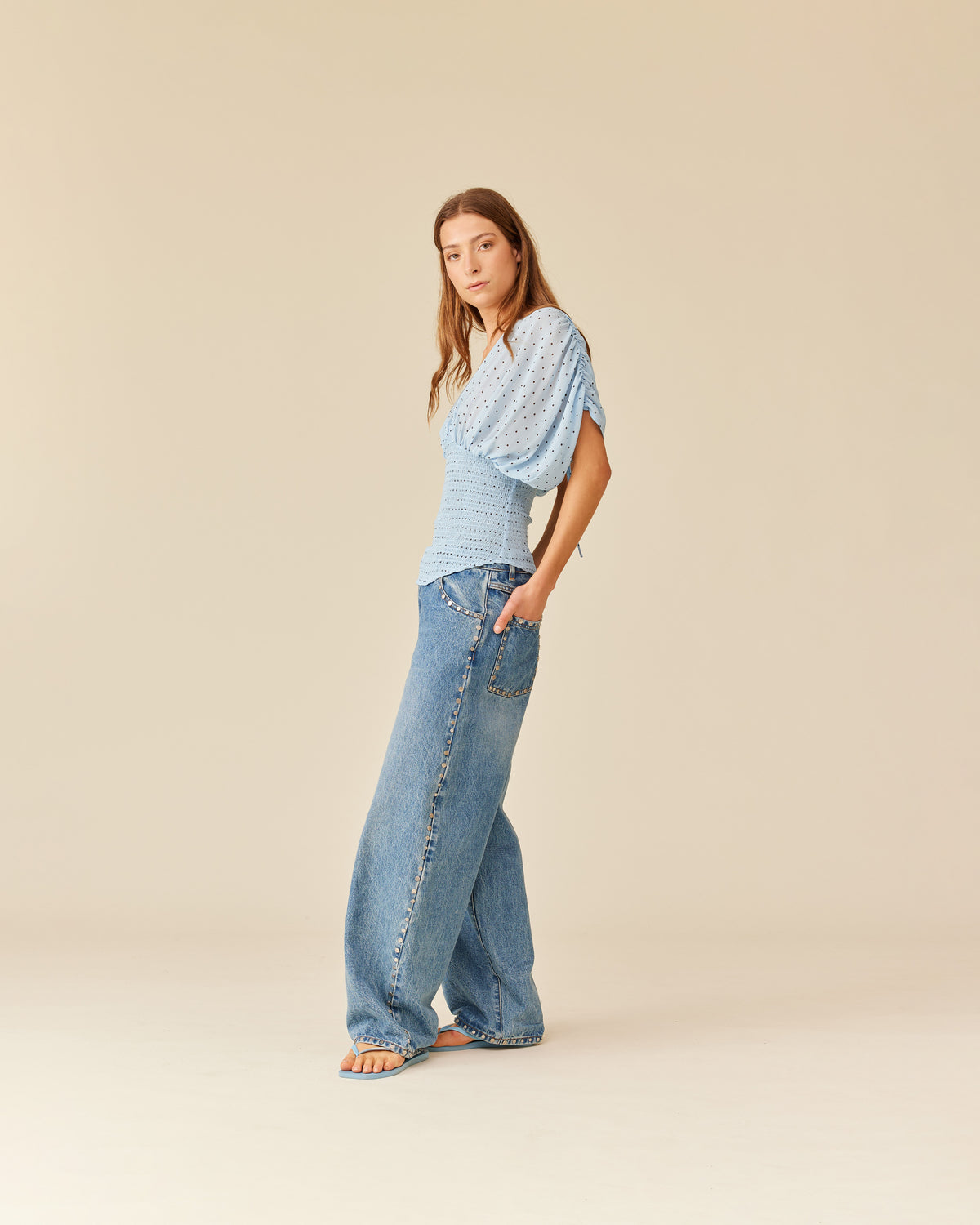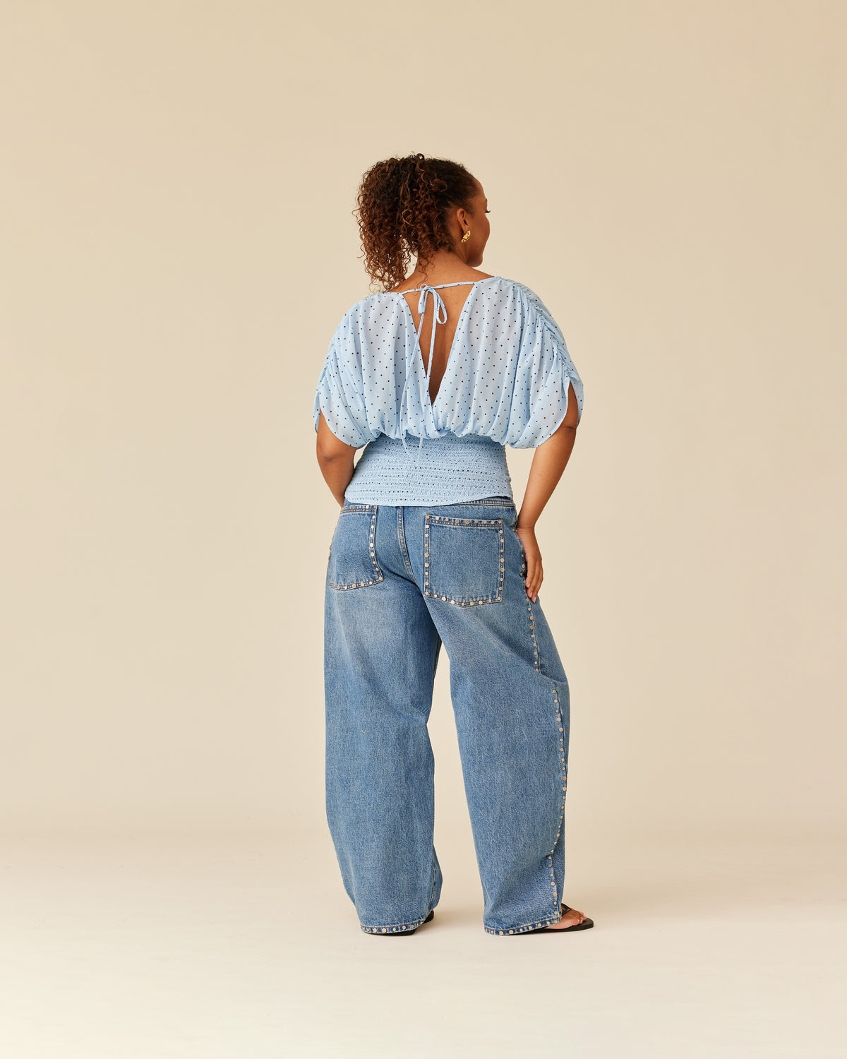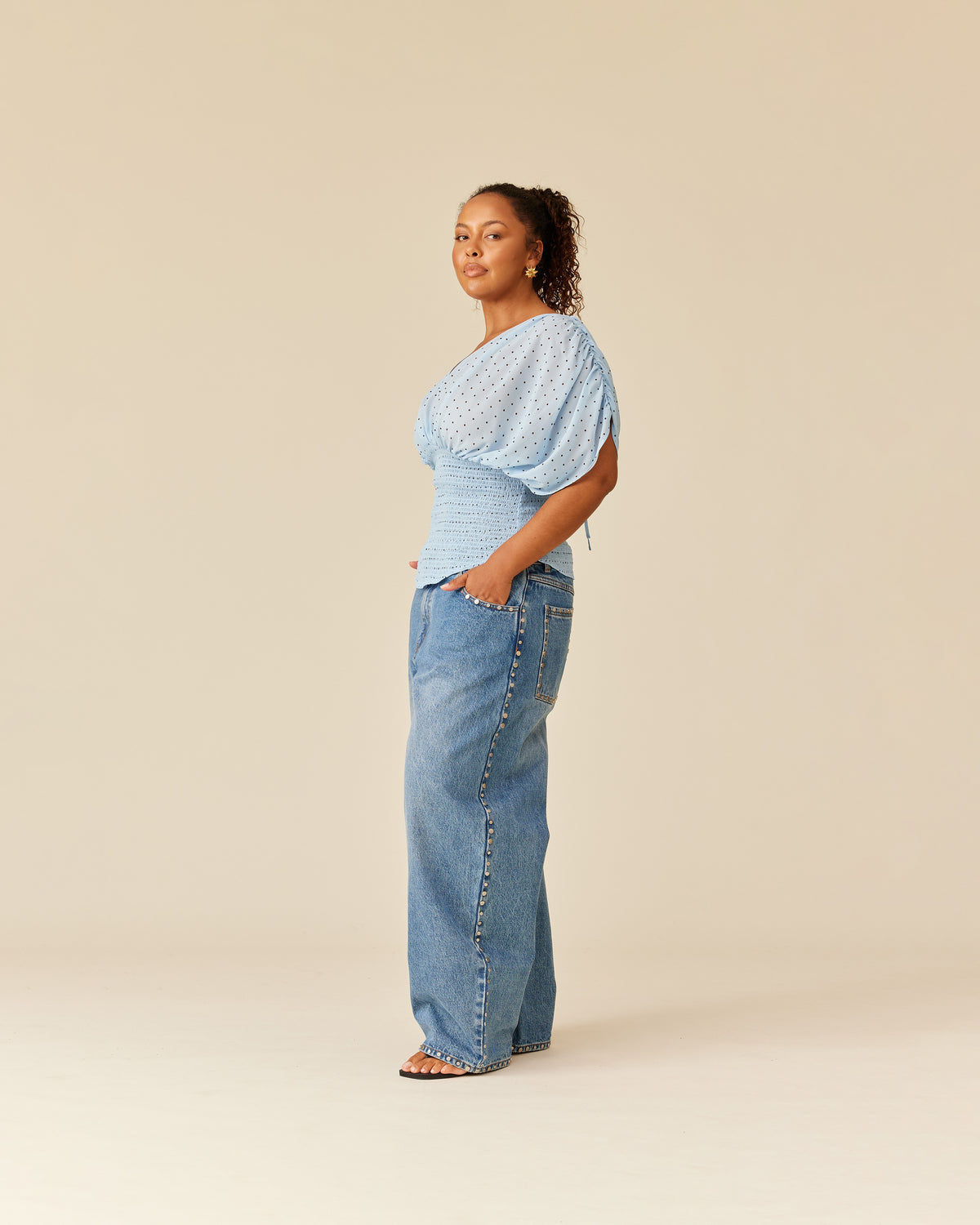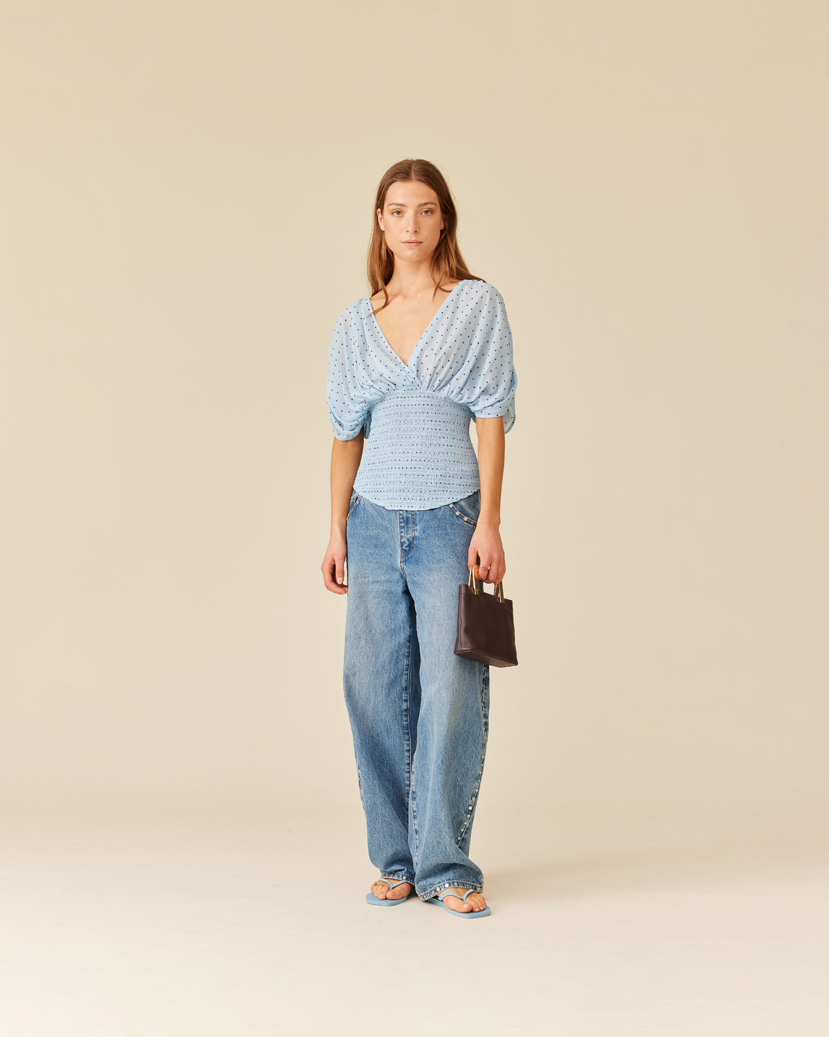 Blue polka dot chiffon top with a shirred bodice and draped batwing sleeves. The perfect top to pair with denim or your favourite skirt.