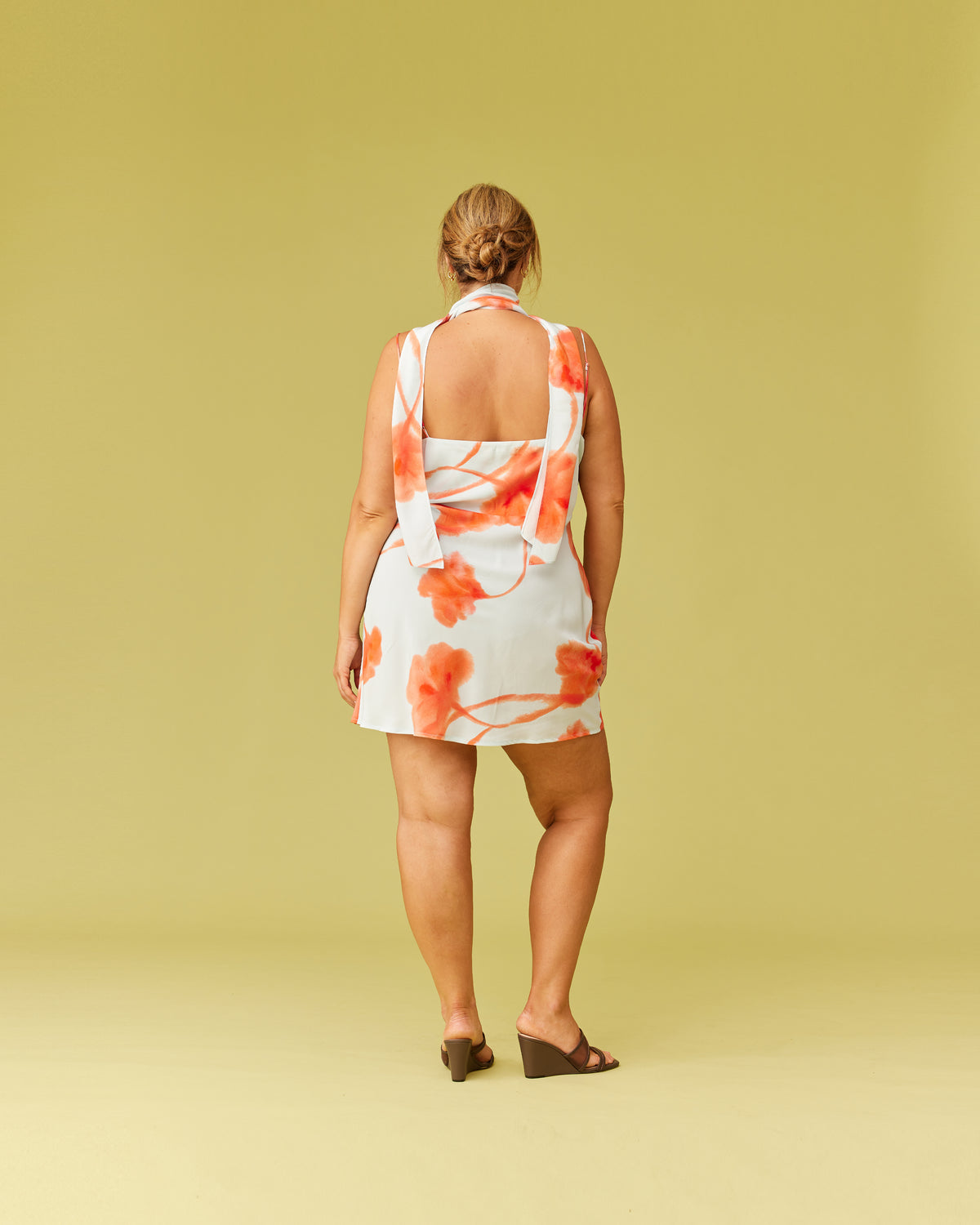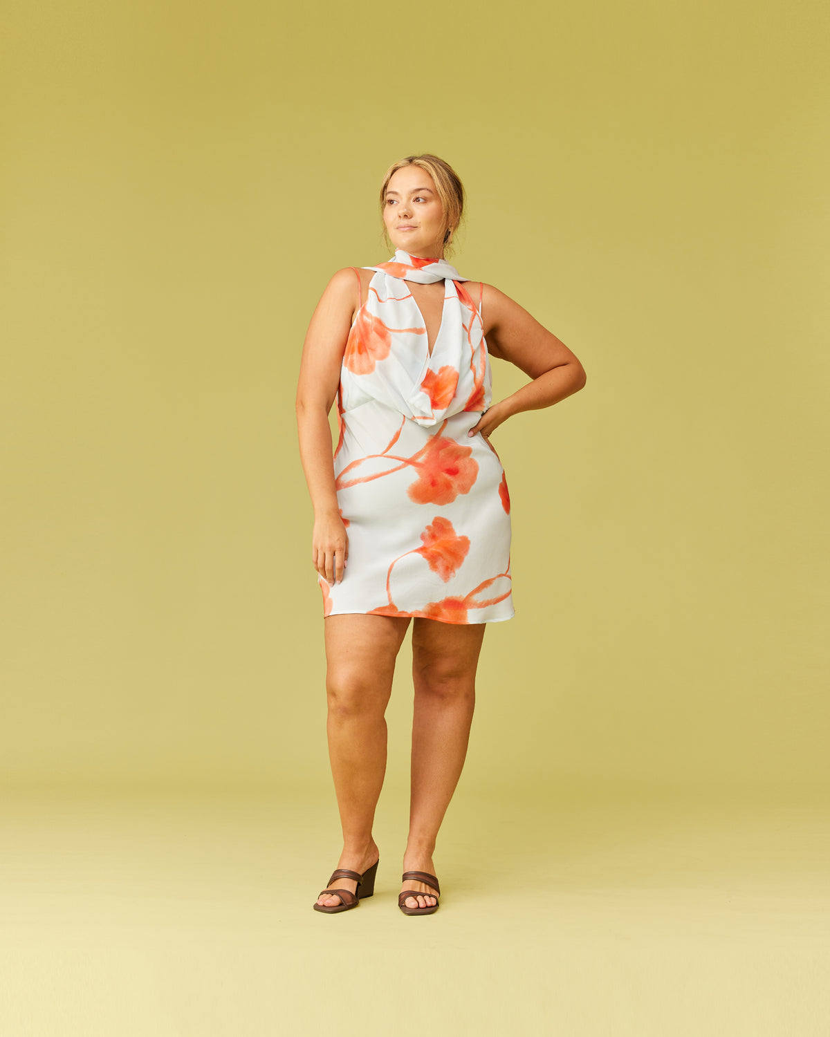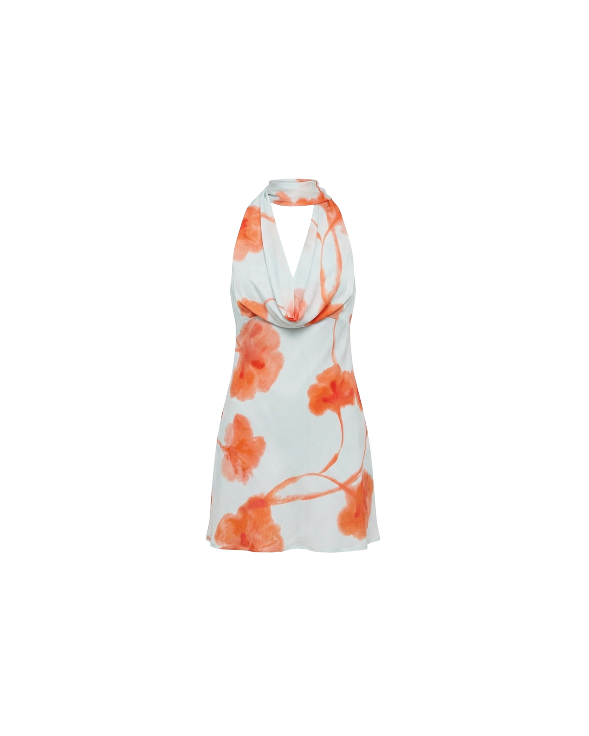 Bias cut mini dress designed in a blue lagoon viscose. This dress features a built in bust panel that you can wear around the neck as a scarf, tied at the back, or over the shoulders for a cowl neck effect.