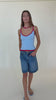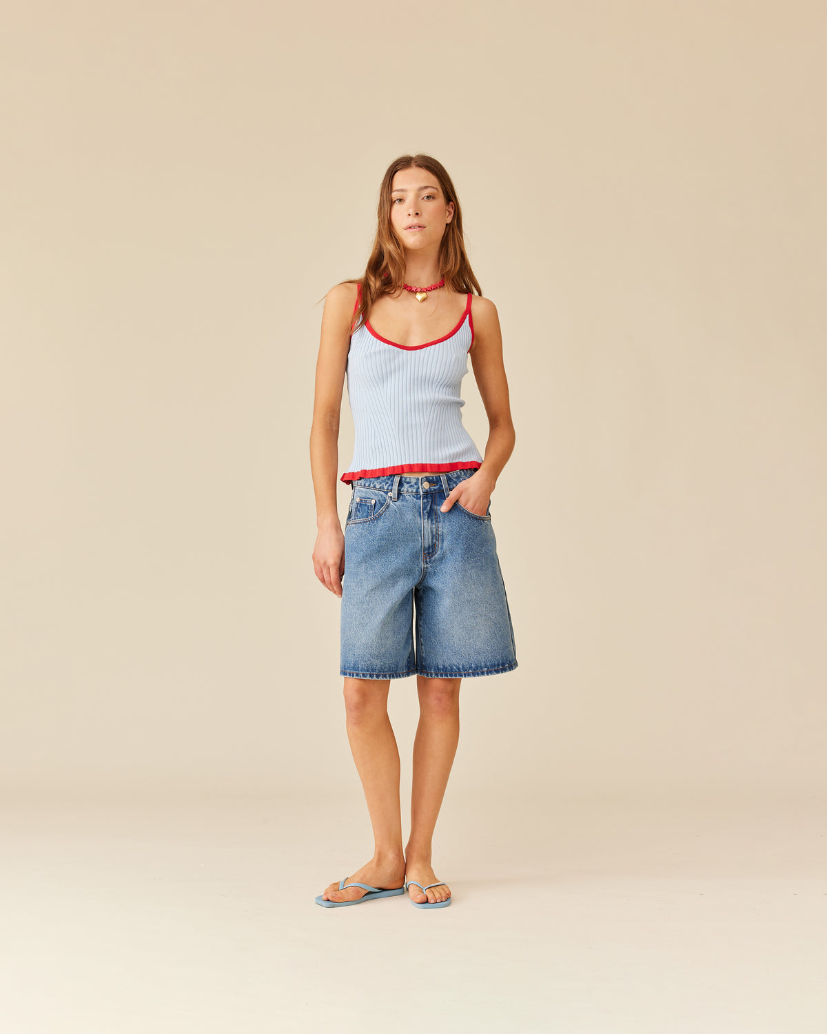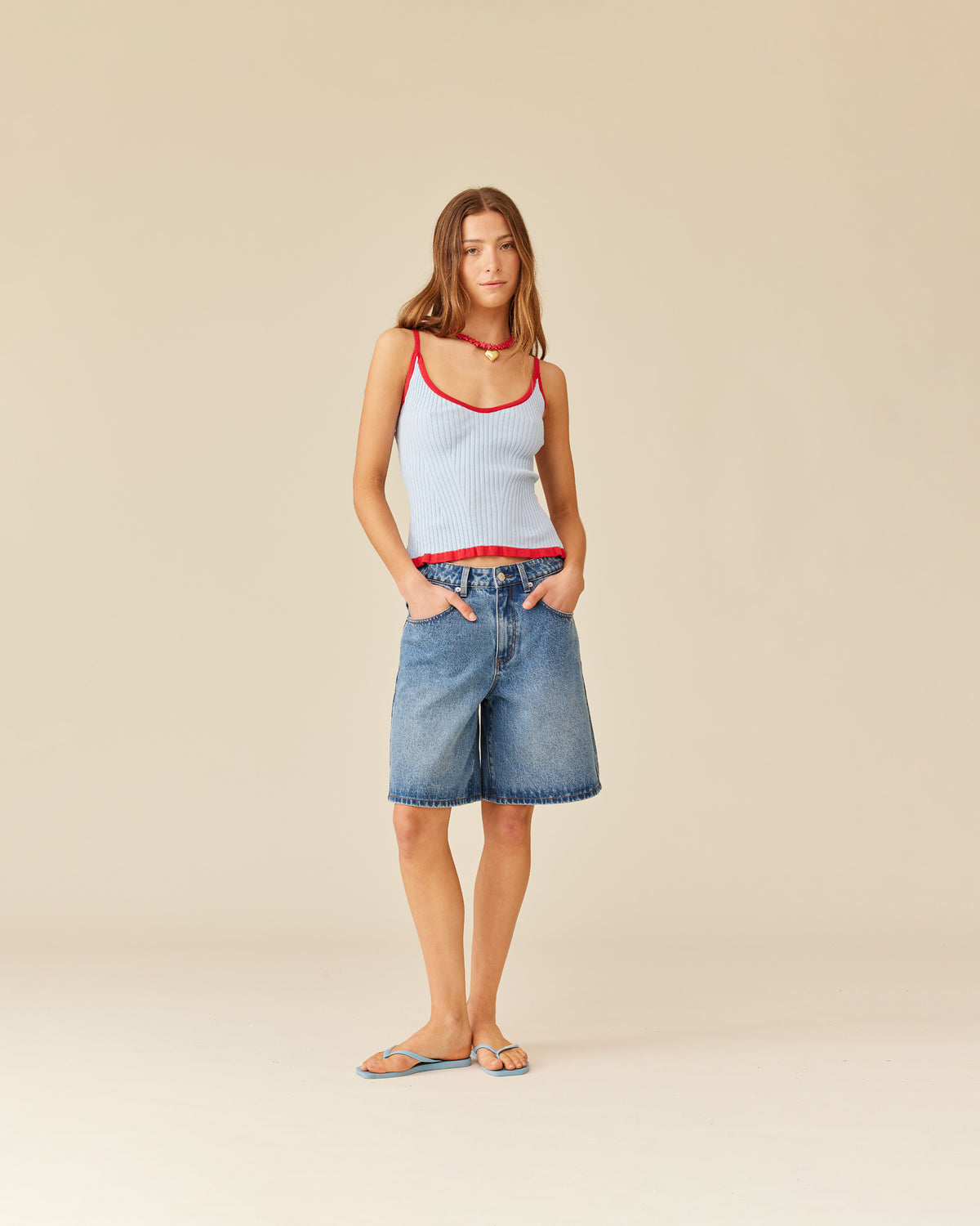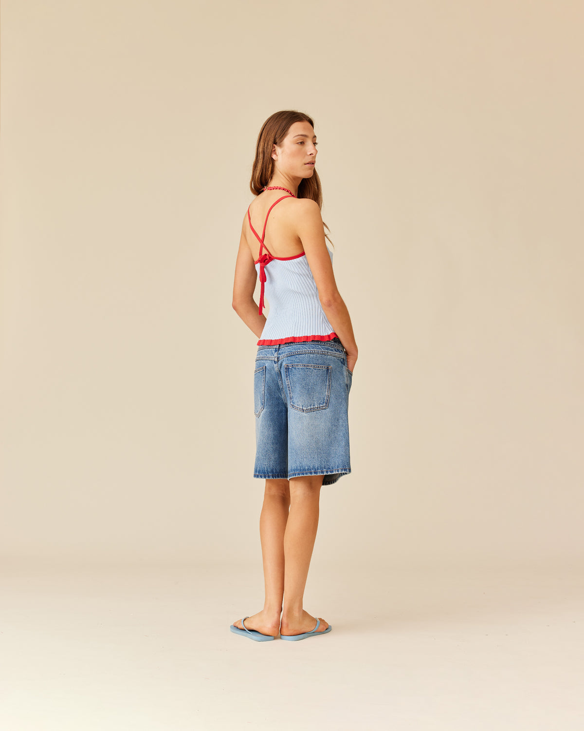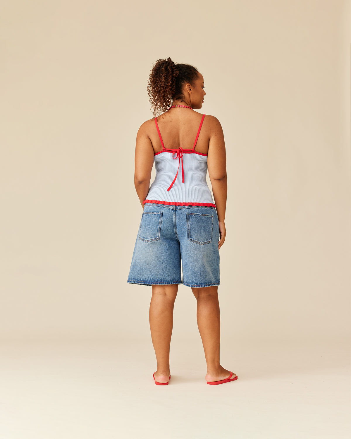 Ribbed knitted tank top designed in a contrasting blue and cherry colour way. This staple tank can be worn many ways by adjusting the straps, giving you 4 options in 1.
