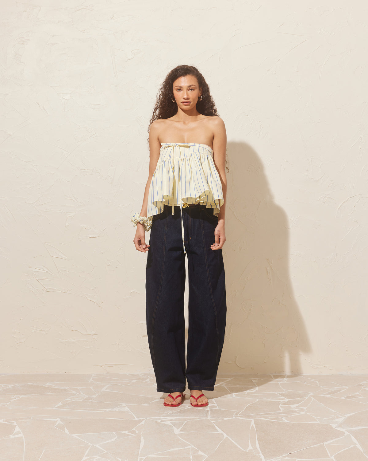 Ballerina-inspired wrap mini skirt designed in a crisp butter and navy striped cotton. This skirt can be styled over pants, on its own or, you can even try tying the wrap as a bodice top.