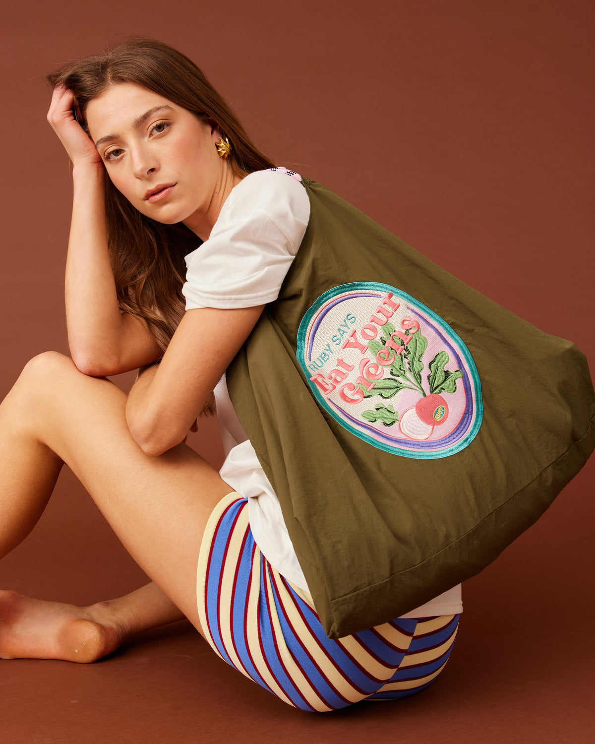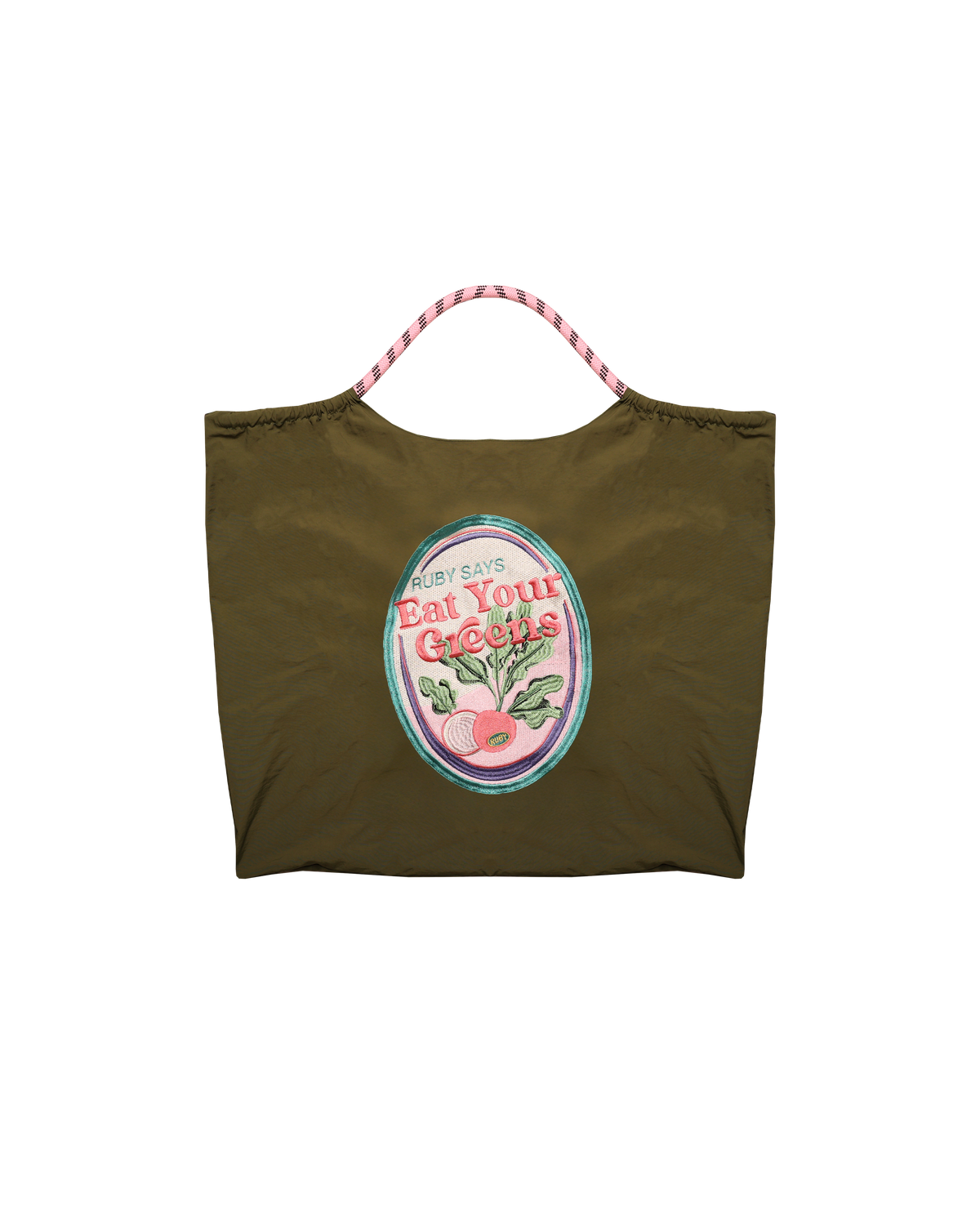 RUBY accessories accessories__bags FULL-PRICE gift-shop gift-shop__beachware gift-shop__summer-essentials green new OFF-BAN quiz RESORT 1 resort-2025 ruby-giftshop under100 under150 add-to-cart https:files/RUE157_1.jpg 43172195238094 ONE SIZE 69.00 https: https://rubynz.com/products/ruby-says-eat-your-greens-tote-khaki?variant=43172195238094 InStock ONE SIZE
