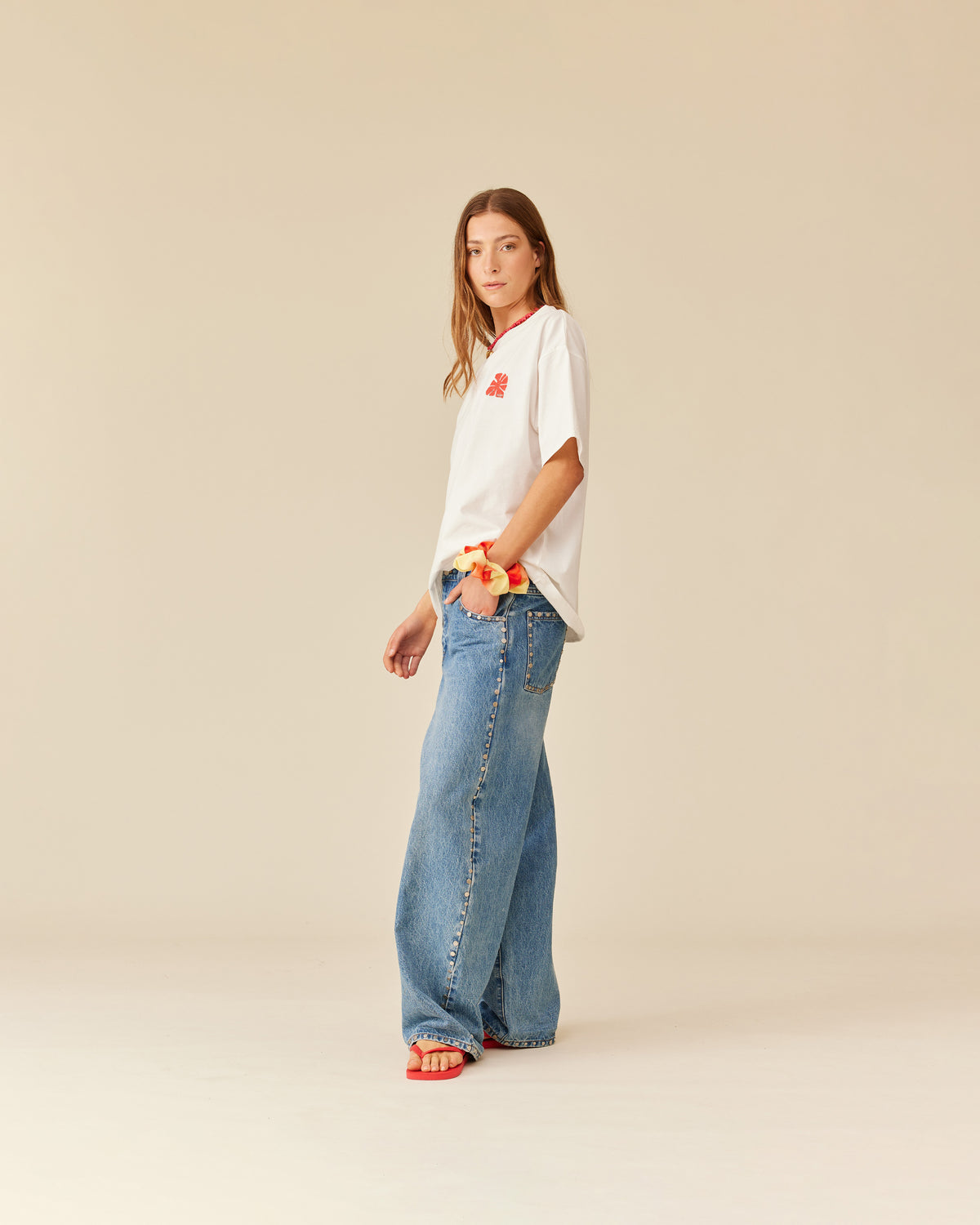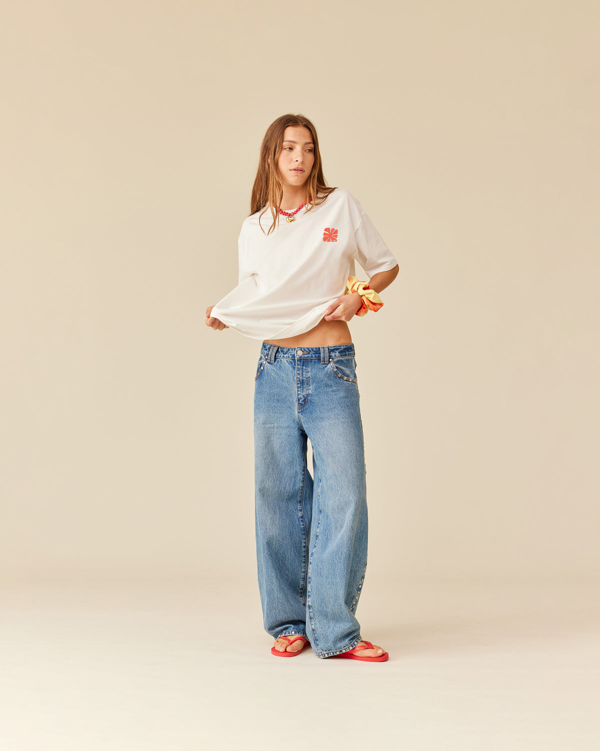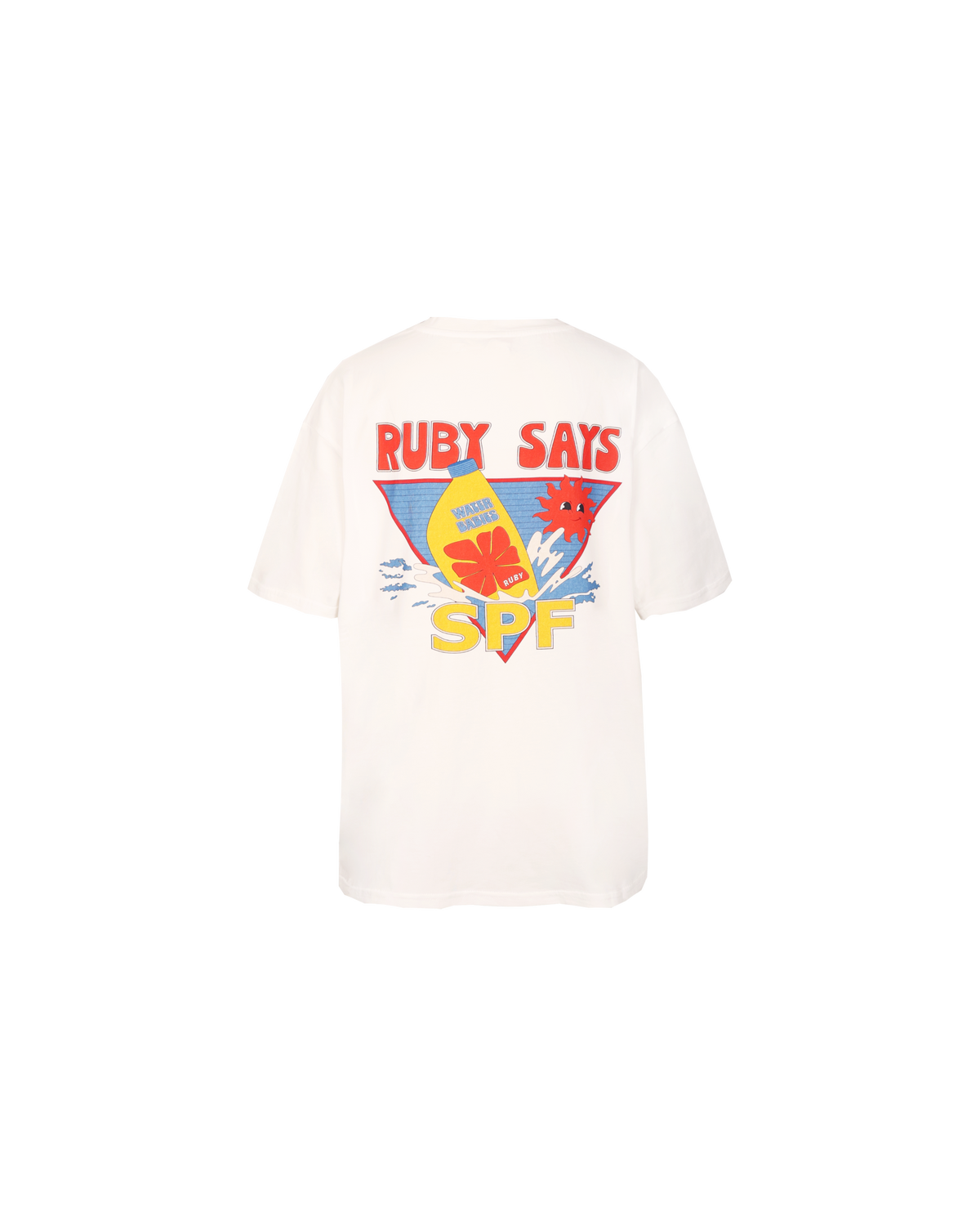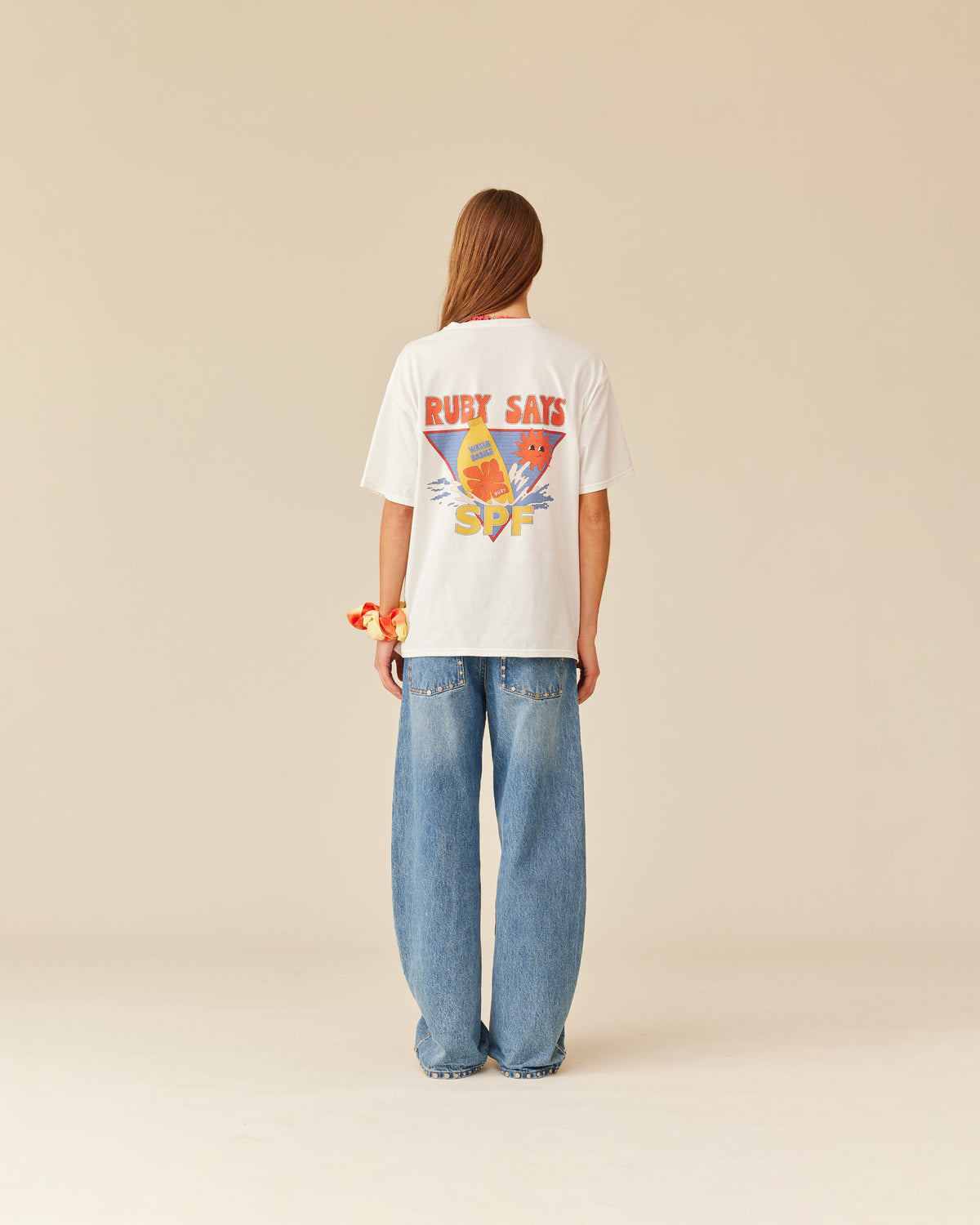 Cotton t-shirt with a feature RUBY Says SPF design screen printed on the back. The perfect vintage looking summer t-shirt.