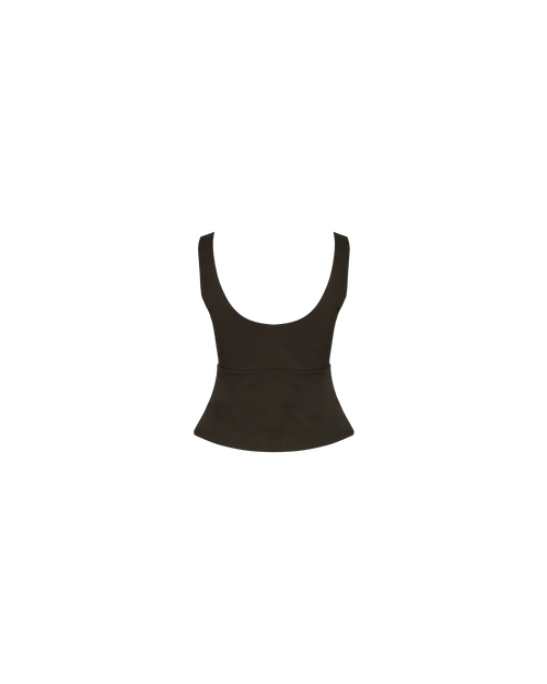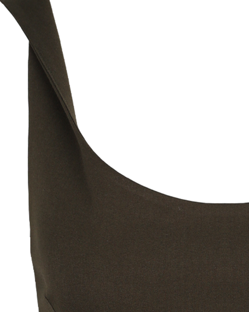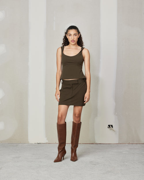 Sleeveless bodice style cami with a round neckline designed in a khaki mid weight fabric. Features a twist detail at the straps and a curved hemline that compliments the bodice cut.