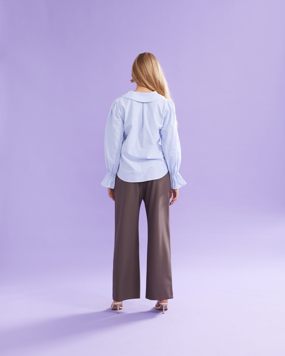 Long sleeve blue striped shirt with ruffles down the placket and a rounded collar. This top features elasticated ruffle cuffs, this piece is an elevated take on the classic shirt shape.
