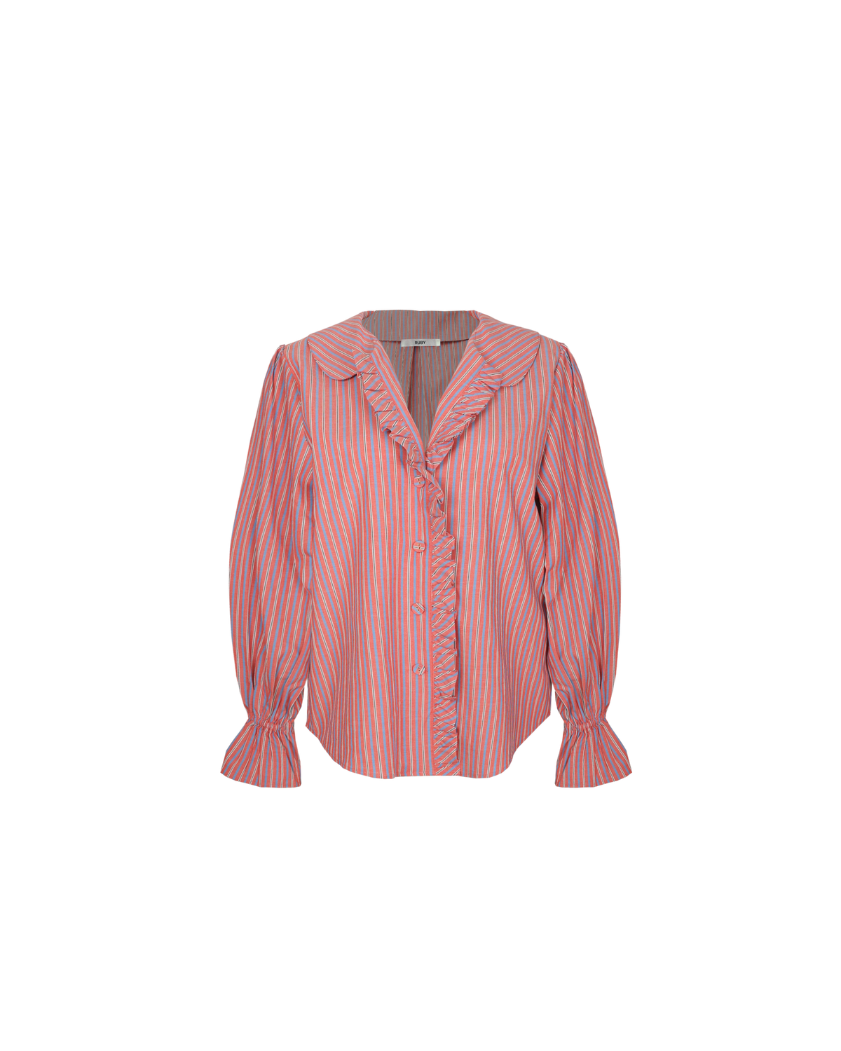 Long sleeve organic cotton shirt designed in our firewhirl blue stripe, with ruffles down the placket and a rounded collar, that are complimented by elasticated ruffle cuffs. This piece is an elevated take on the classic shirt shape.