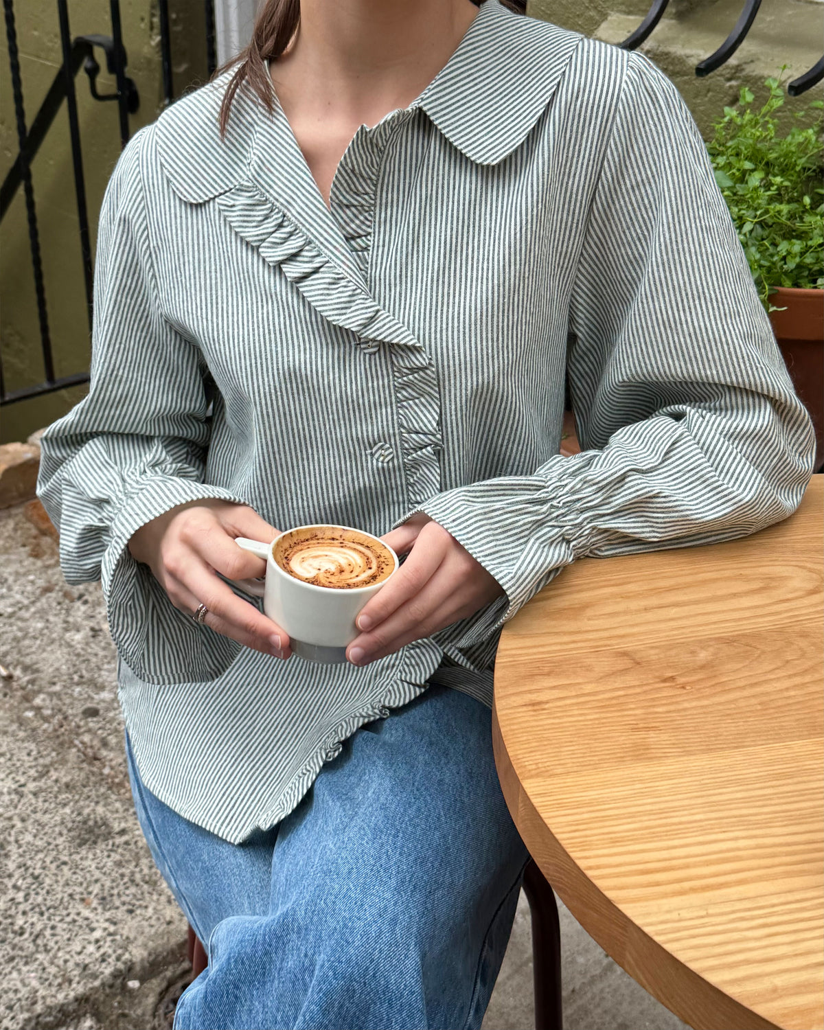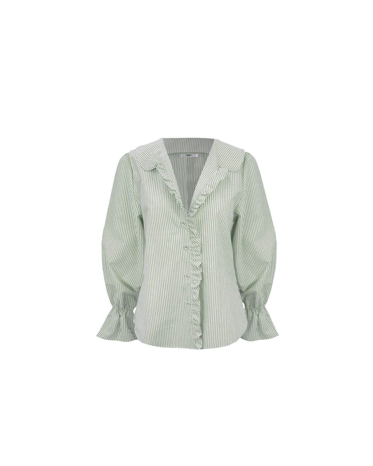 Long sleeve khaki striped shirt with ruffles down the placket and a rounded collar. This top features elasticated ruffle cuffs, this piece is an elevated take on the classic shirt shape.