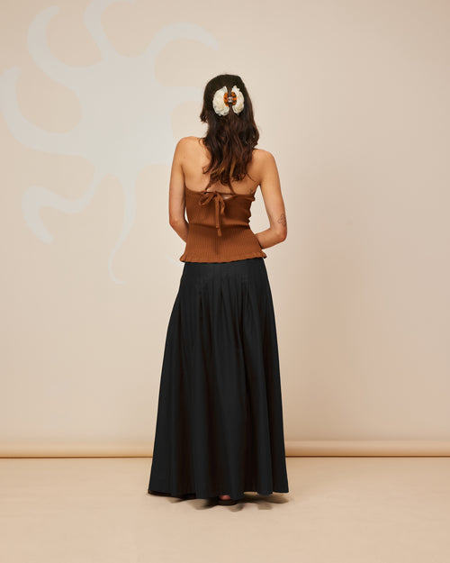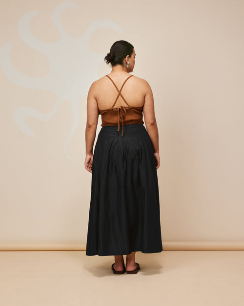 Tennis style maxi skirt with a pleated drop waist. Designed in a soft, black cotton, this skirt is floaty when you walk and is cool to wear.