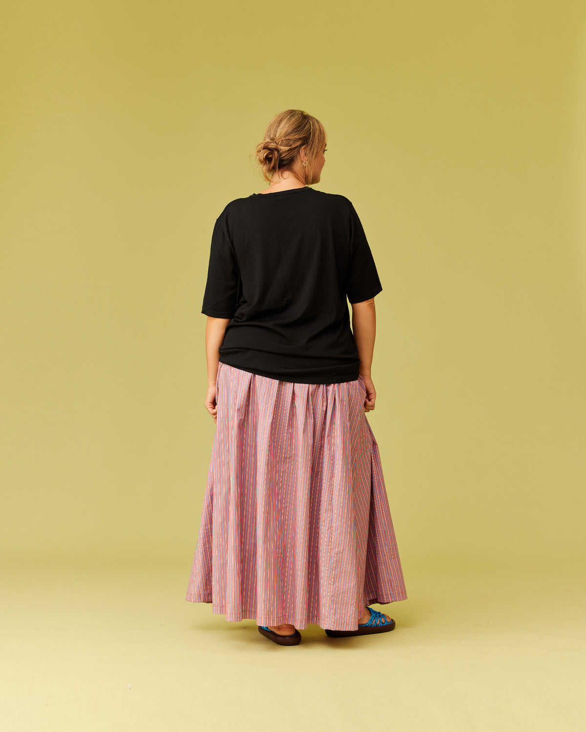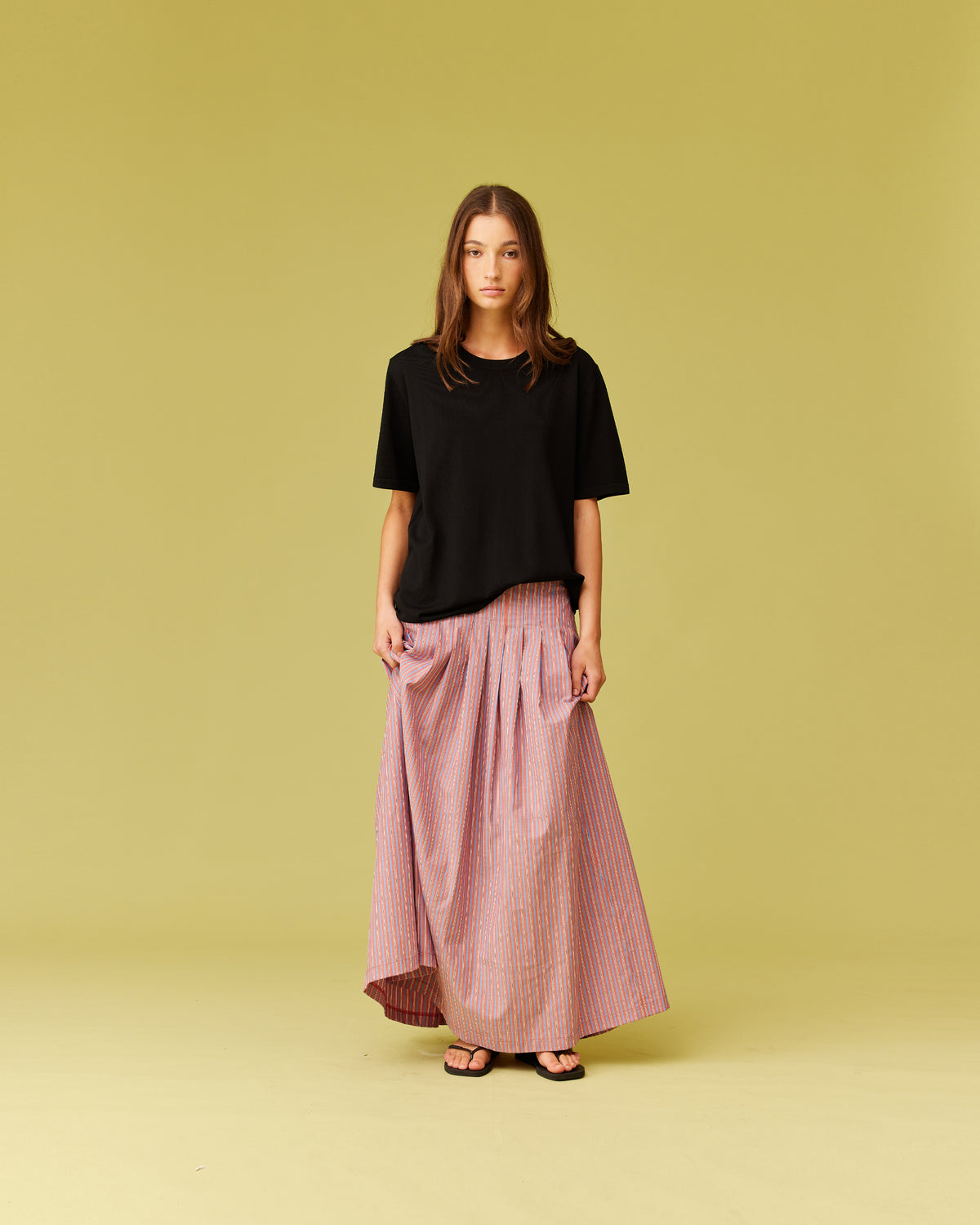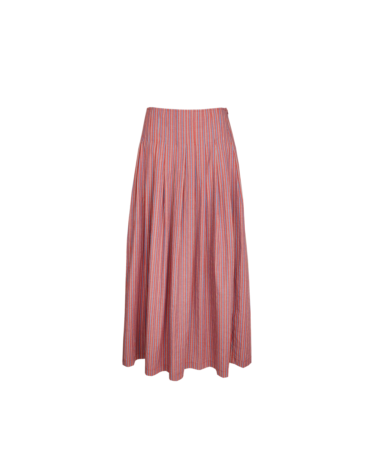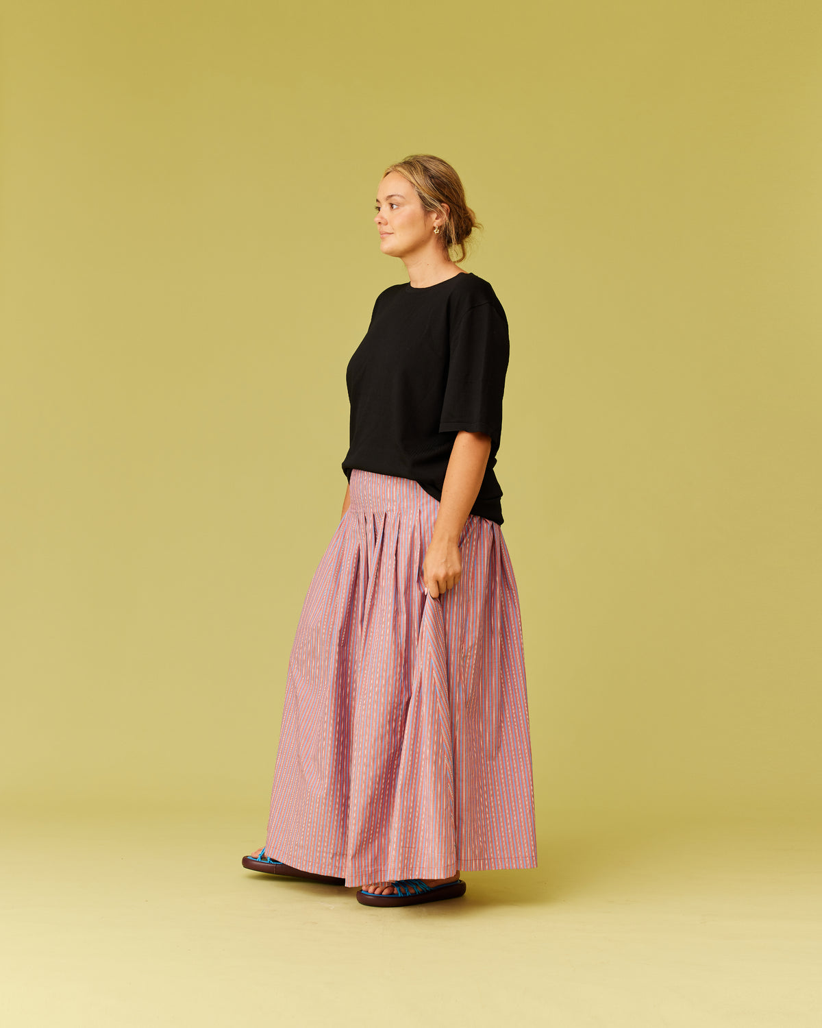 Tennis style maxi skirt with a pleated drop waist. Designed in our firewhirl blue striped cotton, this skirt is floaty when you walk and perfect for any season.
