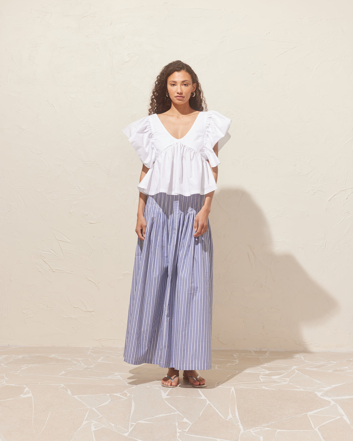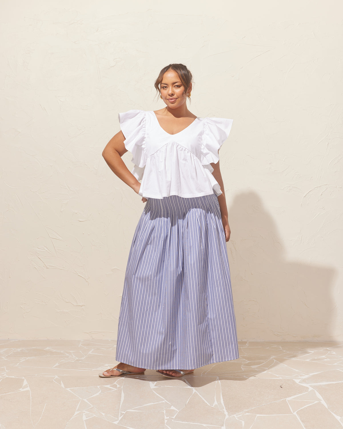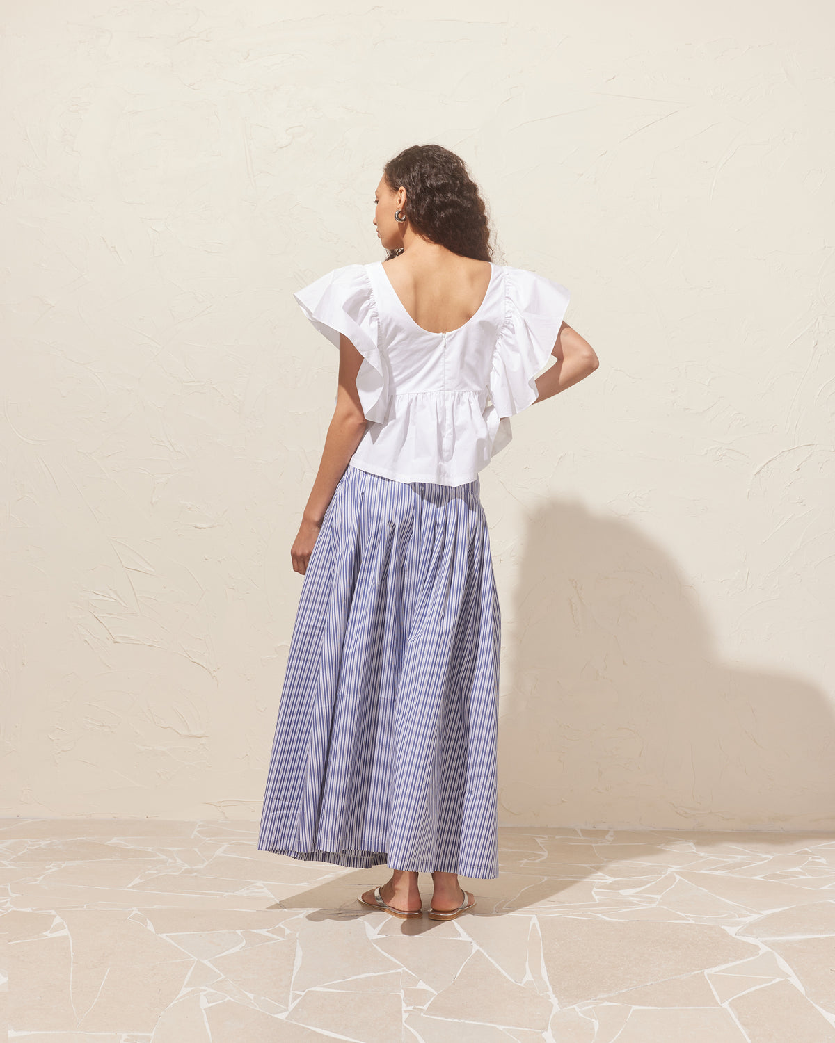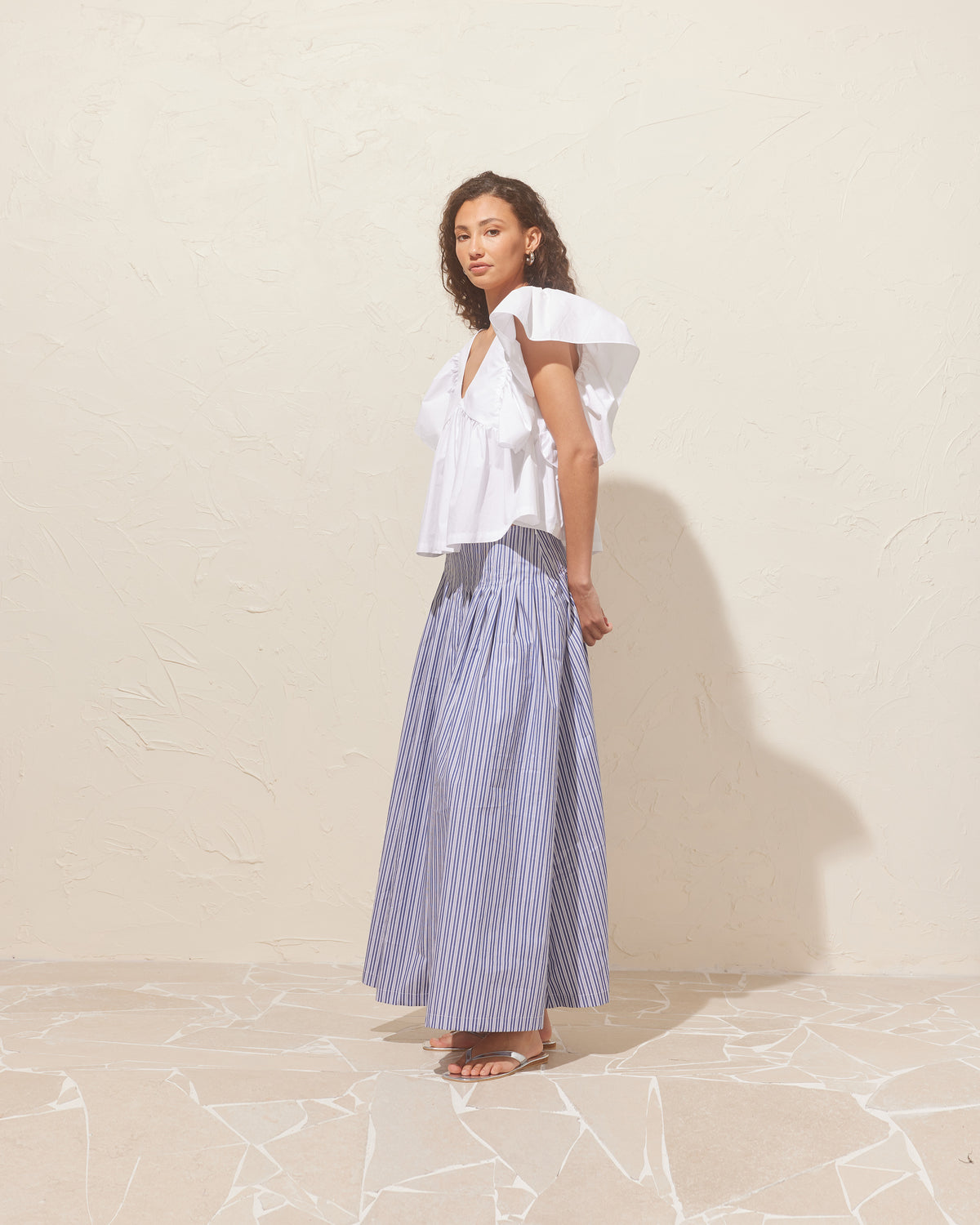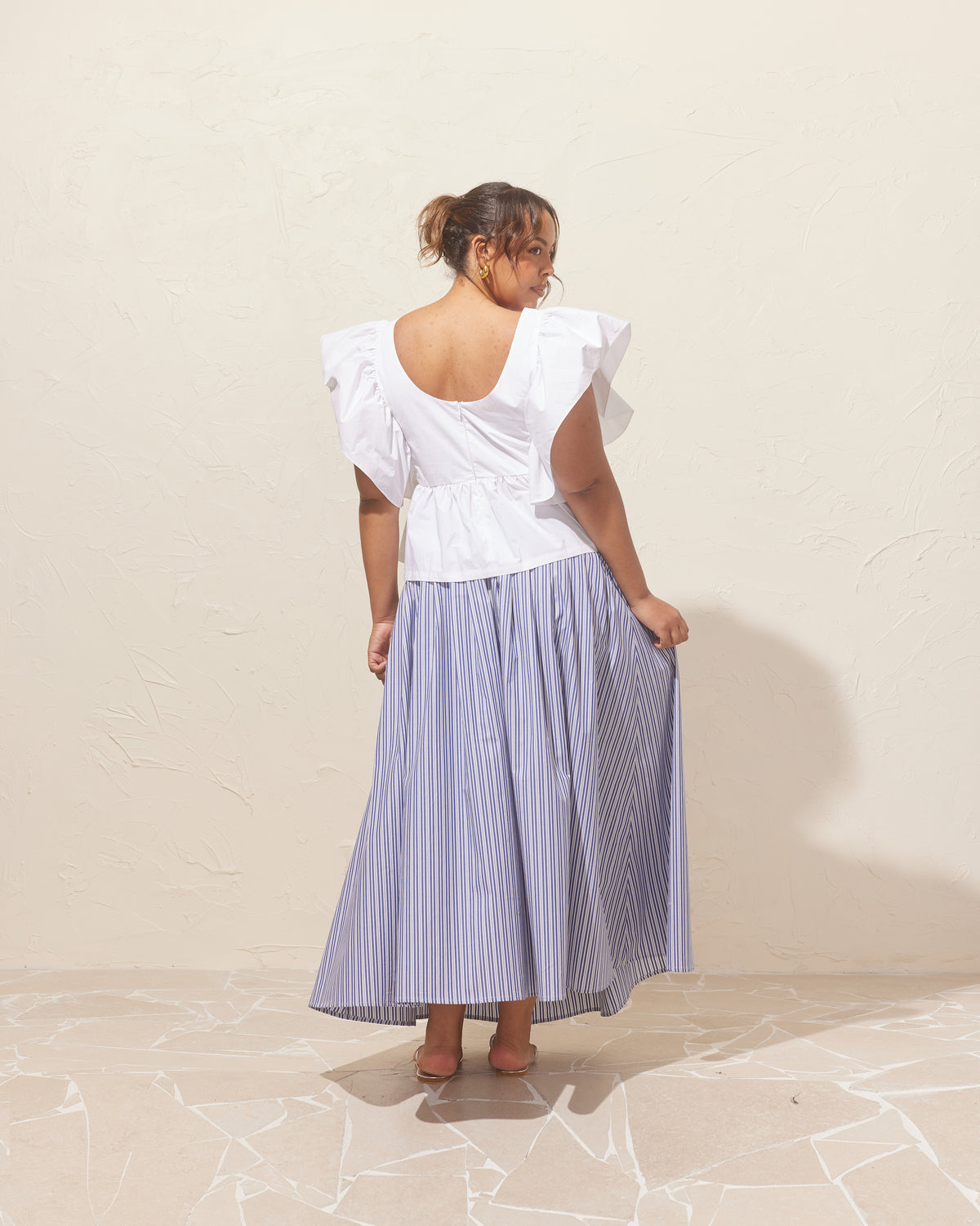 Tennis style maxi skirt with a pleated drop waist. Designed in a navy striped cotton, this skirt is floaty when you walk and is cool to wear.