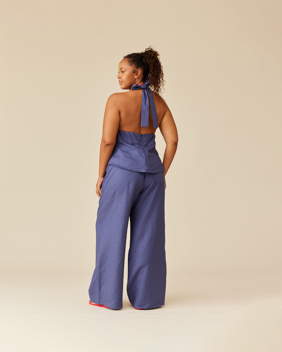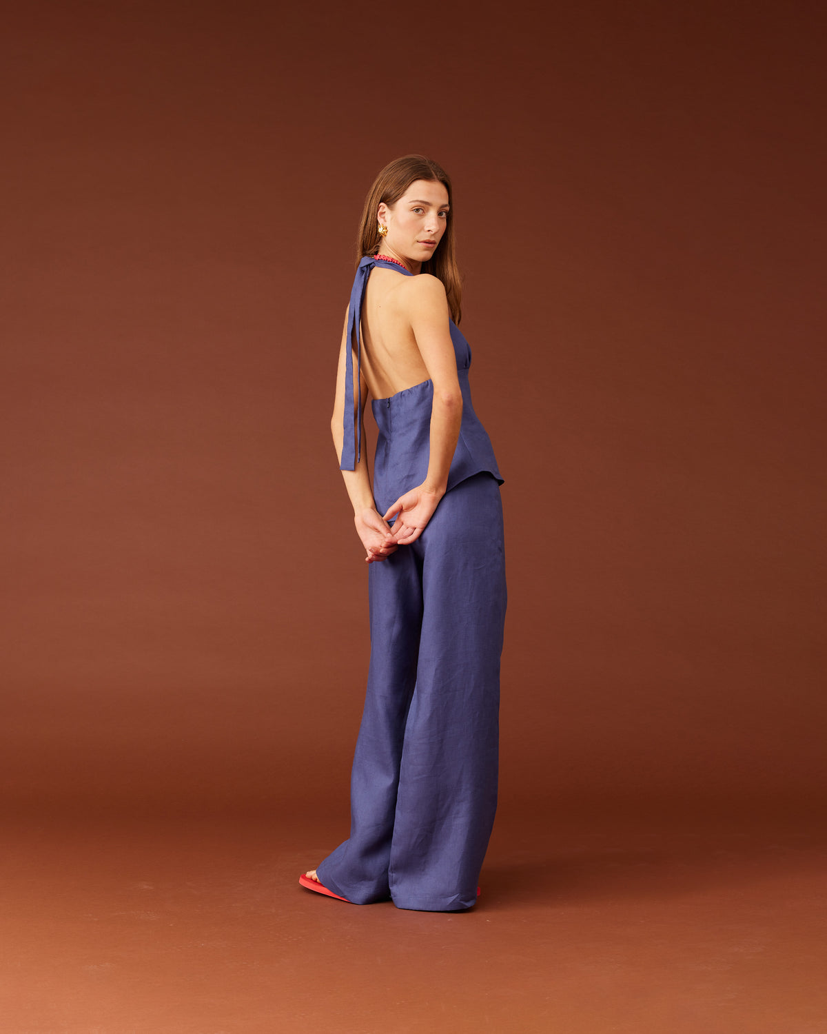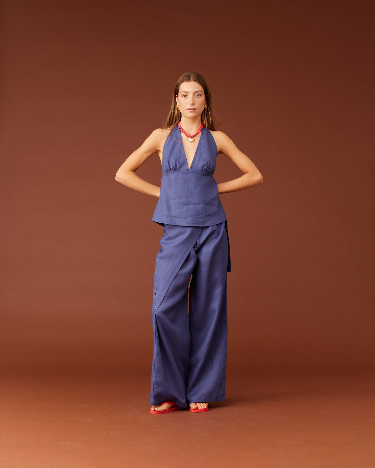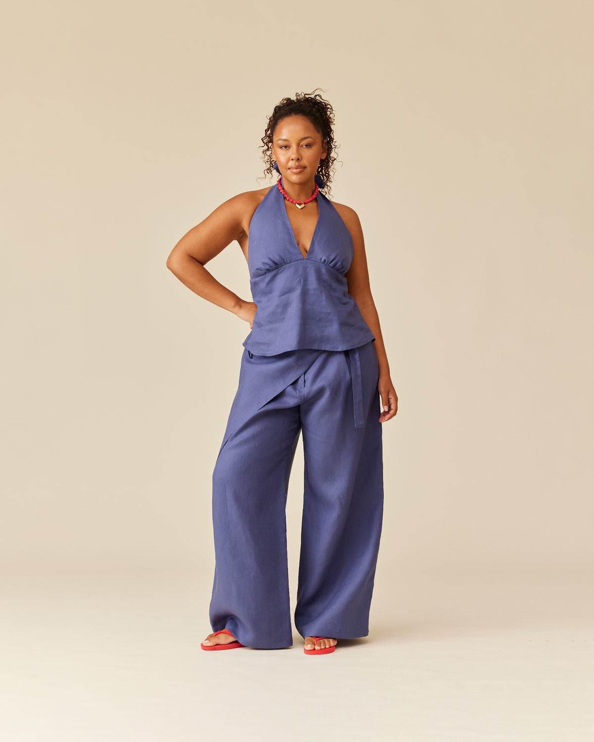 A halter-style top with an open back and ruched detailing, designed in a navy linen. Features a plunging neckline and a slight A-line hem to create shape through the body.Make it a matching moment with our Sasha Linen Wrap Pant.