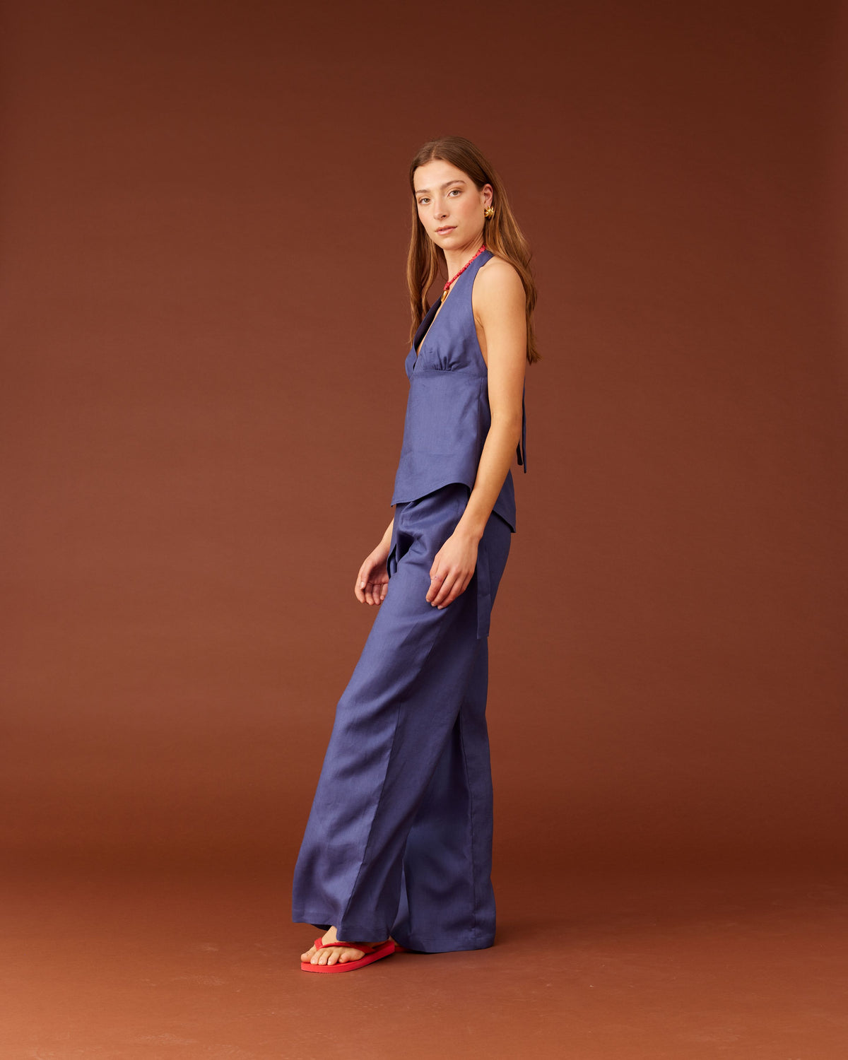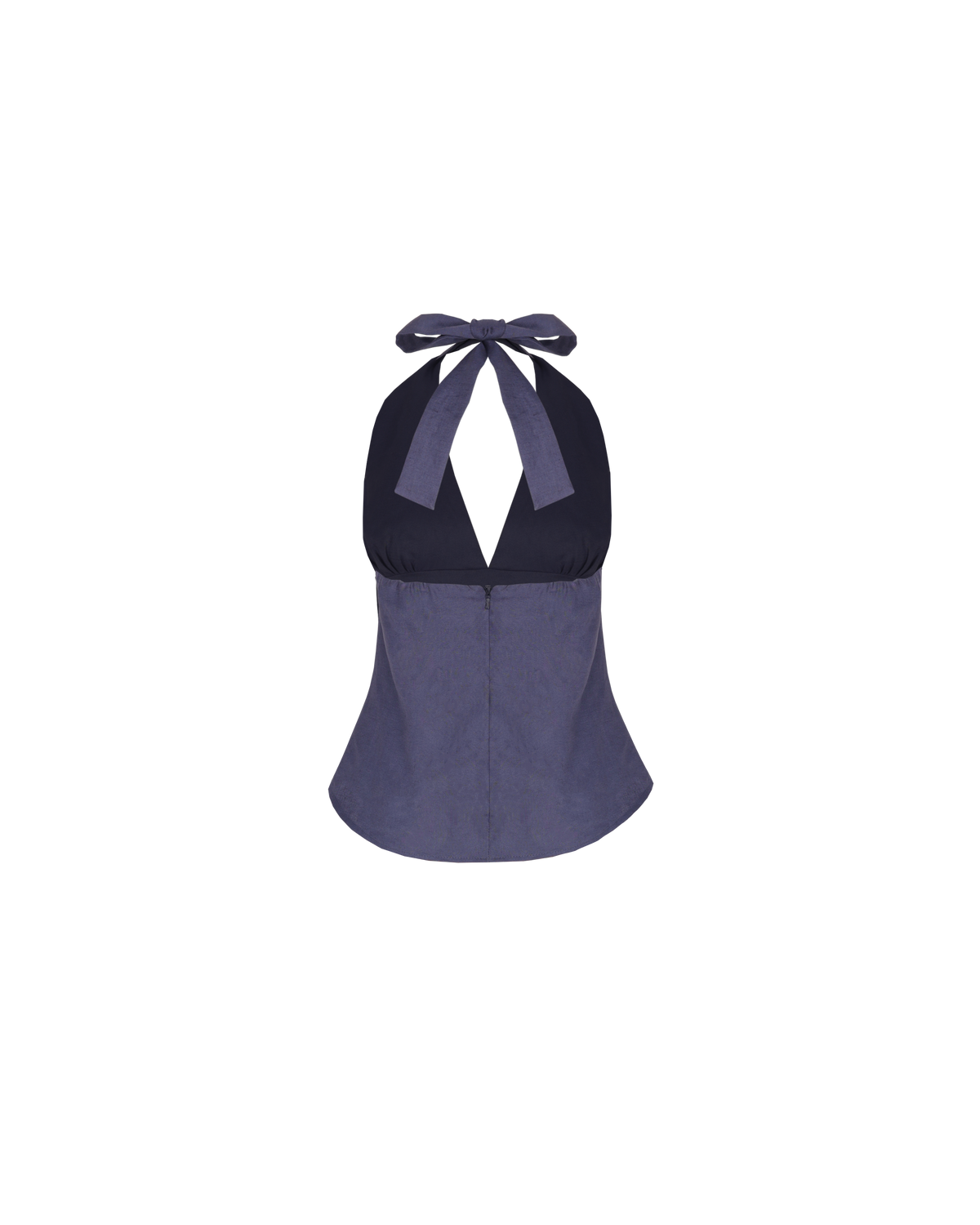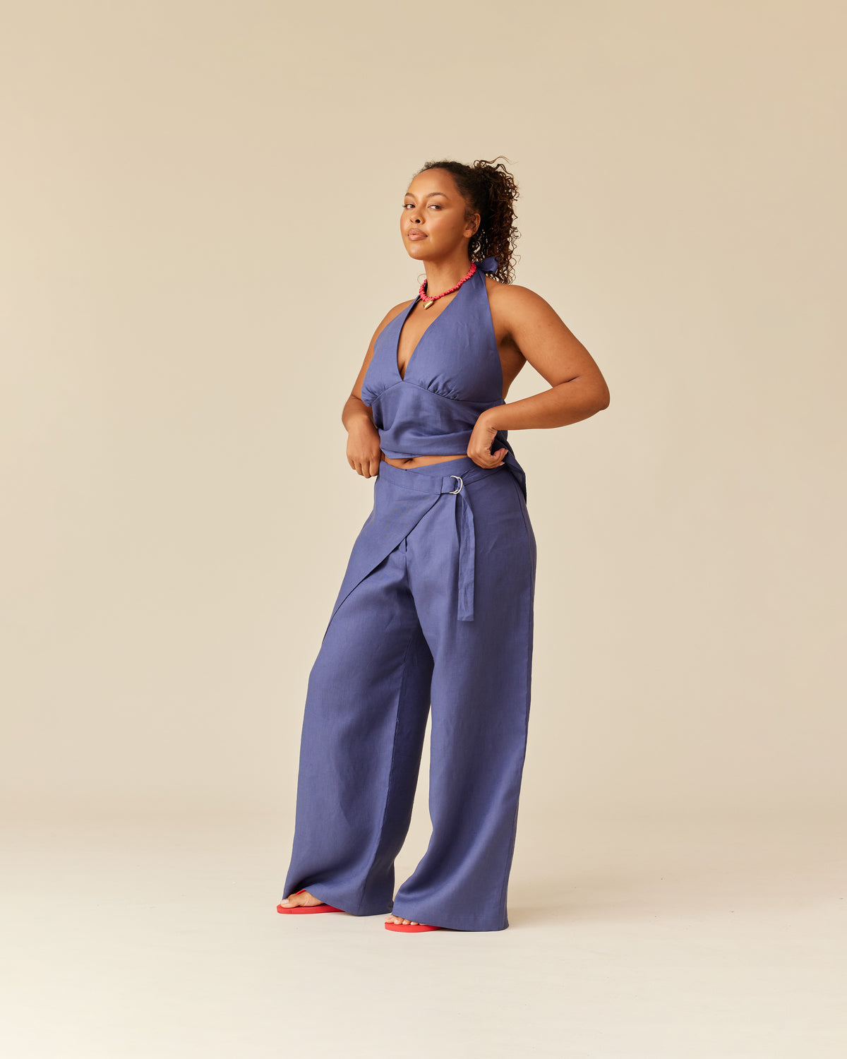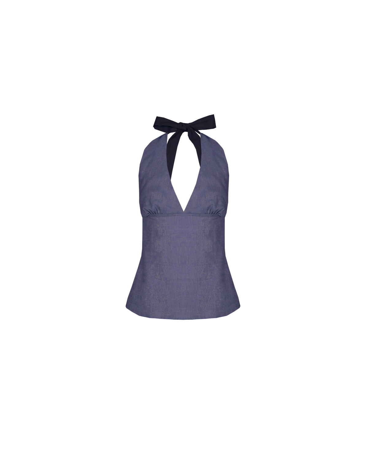 A halter-style top with an open back and ruched detailing, designed in a navy linen. Features a plunging neckline and a slight A-line hem to create shape through the body.Make it a matching moment with our Sasha Linen Wrap Pant.