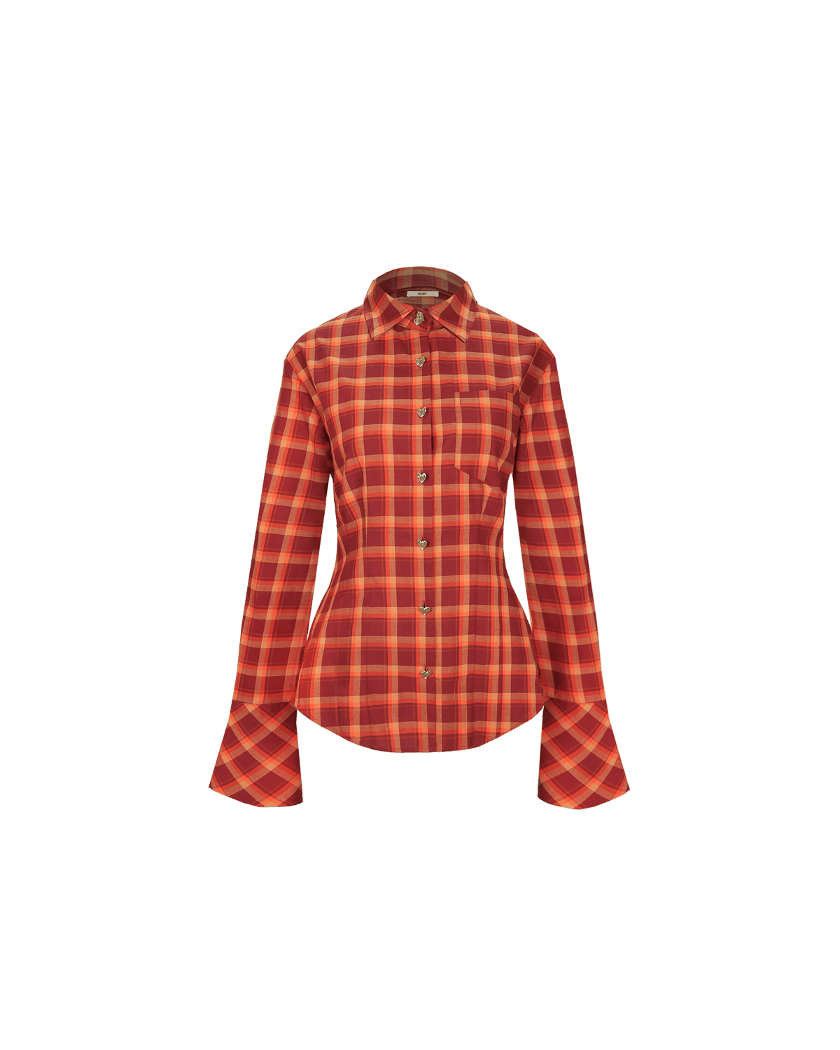 Fitted cotton shirt imagined in our burgundy and orange tartan, with feature heart buttons. This shirt has shaping through the body and flared cuffs to create a structured look, which contrasts with the tartan print.