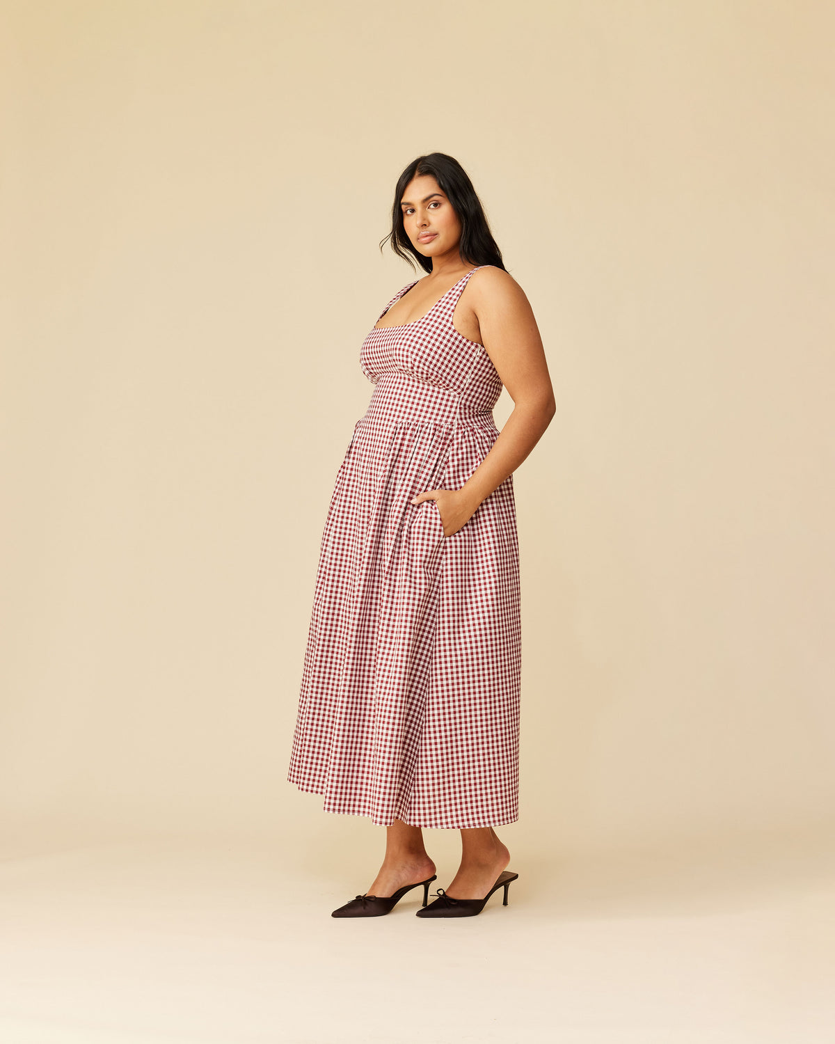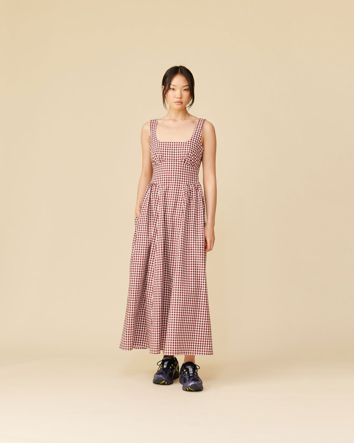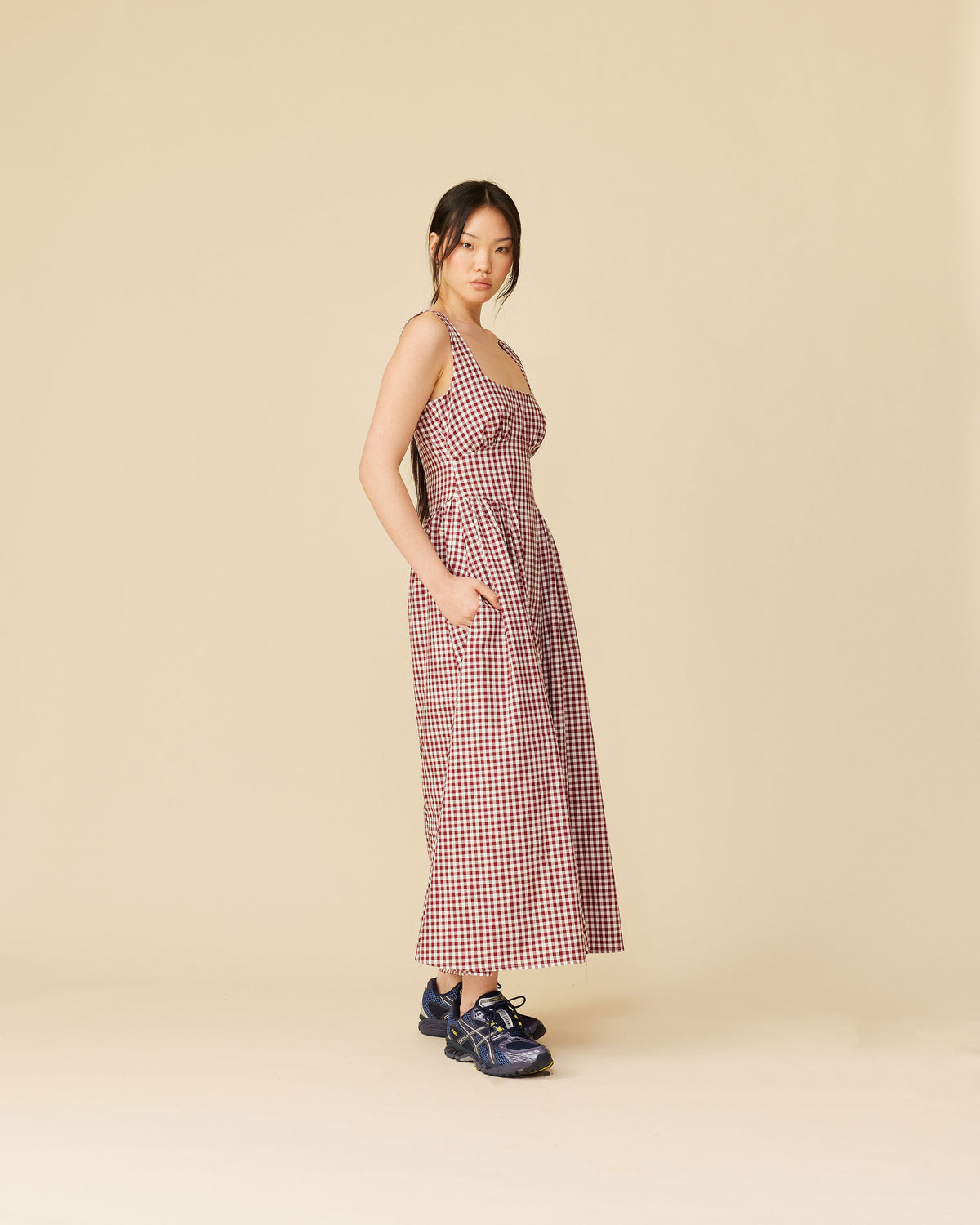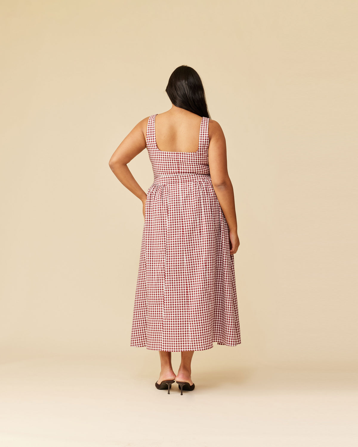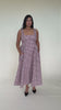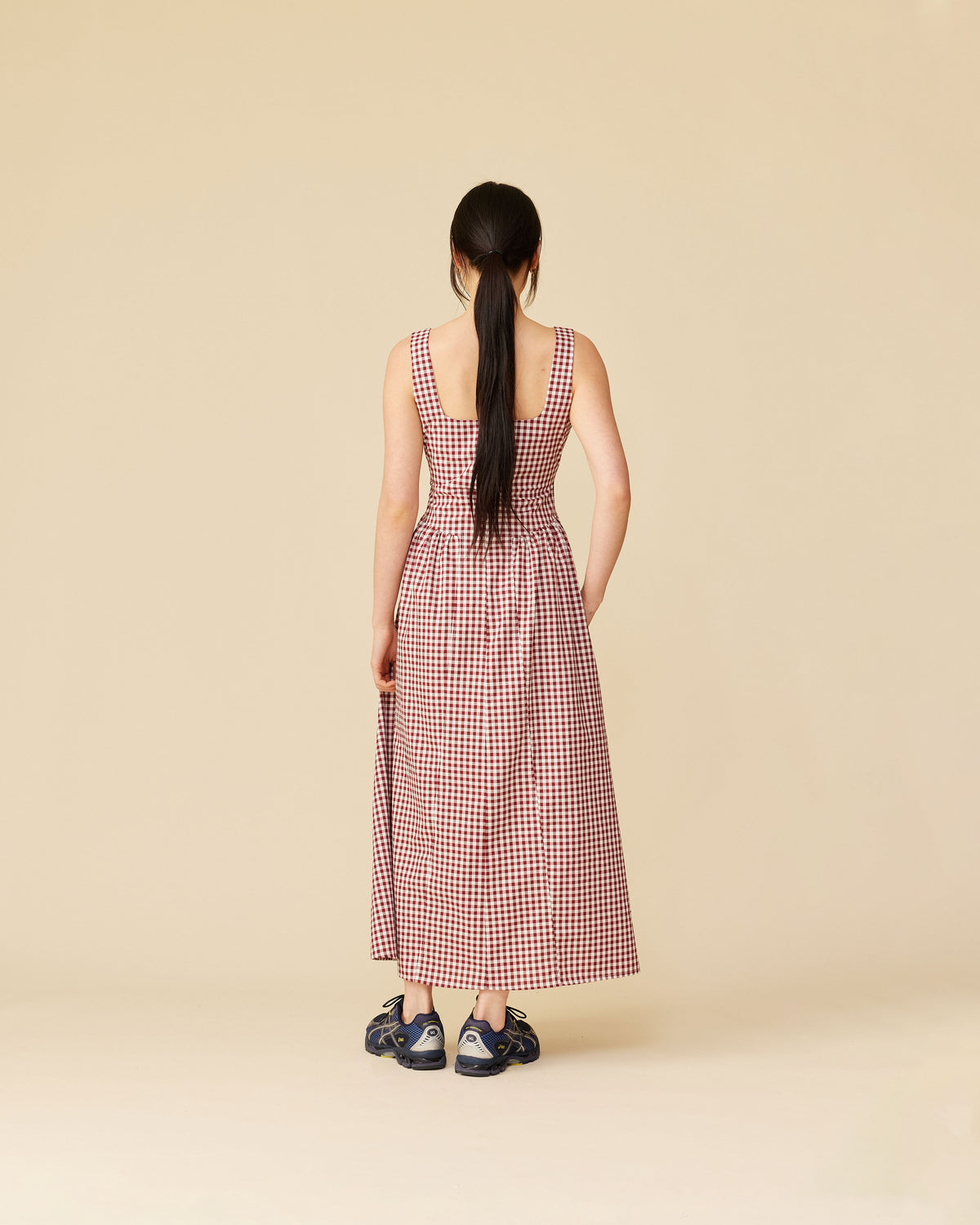 Cotton midi dress with panel details down the front, and gathers at the side seams to create a dropped waist look. Wide-set straps and a square scooped neckline make this easy-to-wear dress whilst looking super chic.
