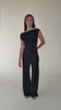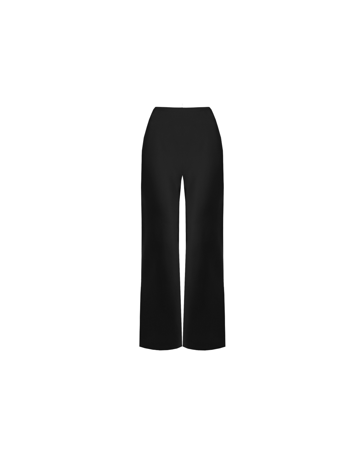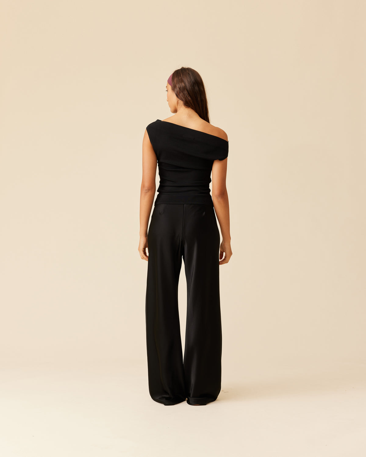 High waisted pant with a straight leg, designed in a luxe black satin. These pants have a facing finish, that creates a clean, no-waistband look.